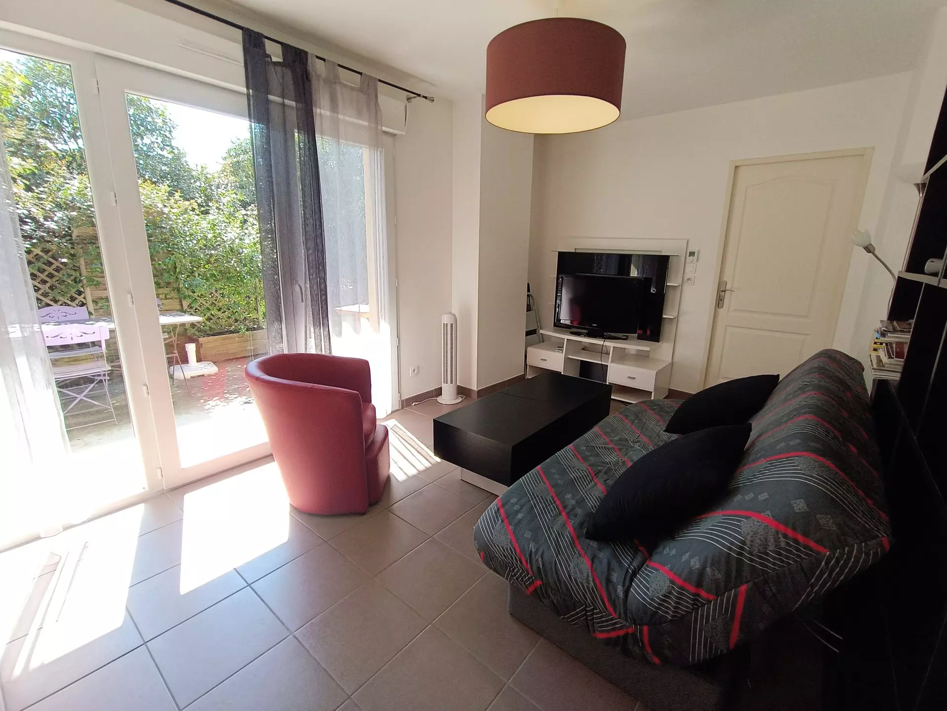 Living room (tiled): 1 sofa bed 140cm, 1 club armchair, 1 flat screen television, 1 coffee table