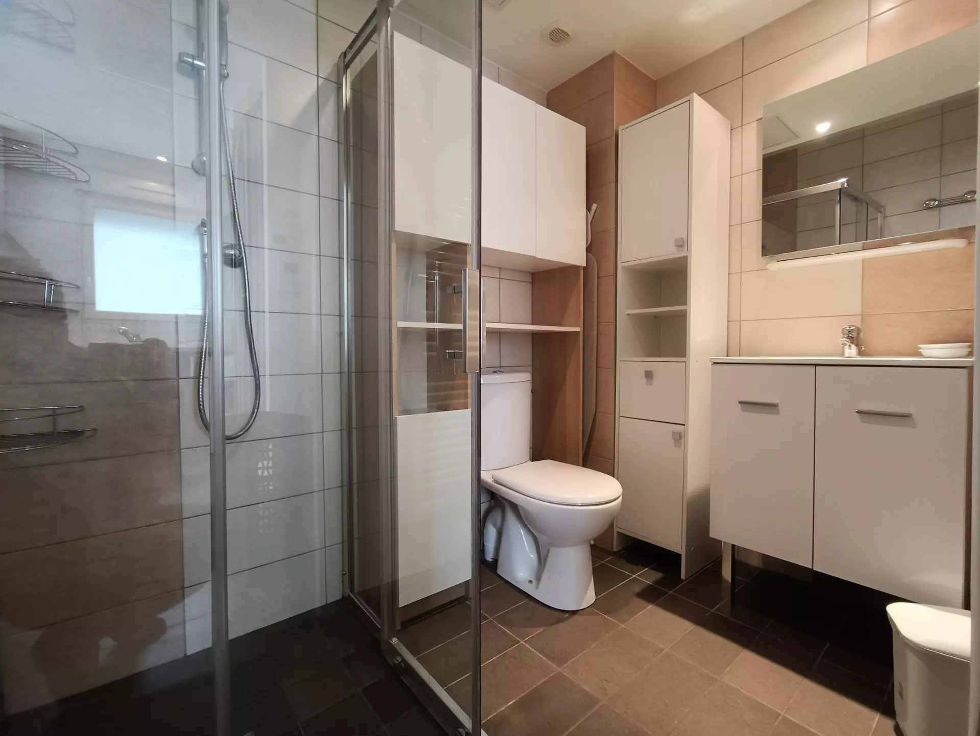 Shower room (tiled): shower, sink, electric towel dryer, WC, storage unit