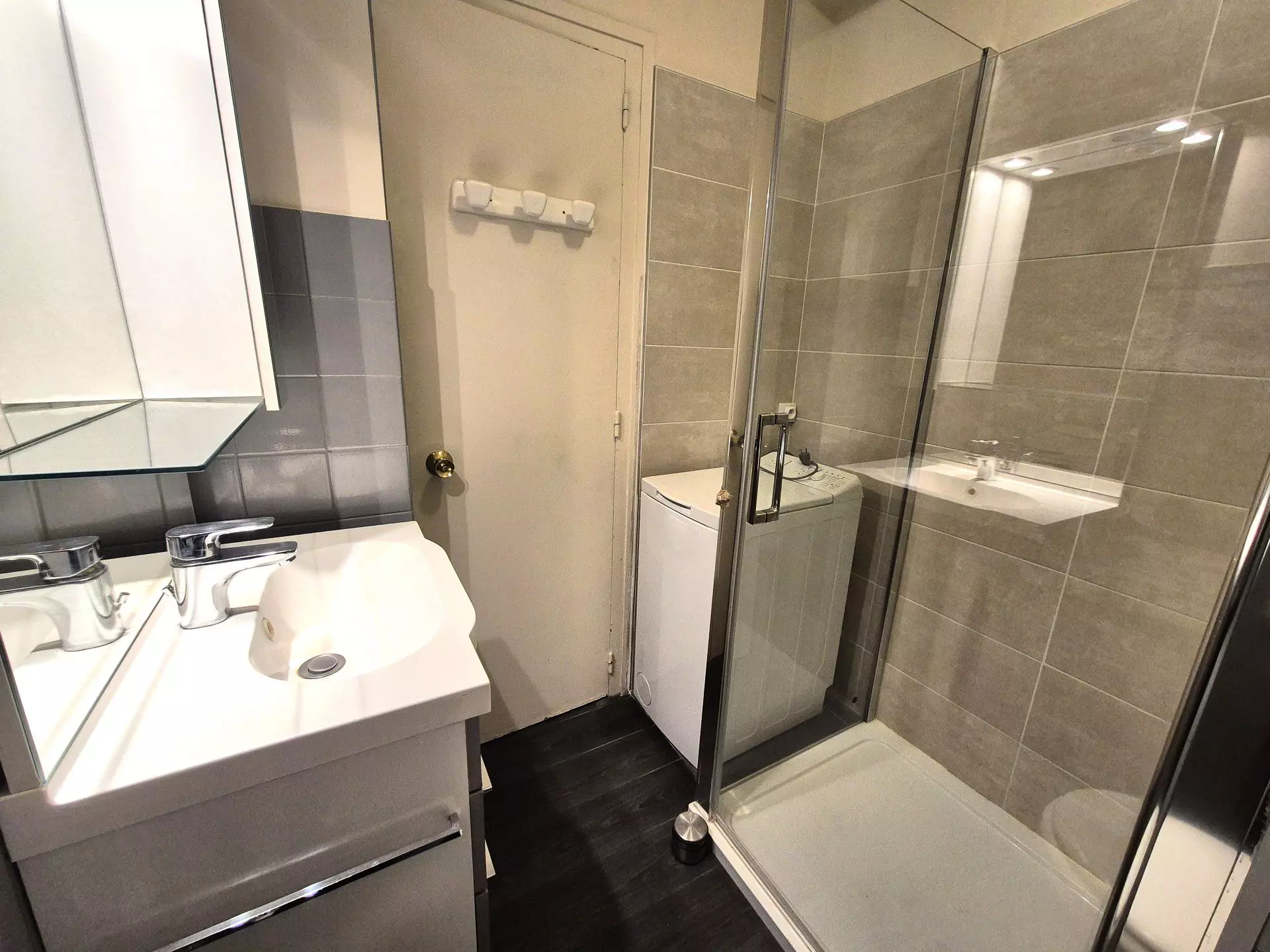 Shower room (tiled floor): shower cubicle, vanity unit, washing machine, WC