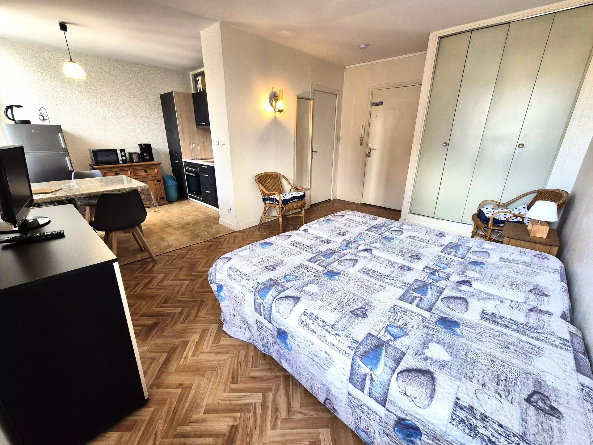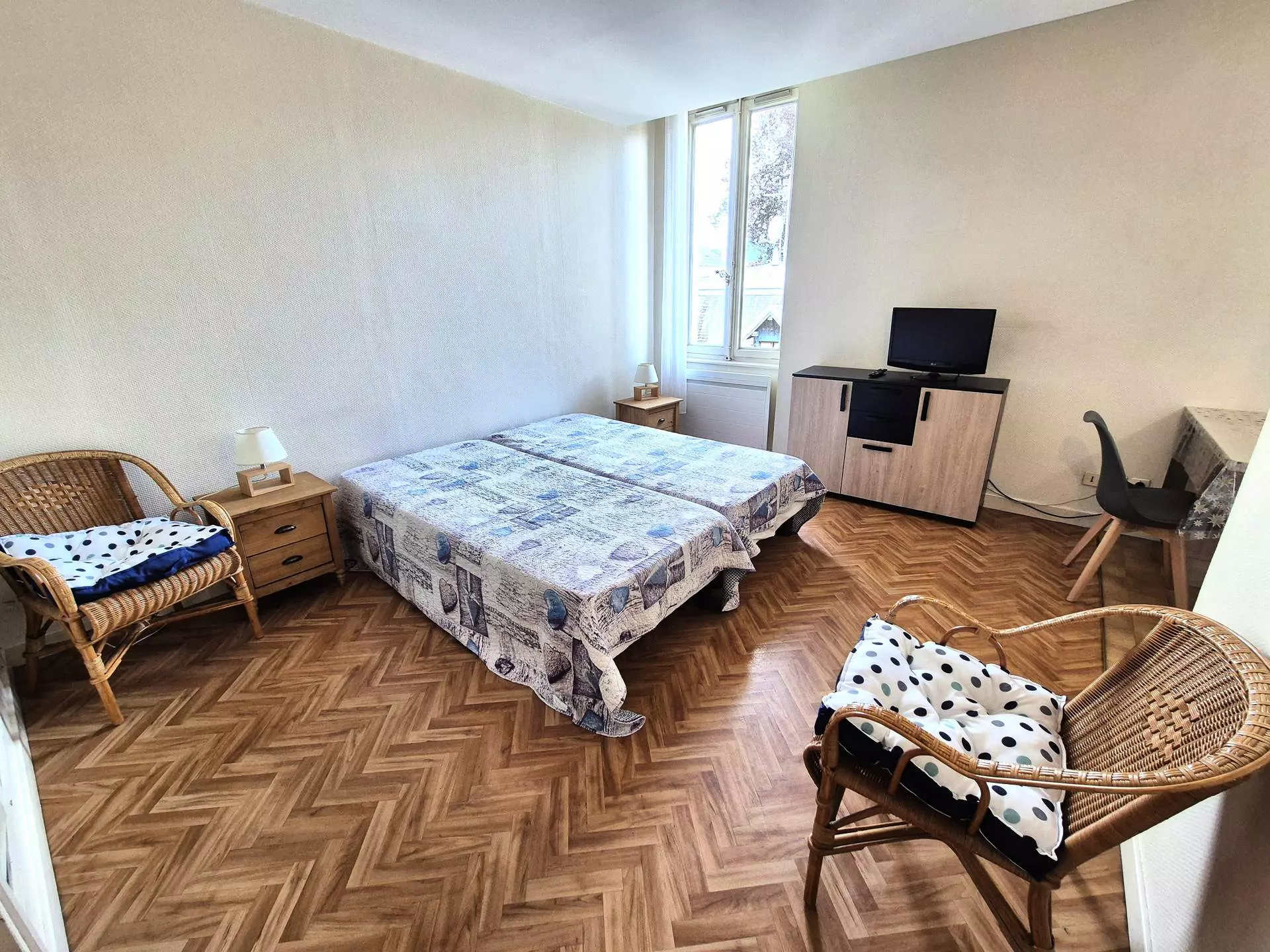 Main room (PVC floor) window: 2 90 cm beds, 1 bedside table, 2 rattan armchairs, 1 table, 2 chairs, 1 chest of drawers, 1 small low sideboard, 1 large storage cupboard, LCD television
