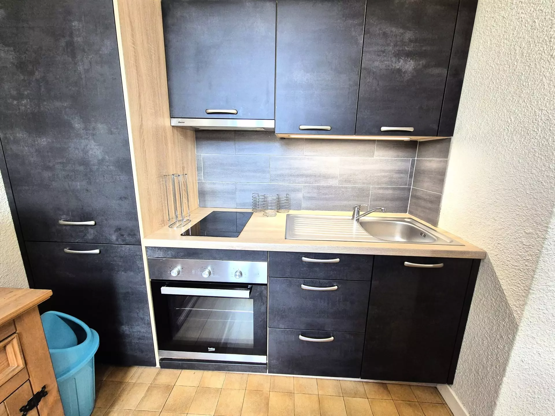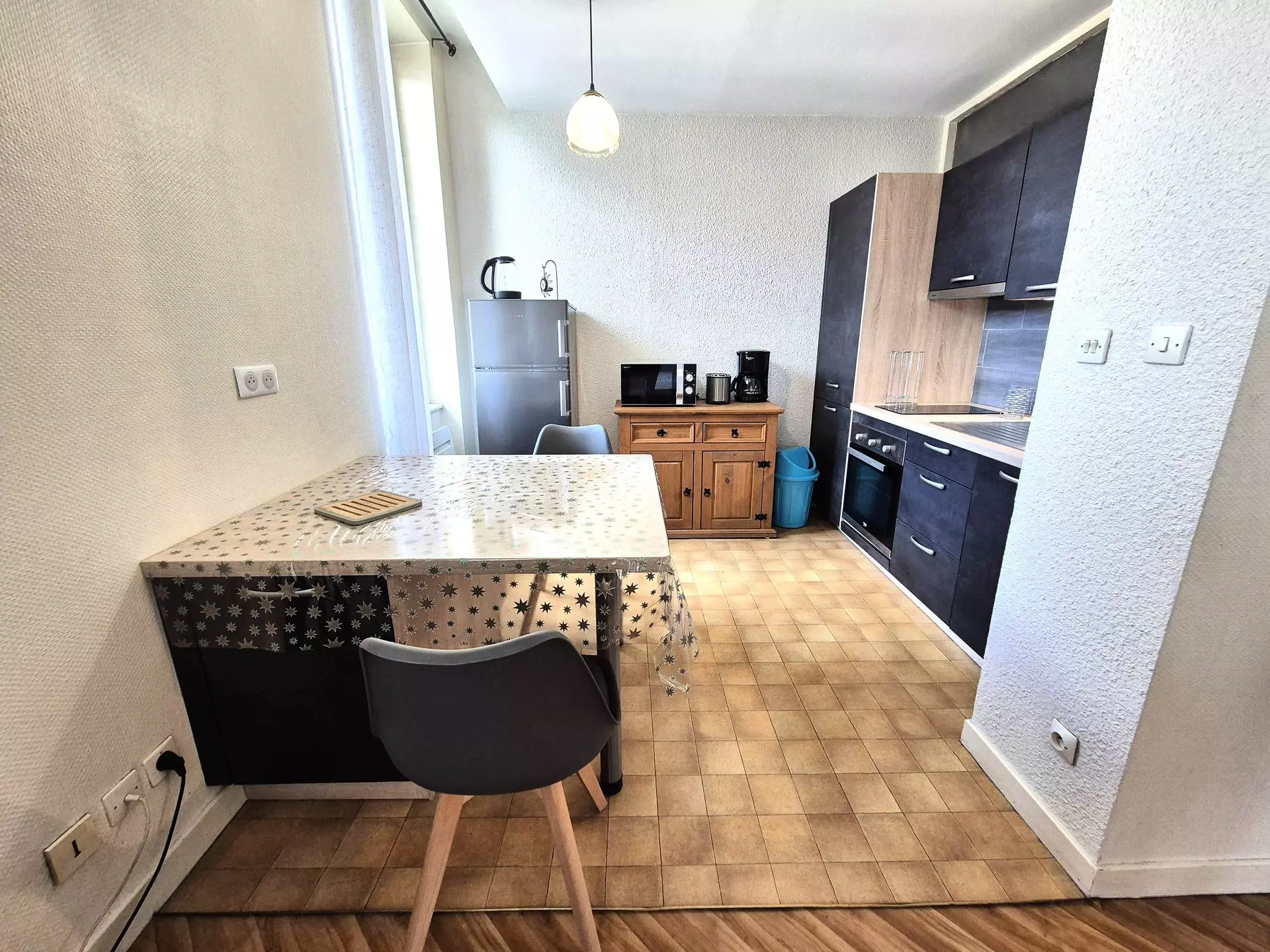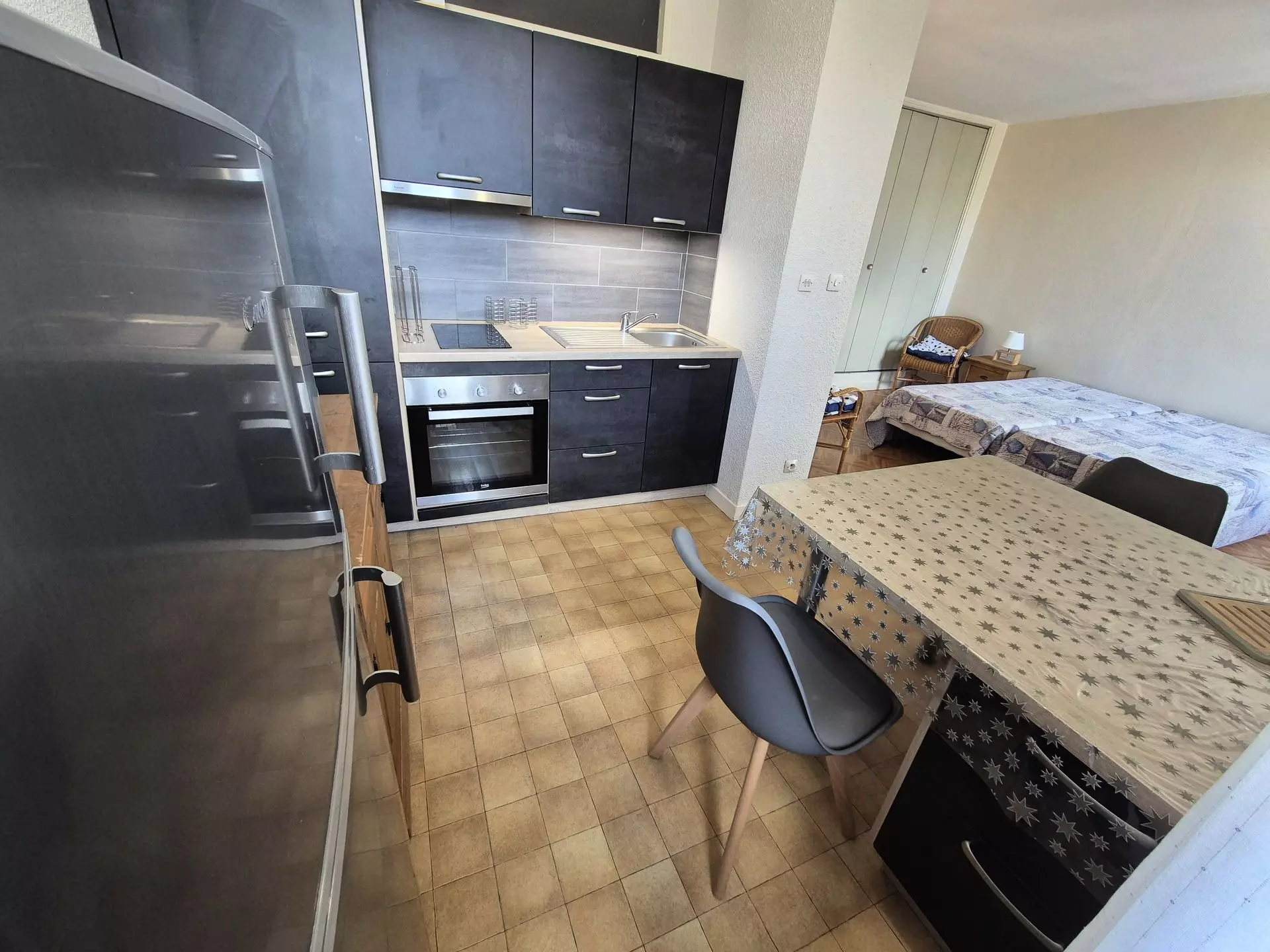 Fully equipped kitchen open to living room (window): 2 ceramic hobs, electric oven, sink, refrigerator, freezer, microwave, electric coffee maker, toaster, crockery and cookware.