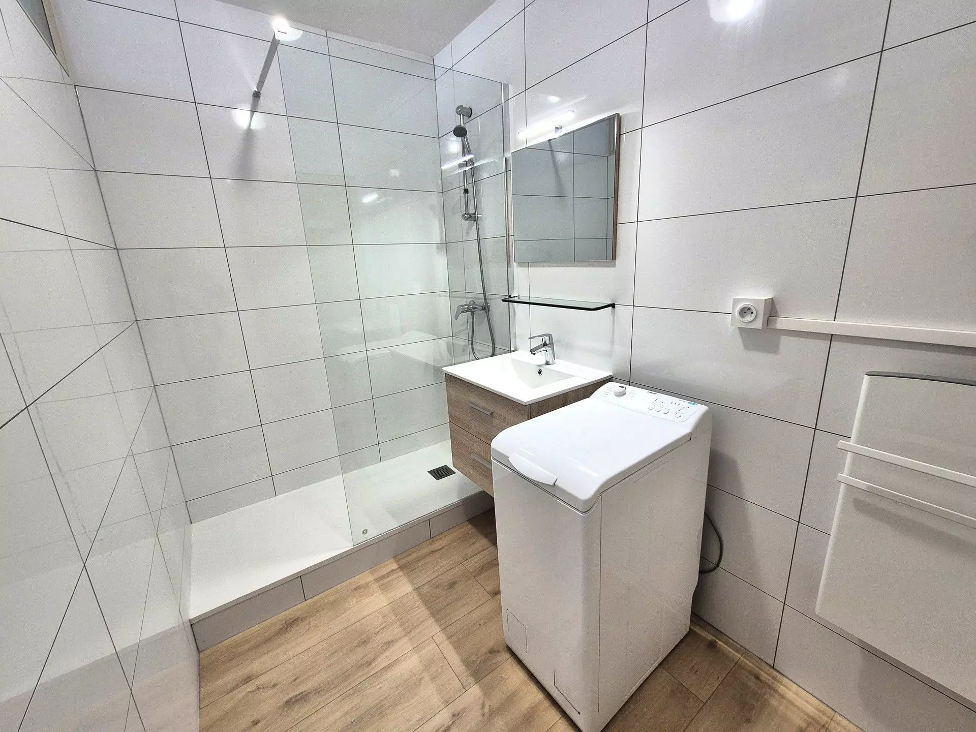 Shower room (PVC floor): shower, vanity unit, WC, washing machine, electric towel dryer.