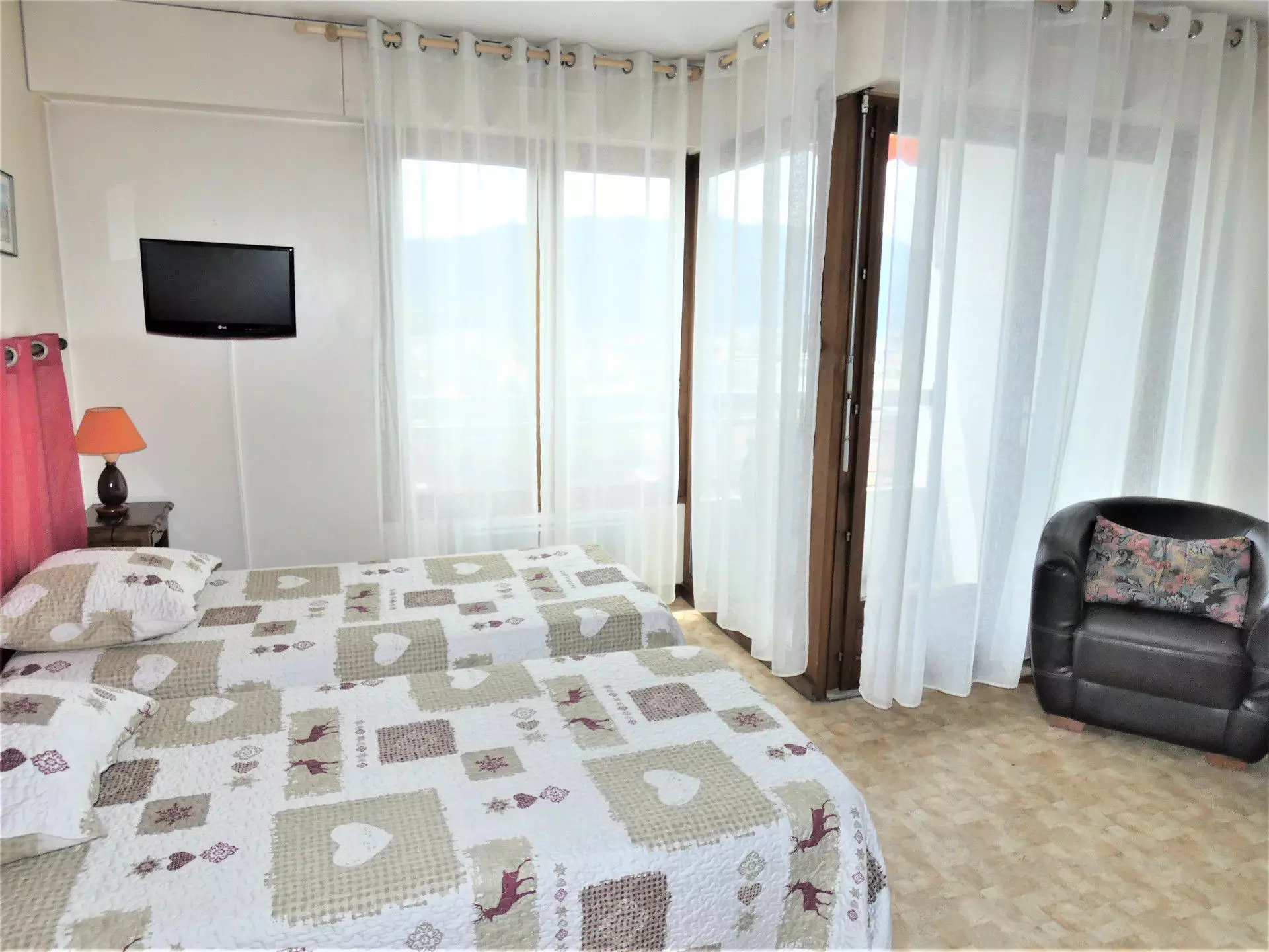 Main room (PVC floor): 2 x 90 cm beds, 1 table, 4 chairs, 2 armchairs, 1 wall-mounted flat-screen television.