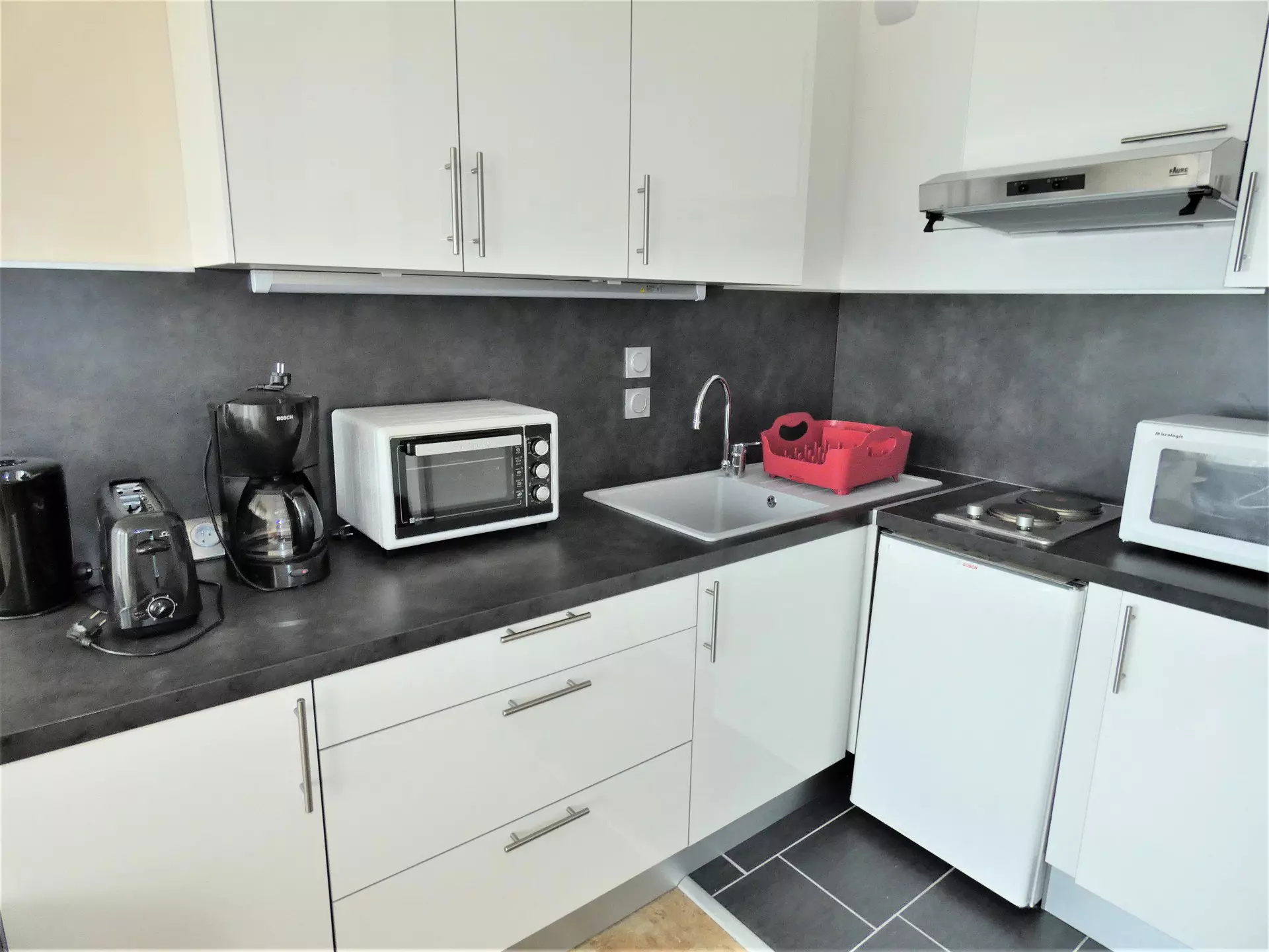 Open kitchen (tiled): 2 electric hobs, sink, fridge/freezer, extractor fan, mini oven, microwave, electric coffee maker, toaster, kettle, crockery and cookware.