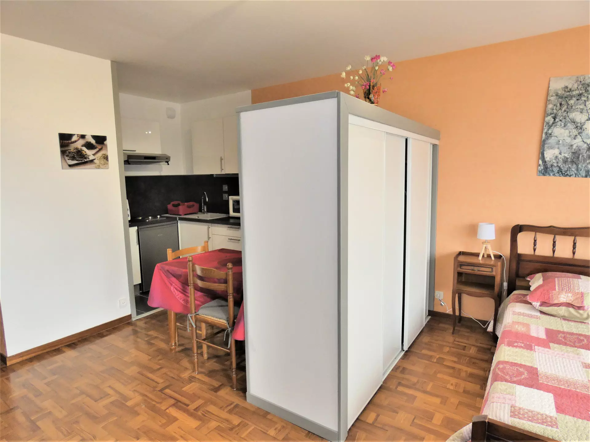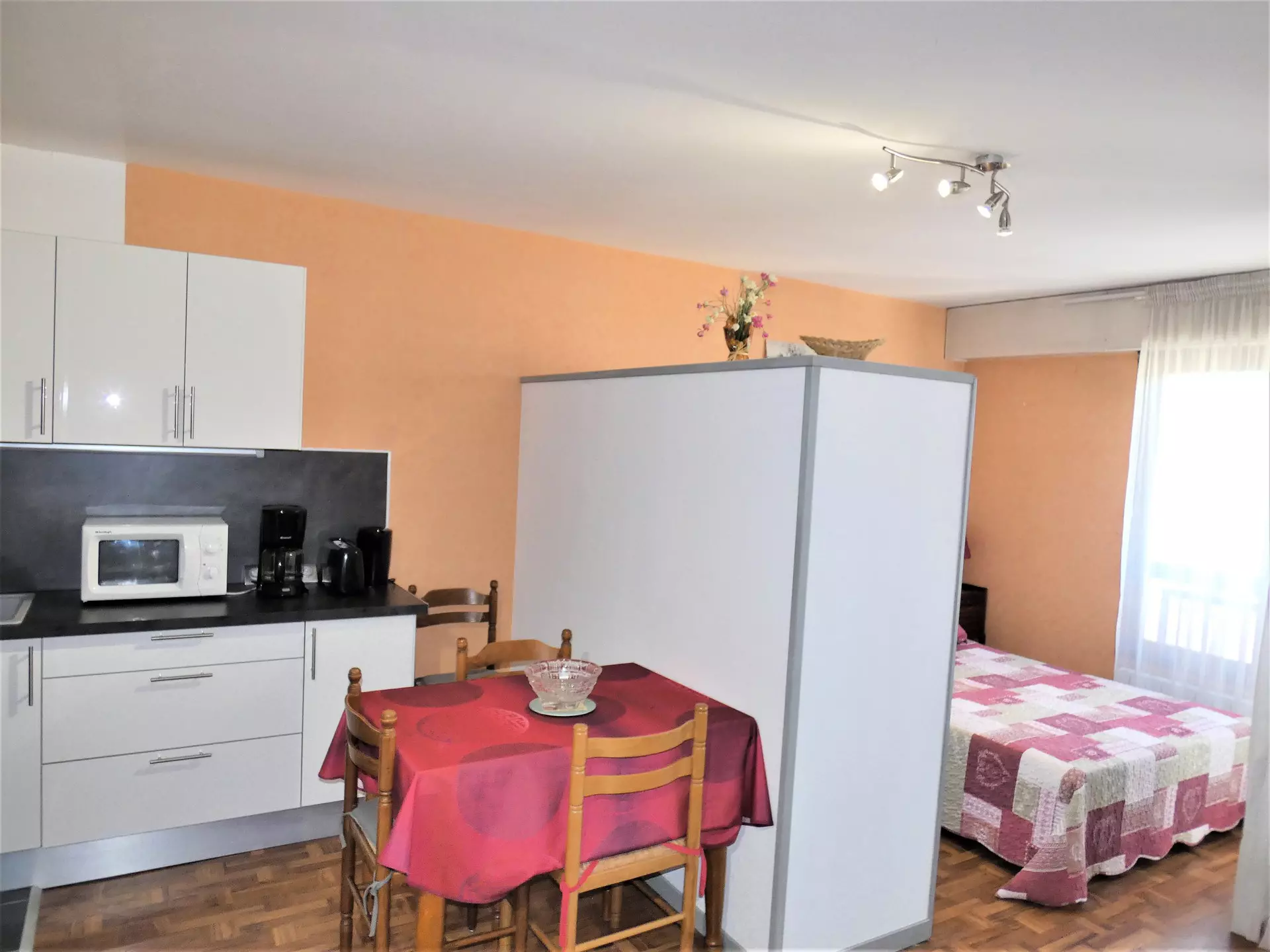 Main room (PVC floor): 1 double bed, 1 table, 2 chairs, 2 armchairs, 1 chest of drawers, 1 flat screen television, 1 wardrobe shelf serving as a separation from the kitchen.