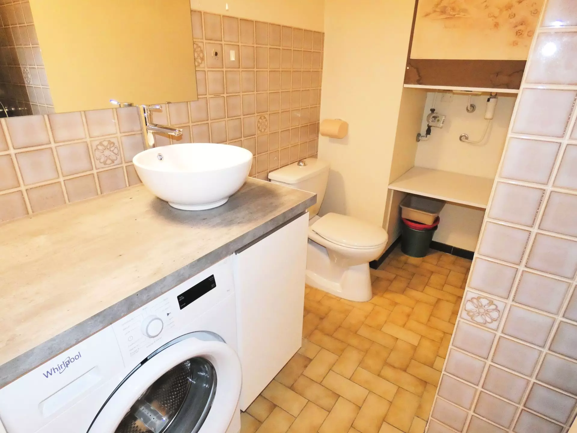Shower room (tiled) with shower (curtain), sink with washing machine and storage, WC.