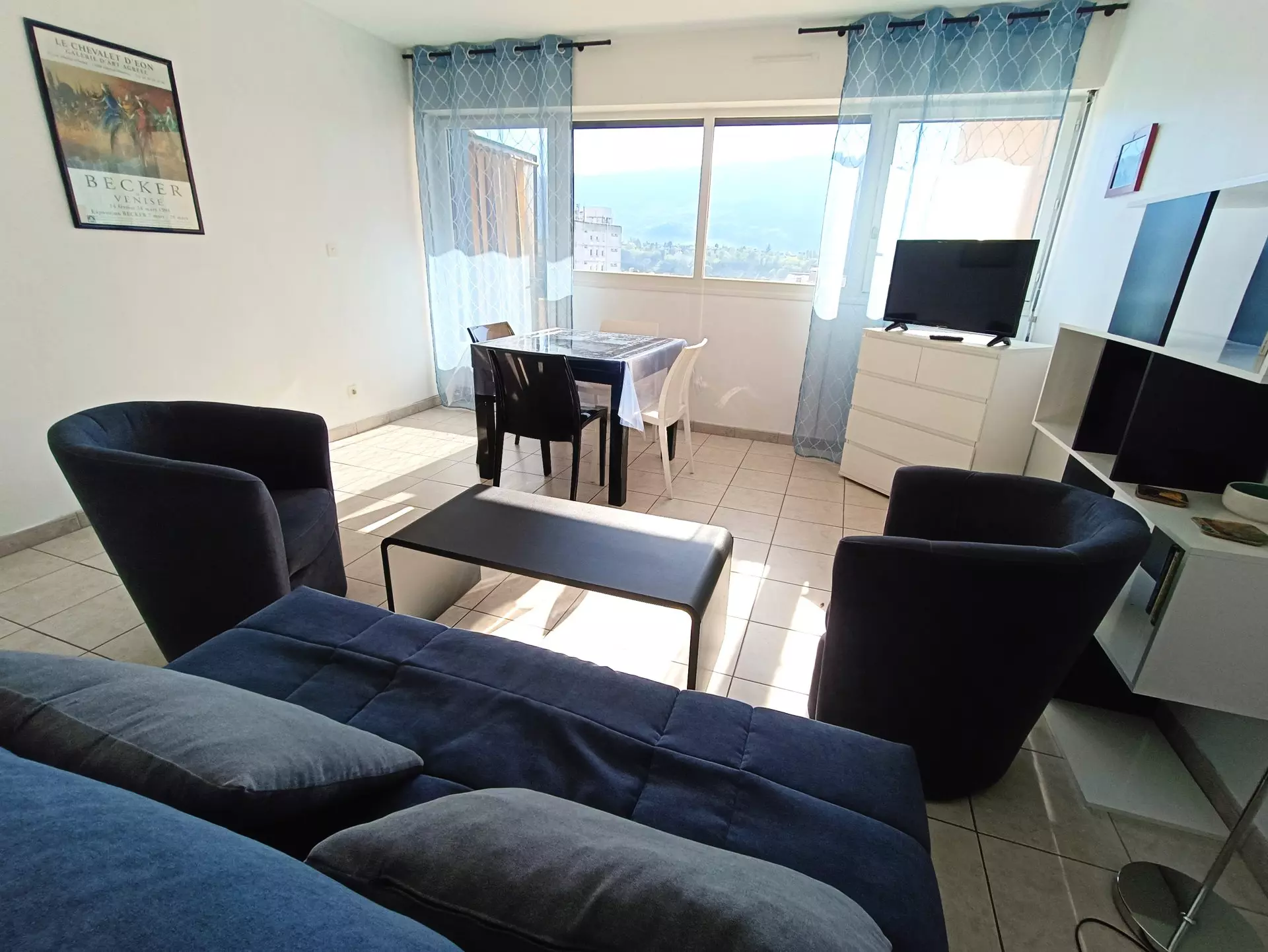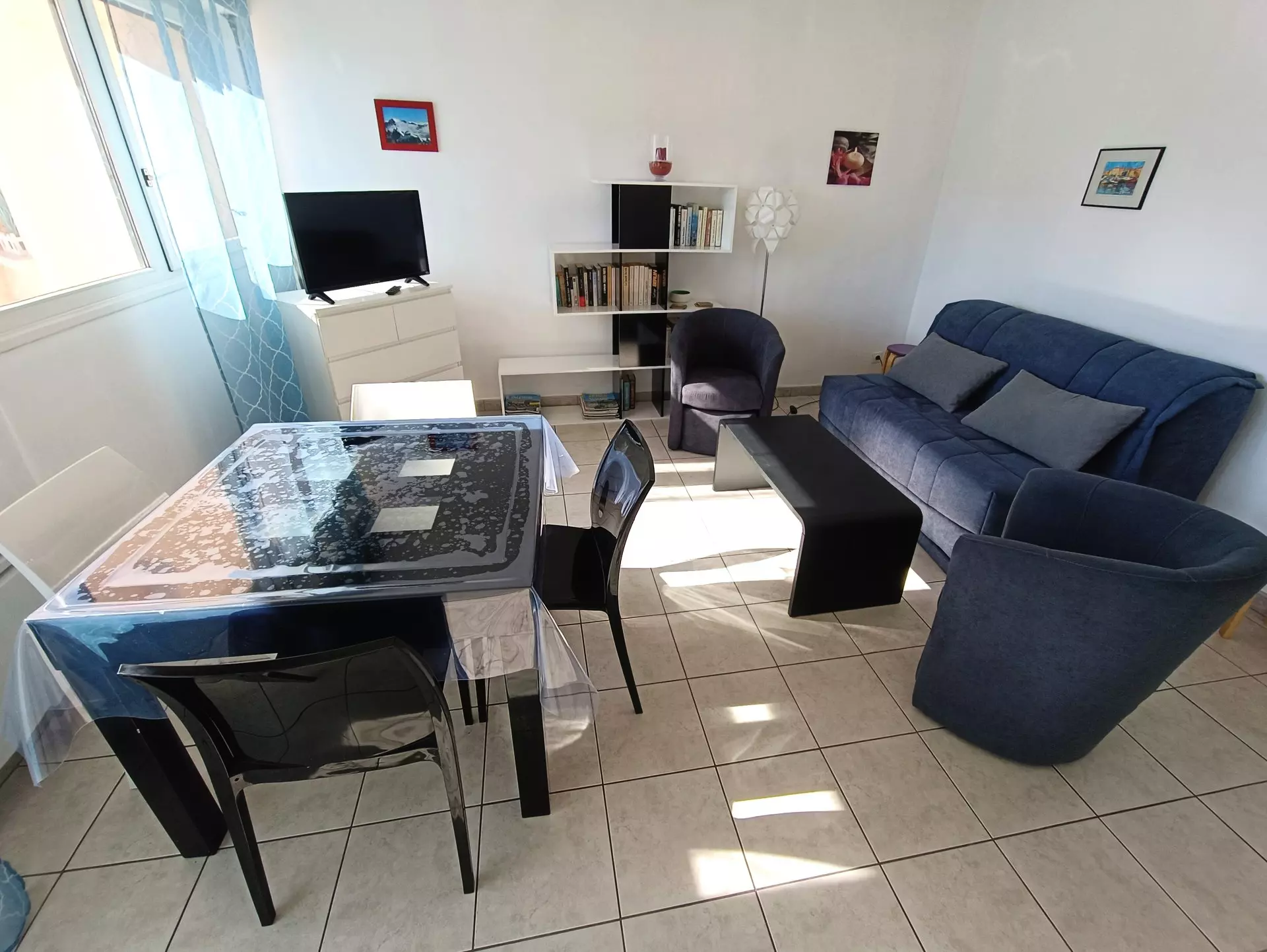 Living room (tiled): 1 table + 4 chairs, 1 sofa bed, 1 coffee table, 1 chest of drawers, 1 shelf, 1 flat screen television, 2 armchairs, 1 TV cabinet.