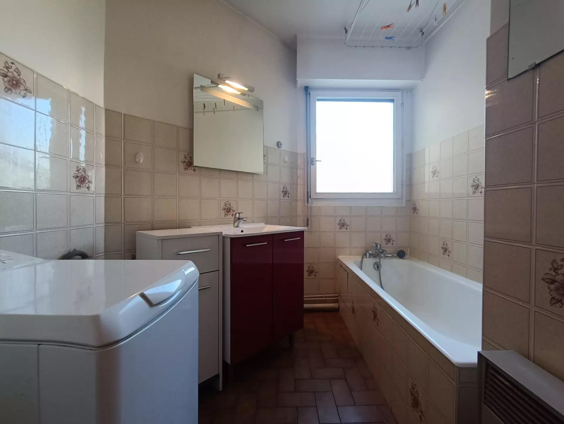 Bathroom (tiled): bathtub, vanity sink, washing machine. Separate WC.