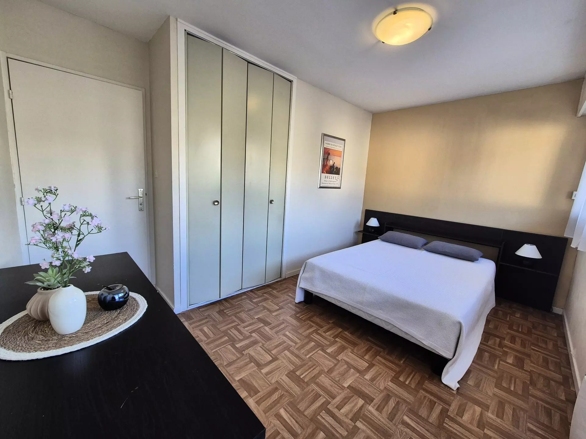 Bedroom (PVC floor) with East window: 1 x 140 cm bed, built-in bedside tables, 1 chest of drawers, 1 wall-mounted wardrobe