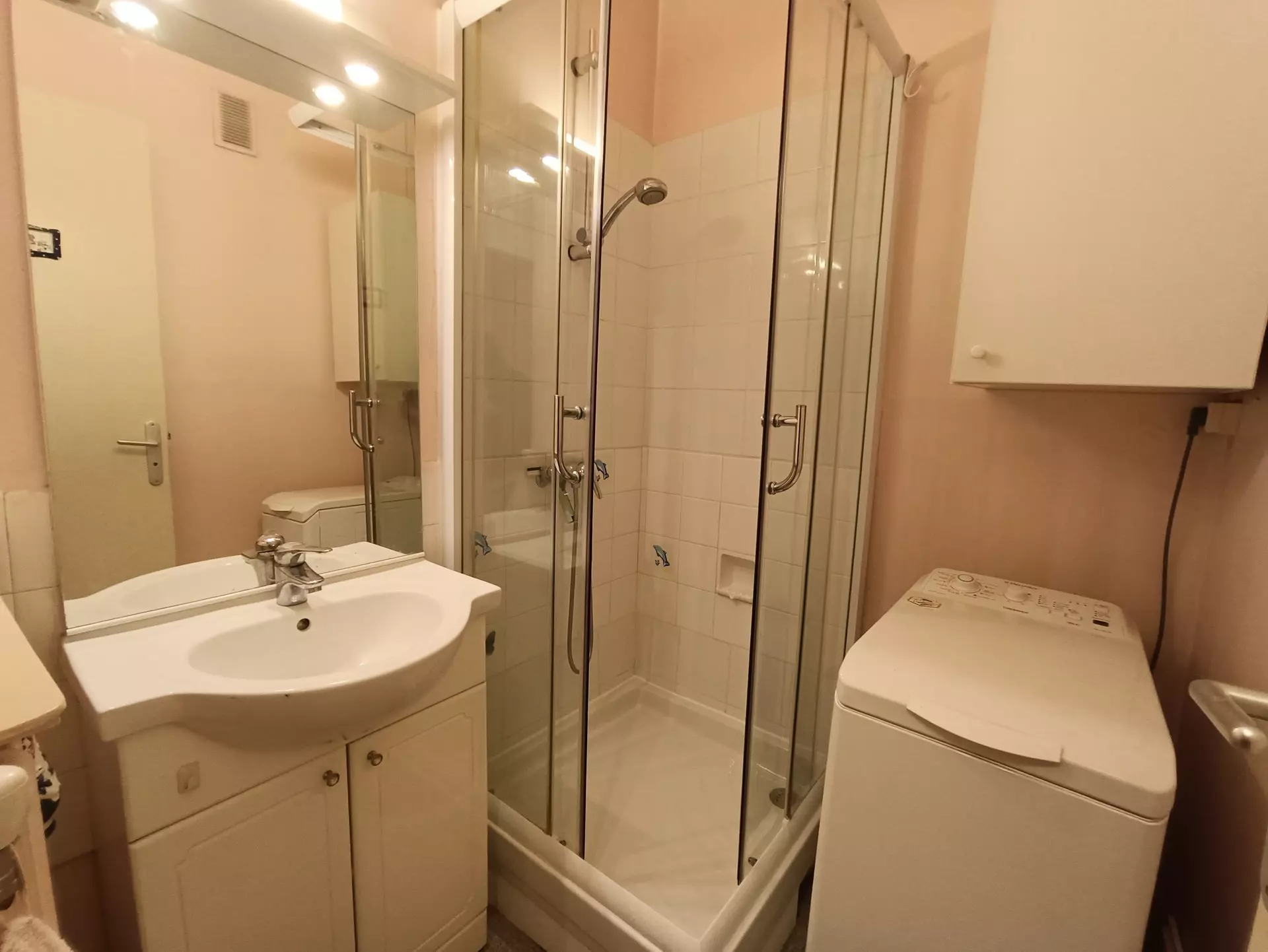 Shower room (tiled floor): corner shower cubicle, vanity unit, washing machine. Separate WC