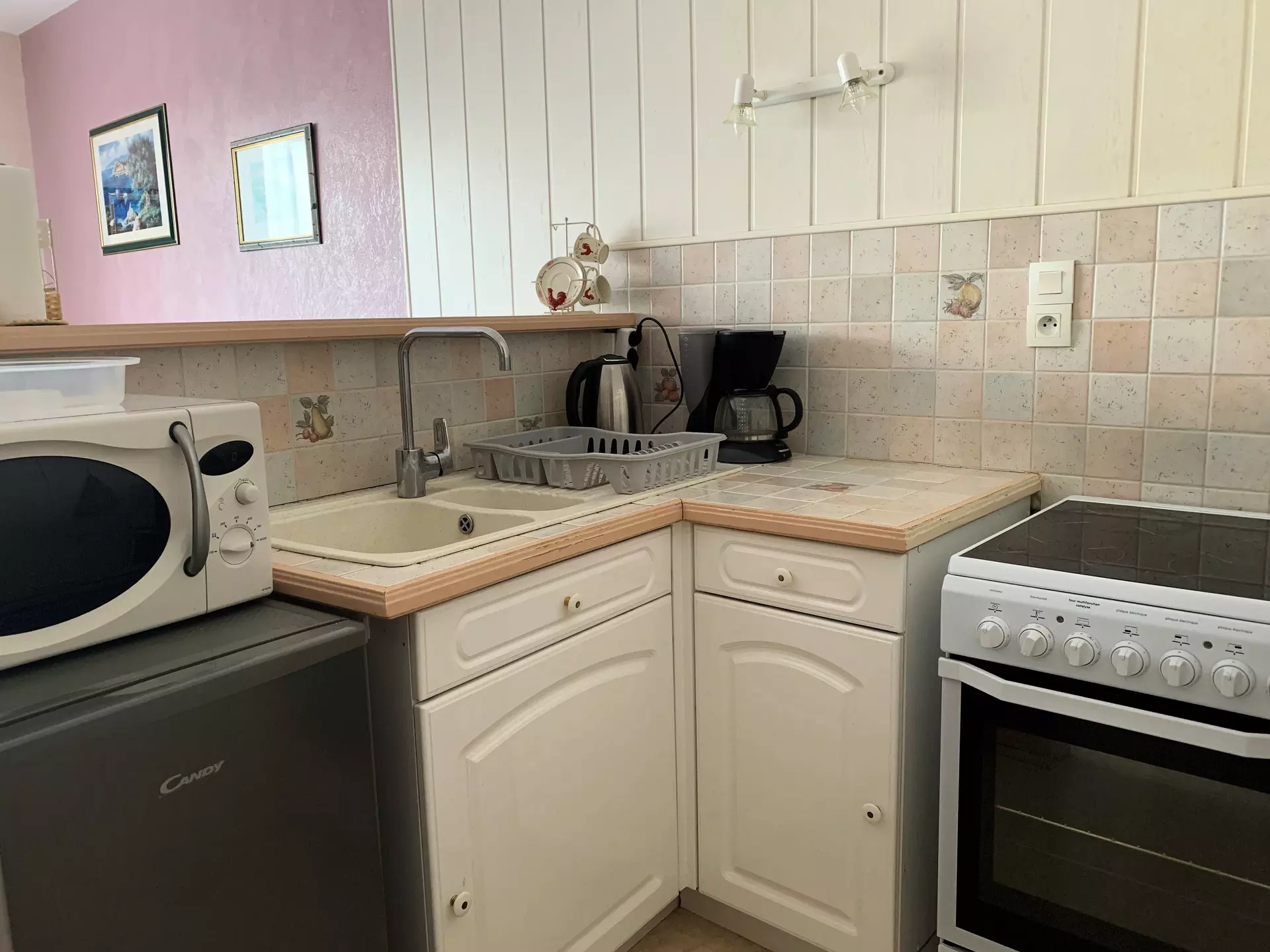 Kitchen area open to living room (PVC floor): sink, 1 4-burner stove with electric oven, refrigerator/freezer, microwave, coffee maker, toaster, crockery and cookware