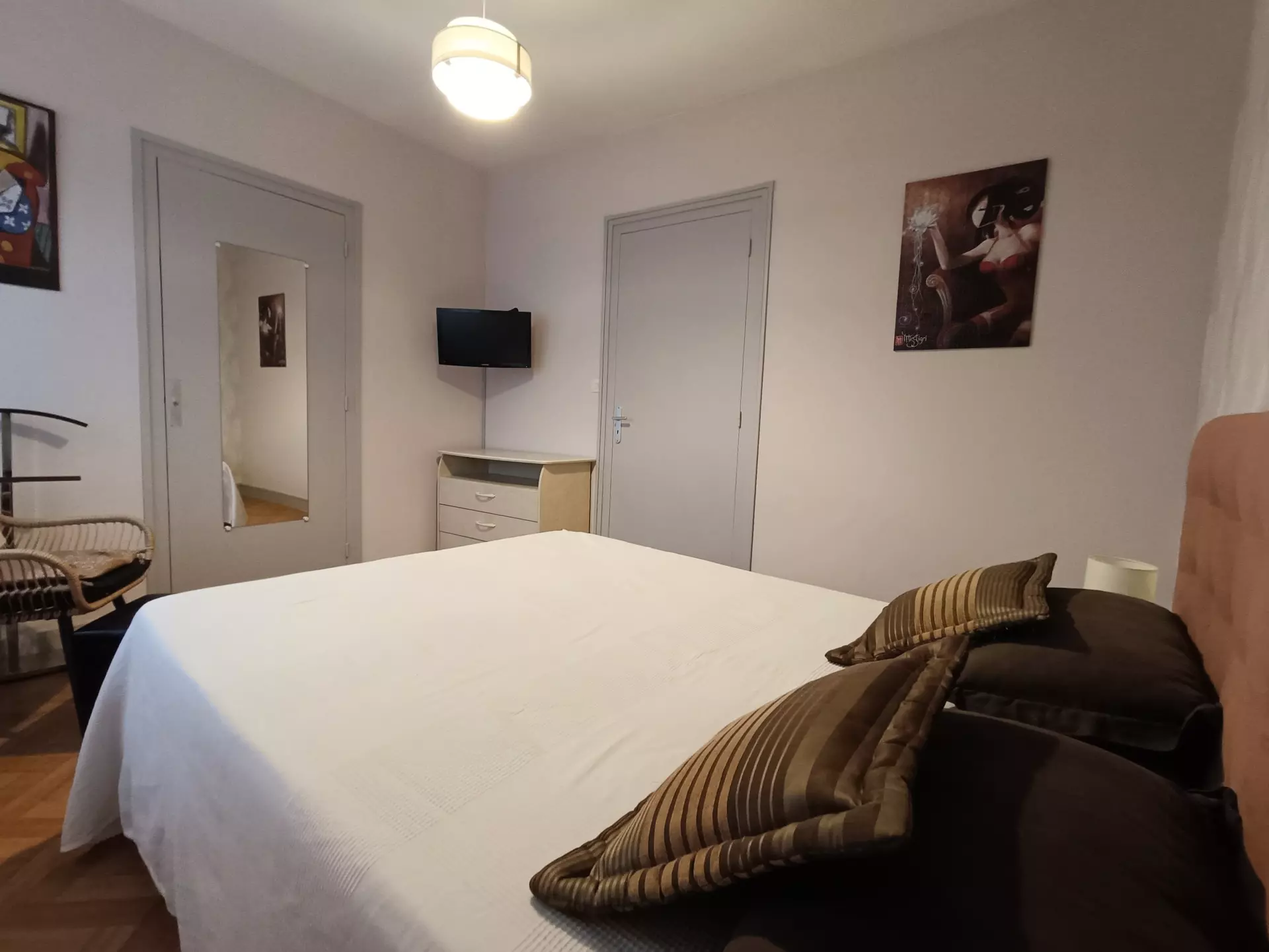 Bedroom (PVC floor) open to the East by window: 1 bed 140 cm, 2 bedside tables, 1 wardrobe, 1 chest of drawers, 1 wall-mounted television