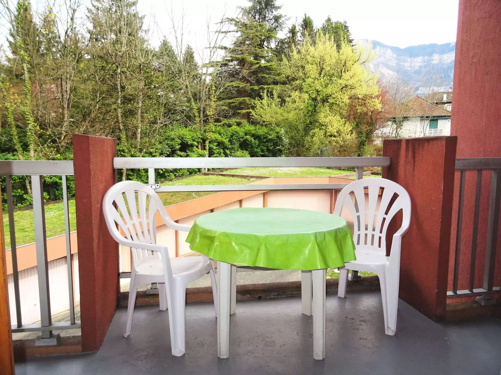 Surface area of approximately 26 m² opening to the East onto a furnished balcony (1 table, 2 armchairs)