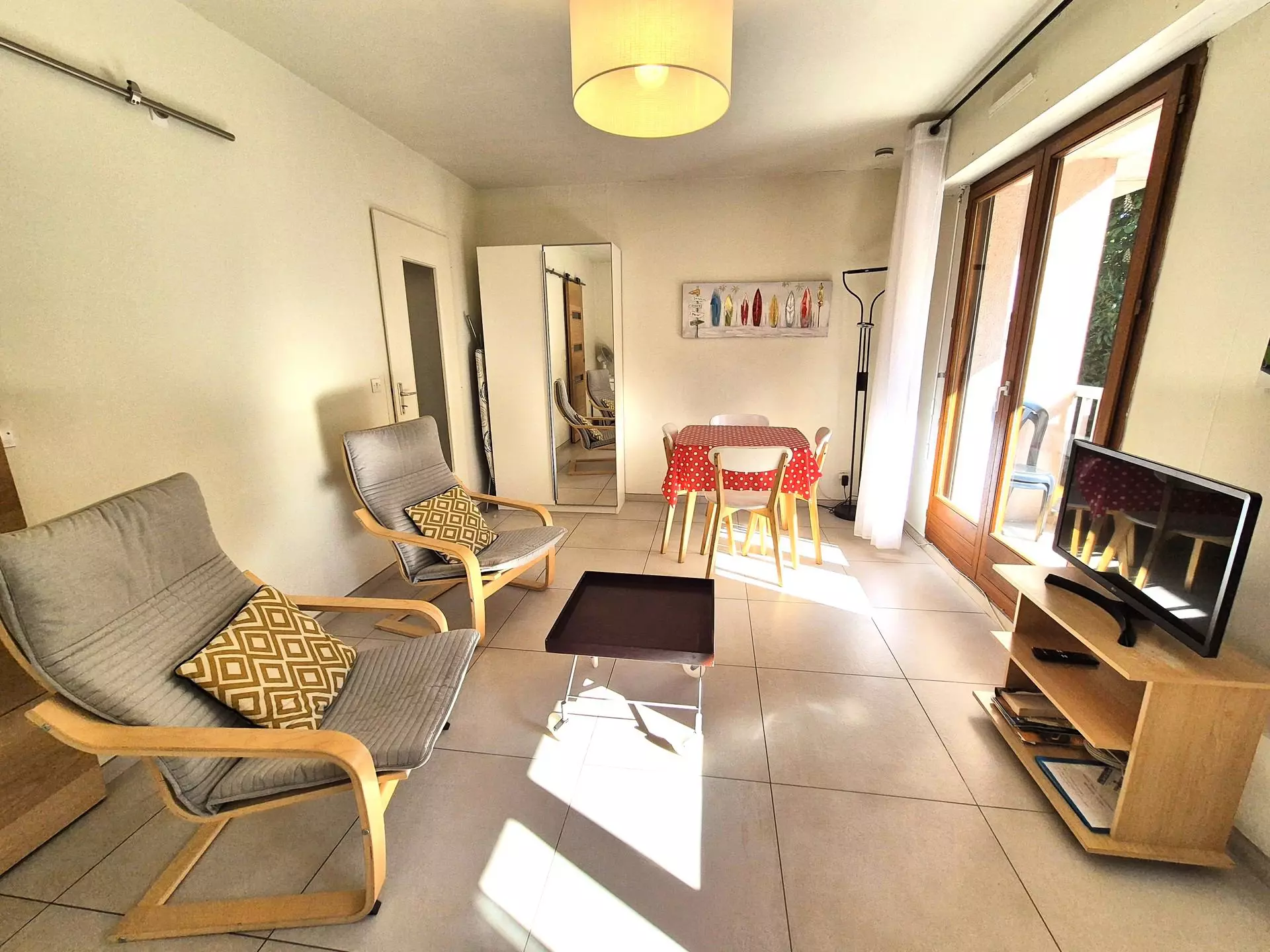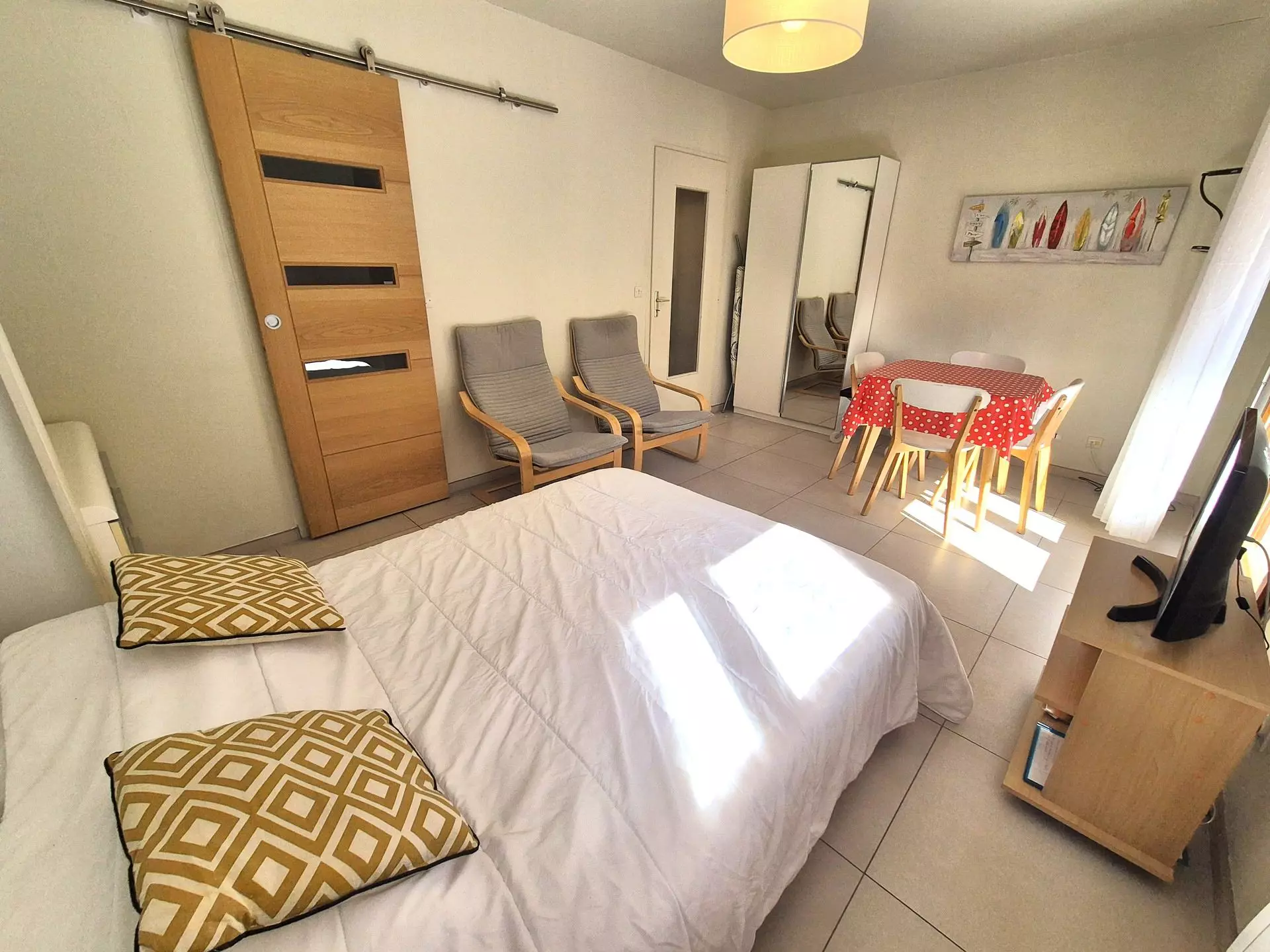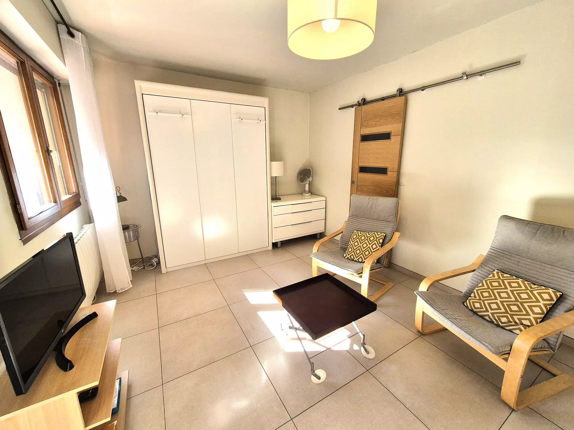 Main room (tiled floor): 1 folding bed 140, 2 armchairs, 1 table, 4 chairs, 1 small TV cabinet, 1 flat screen television, 1 chest of drawers, 1 wardrobe, 1 coffee table, 1 halogen