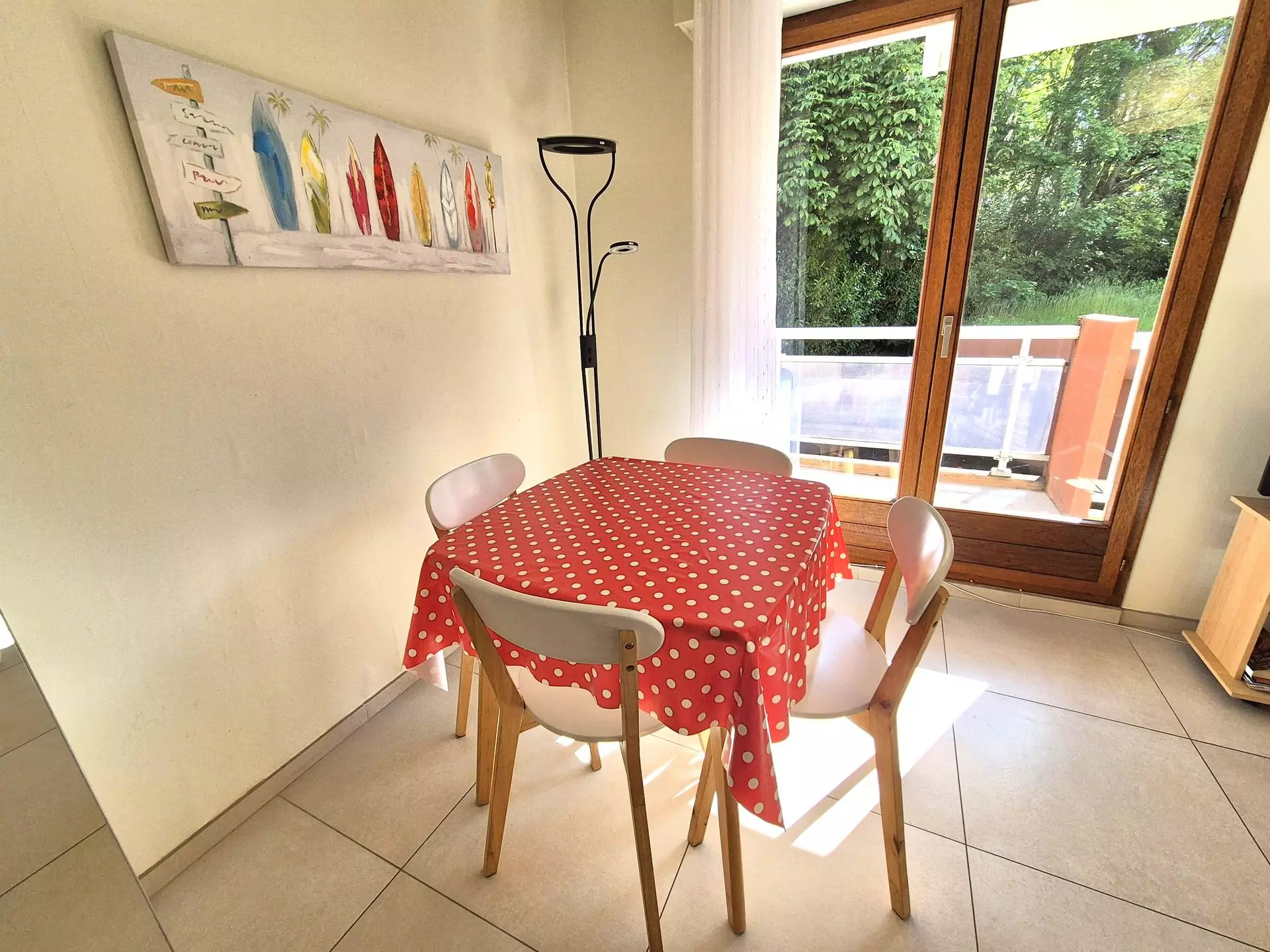Surface area of approximately 26 m² opening to the east onto a furnished balcony "with 1 table, 4 chairs, 1 armchair, 1 parasol"