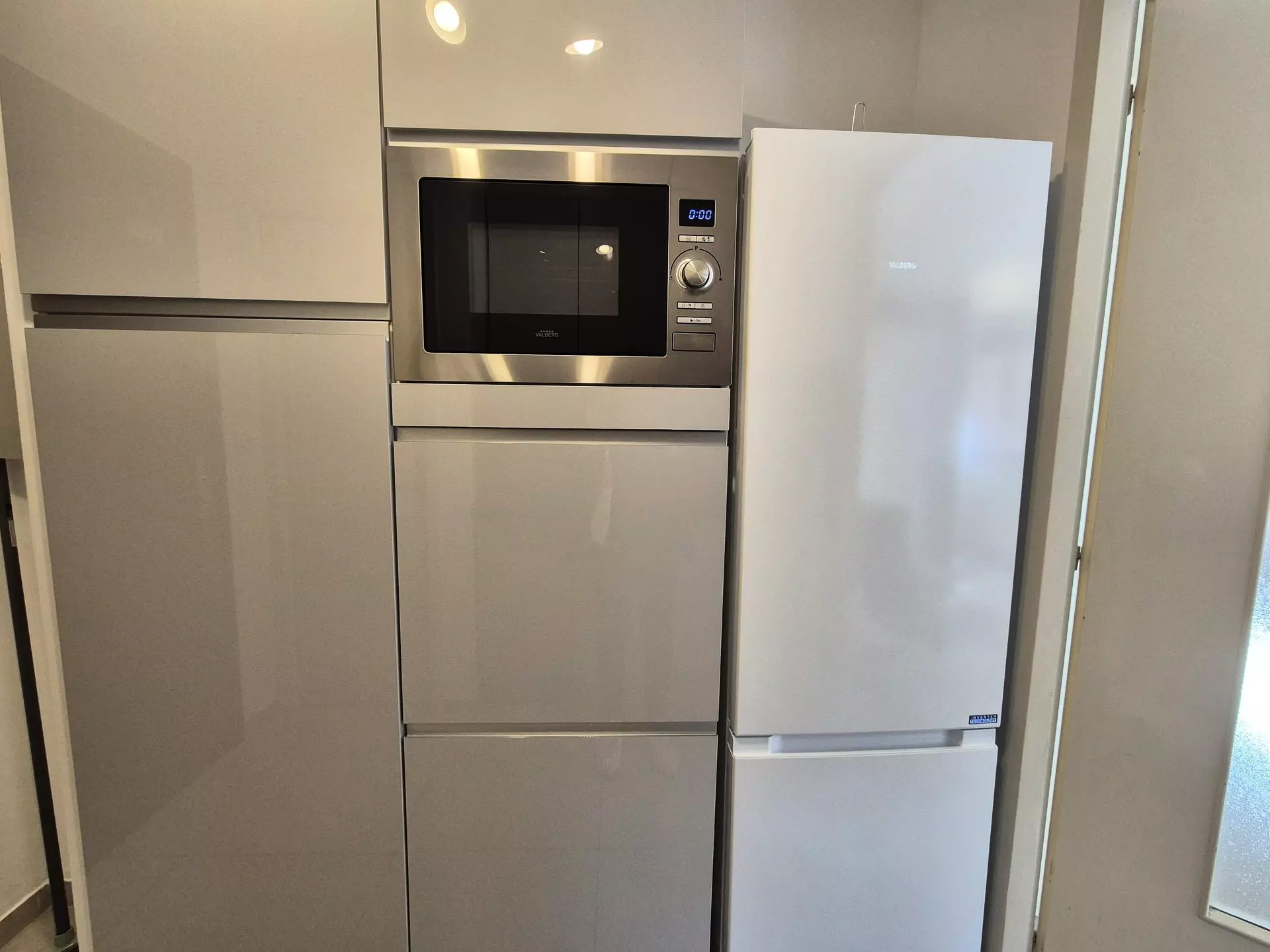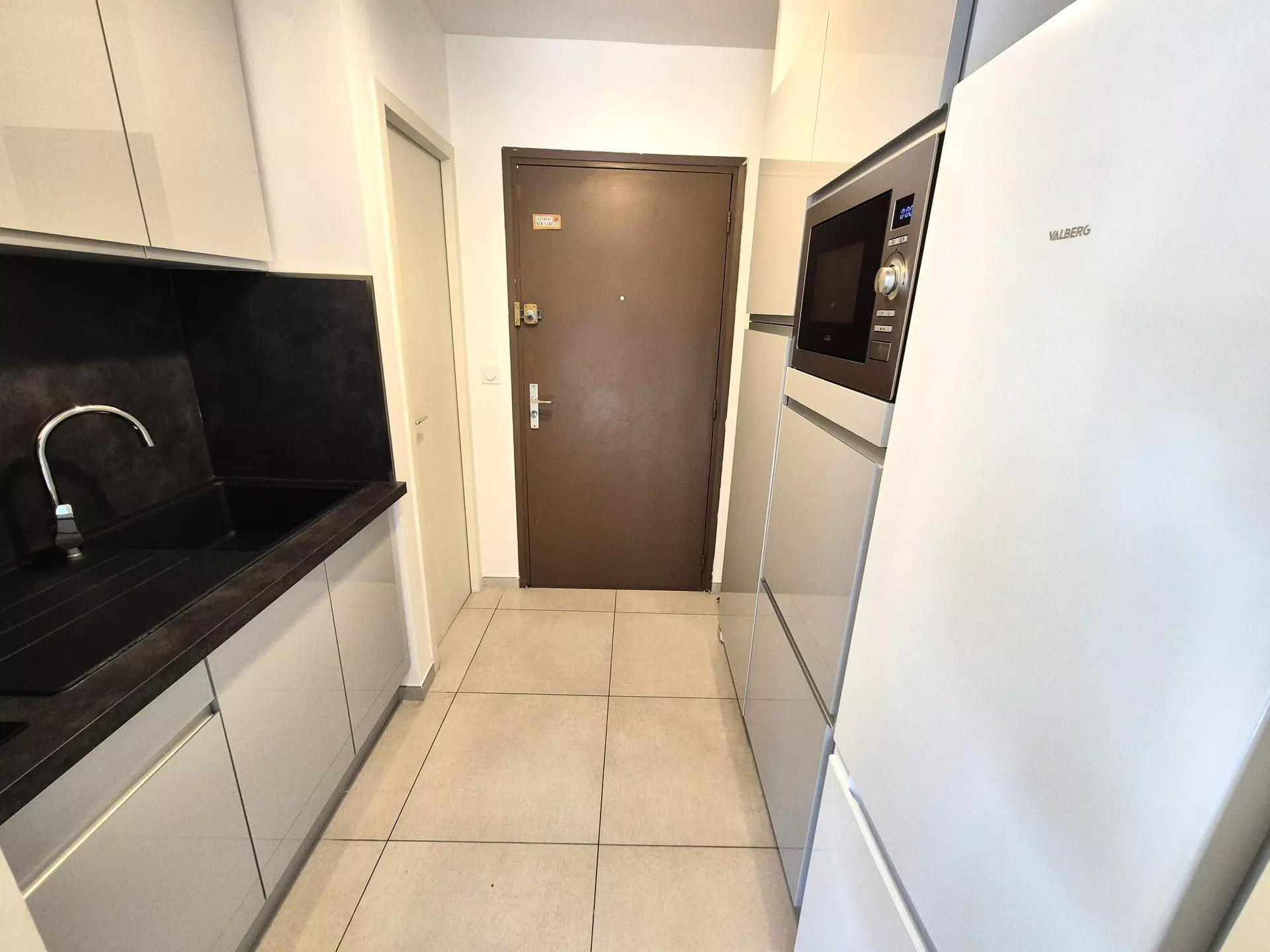 Entrance with Kitchen area (tiled floor): 2 induction hobs, 1 microwave/grill oven, sink, fridge/freezer, electric coffee maker, kettle, toaster, cupboard for crockery and cookware.