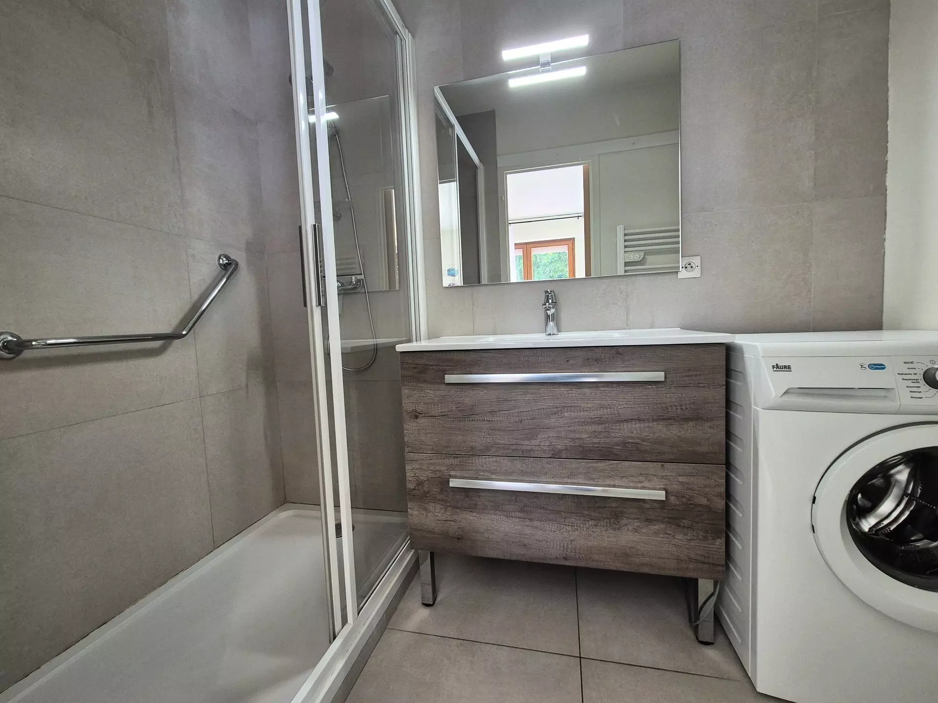 Shower room (tiled): shower cubicle (non-slip and grab handle), vanity unit, washing machine, electric towel dryer. Separate WC