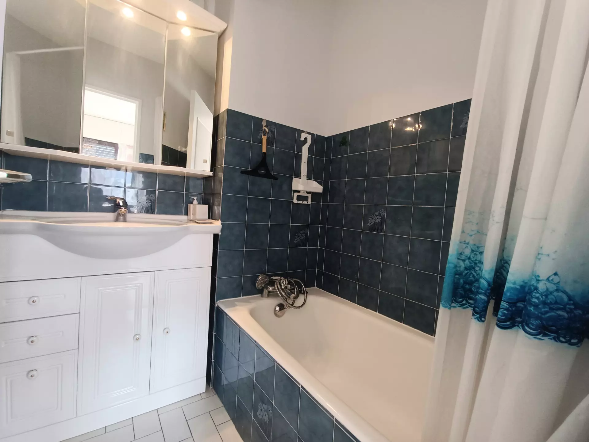 Bathroom (tiled) with bathtub, sink. Separate WC (tiled)