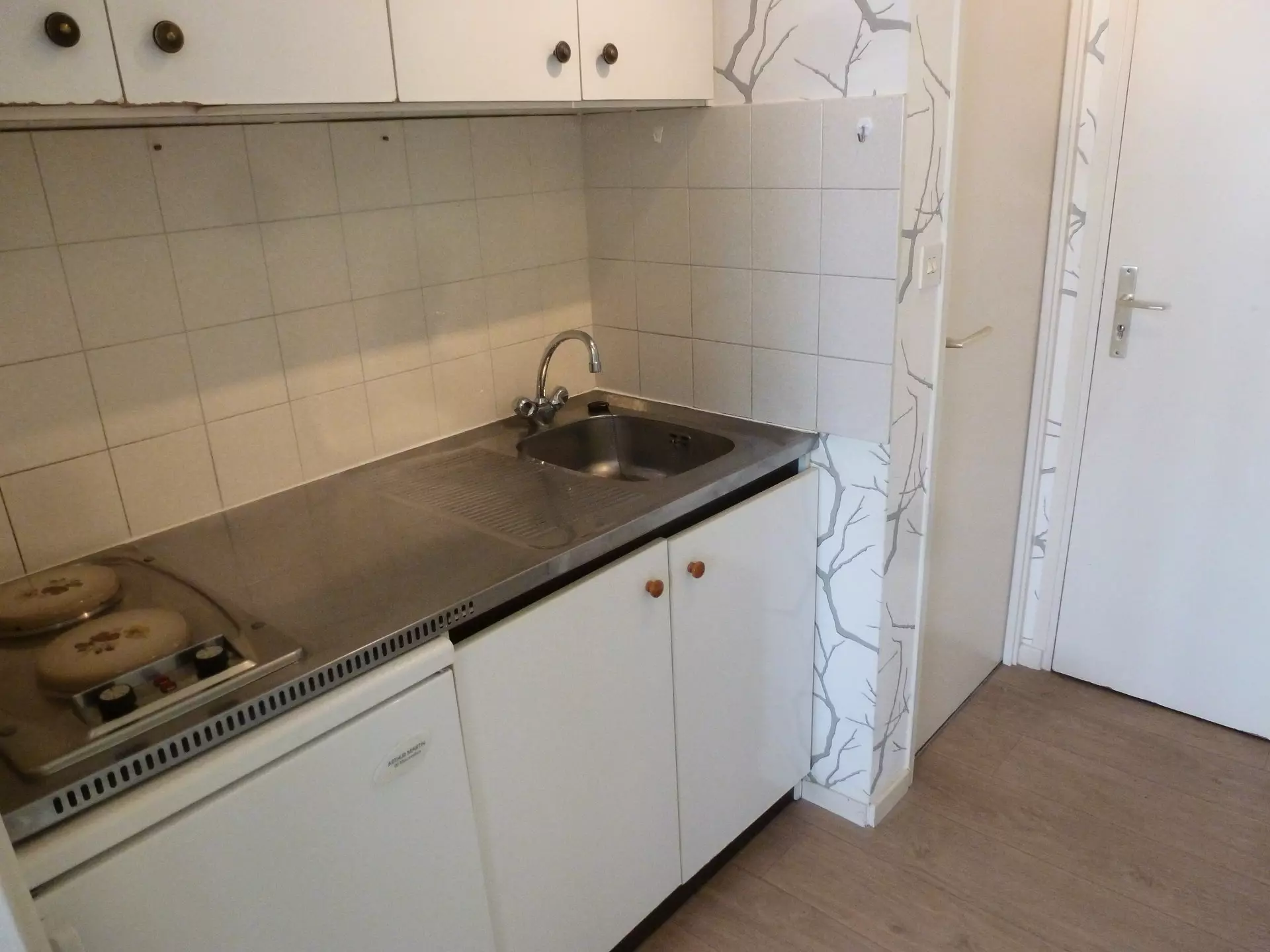 Kitchenette opening onto entrance (PVC): 2 electric hobs, sink, refrigerator, mini oven, microwave, electric coffee maker, kettle, toaster, crockery and cookware.