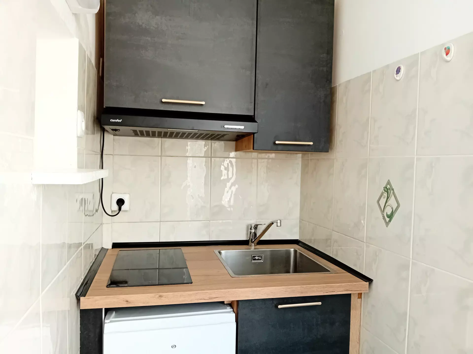 Kitchenette (tiled) with window: 1 induction hob 2 burners, refrigerator, traditional oven, extractor hood, 1 side unit, 1 electric coffee maker, 1 kettle, 1 toaster, crockery and cookware.