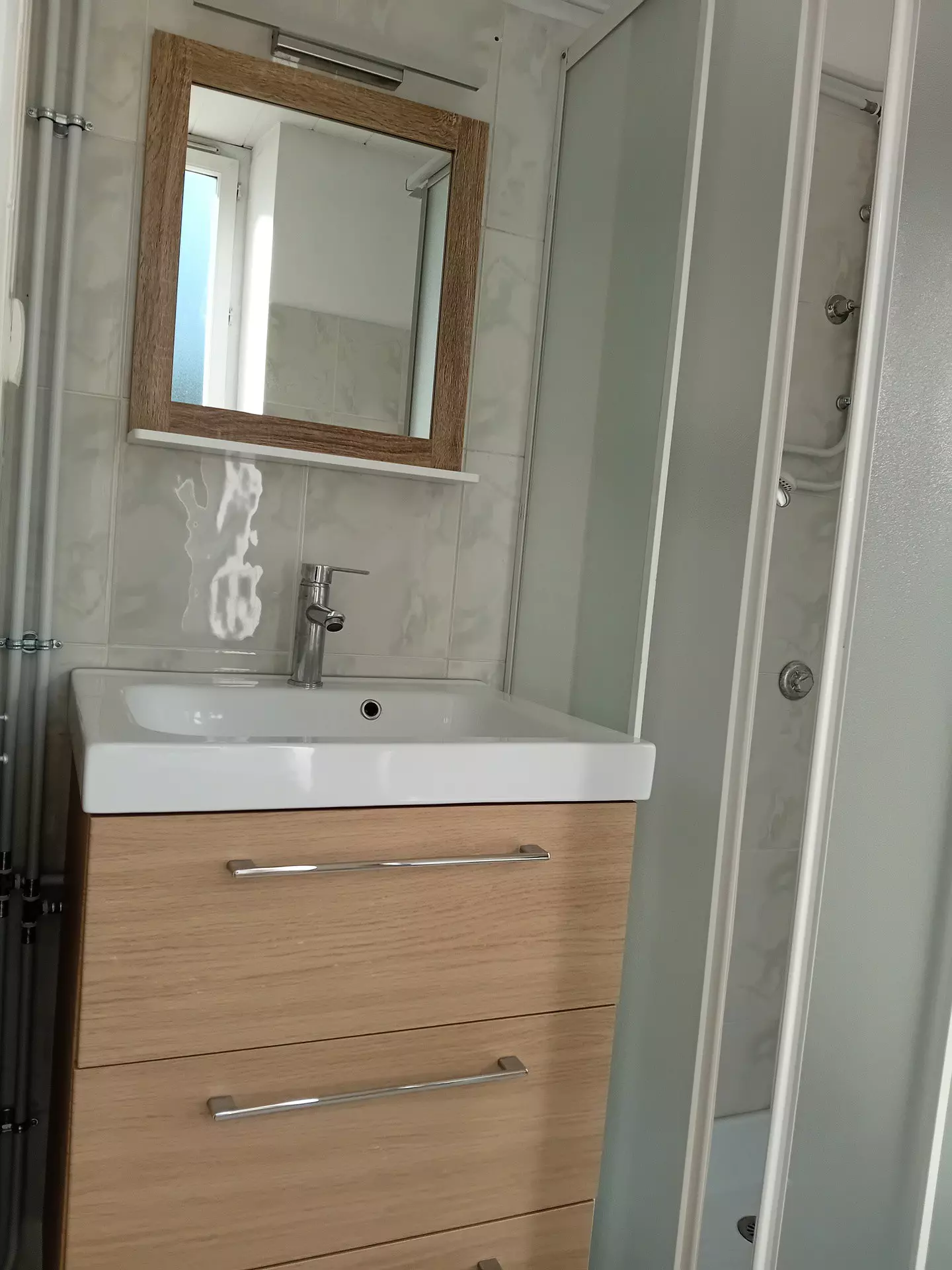 Bathroom (tiled) with window: shower with sliding walls "narrow shower", vanity unit with 3 drawers, WC.