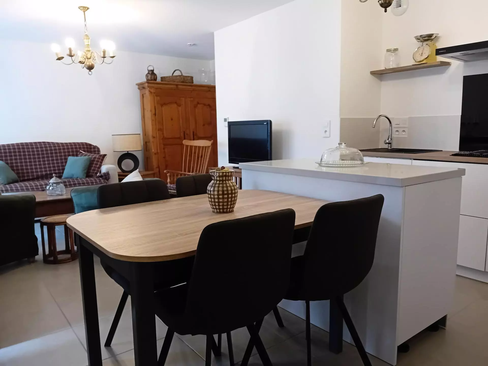 Kitchen / Living room, access to terrace: Central island, induction hob, extractor hood, oven, microwave, dishwasher, fridge-freezer, 1 table, 4 chairs, 1 sofa bed, 1 coffee table, 2 armchairs, various wooden nesting tables, 1 kneading trough, crockery and cookware.
