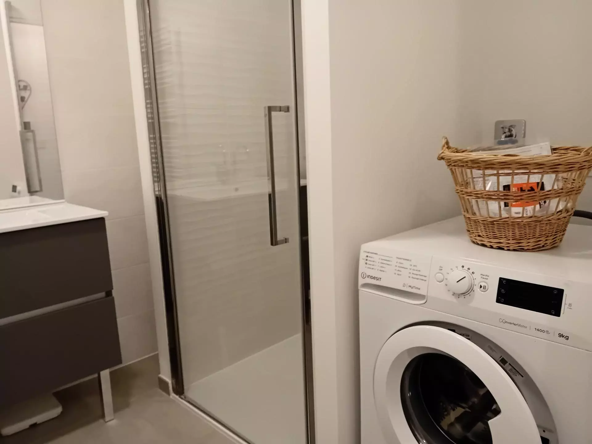 Bathroom: (tiled): walk-in shower, vanity unit, washing machine, towel warmer.