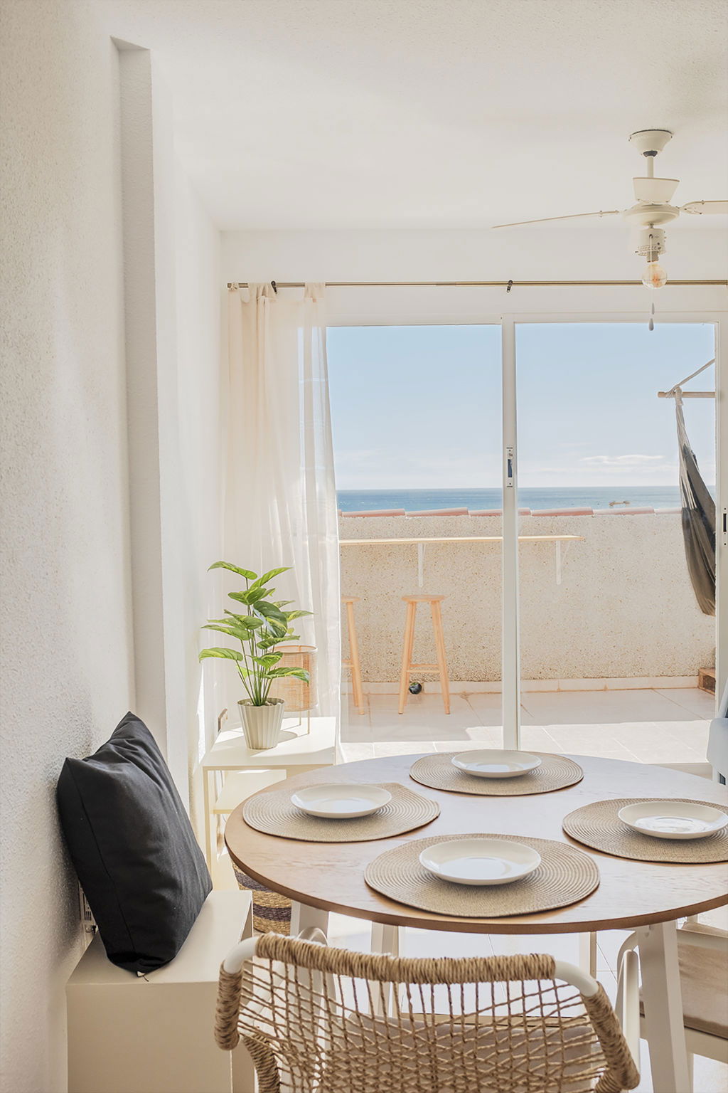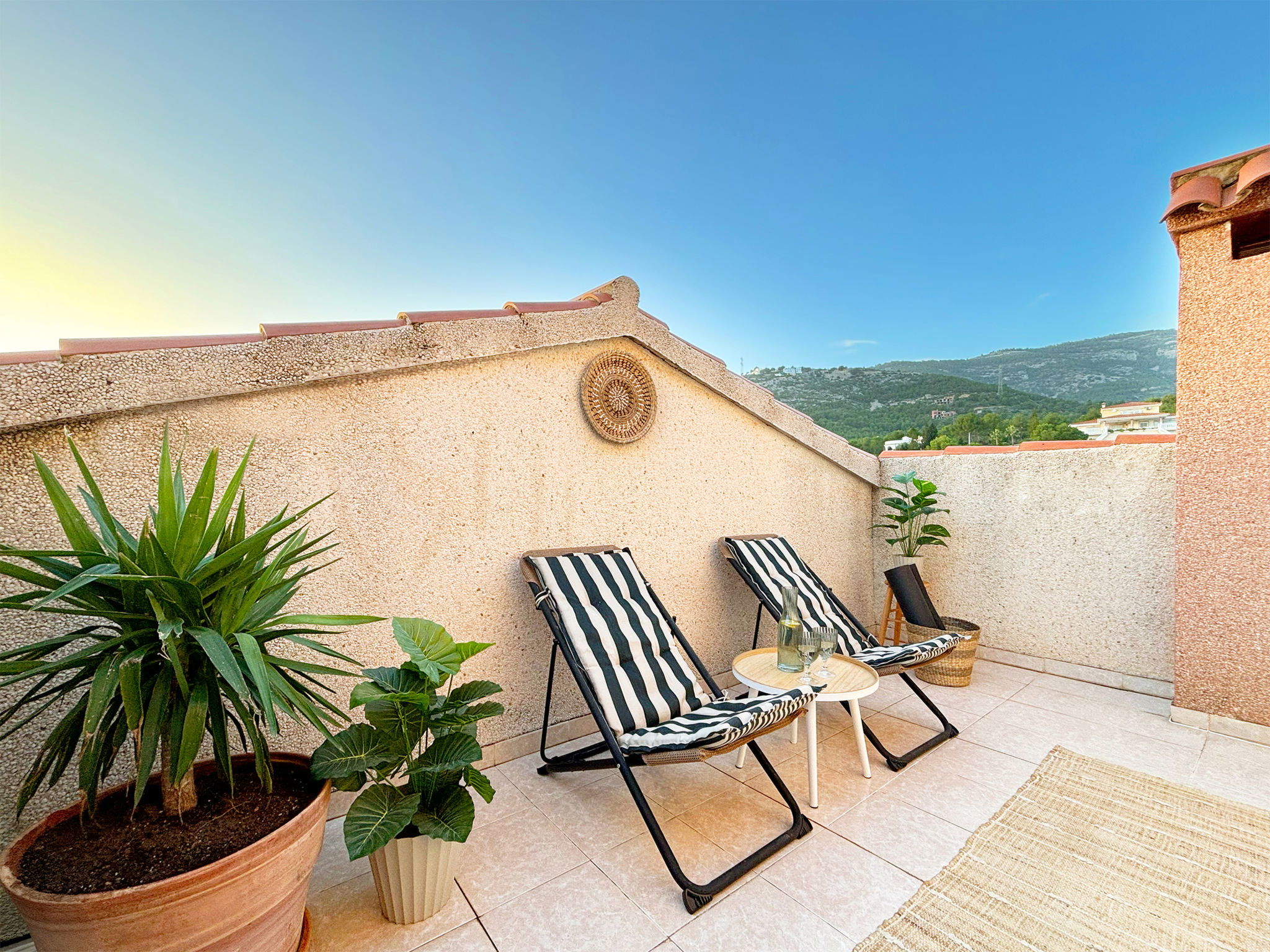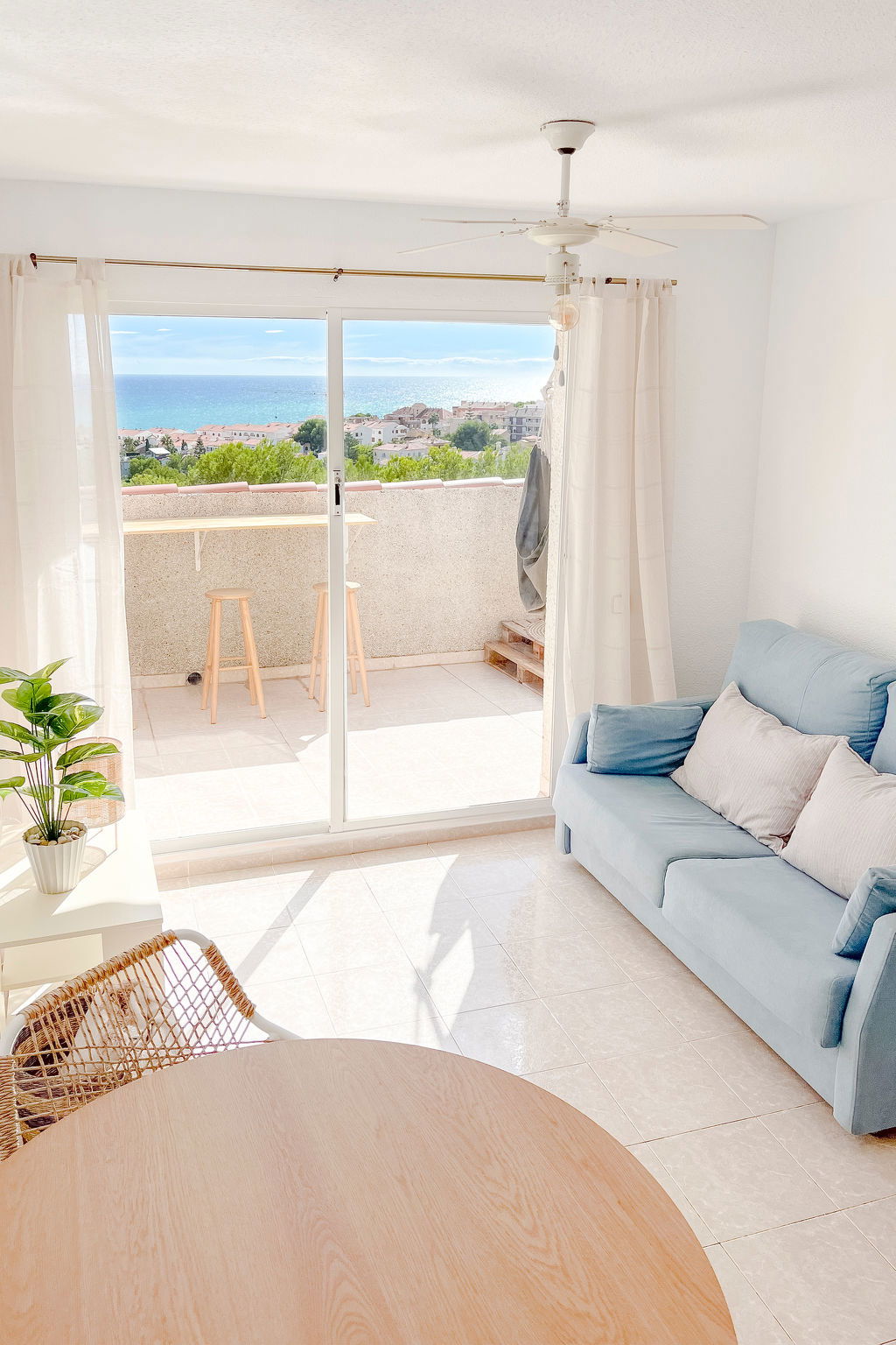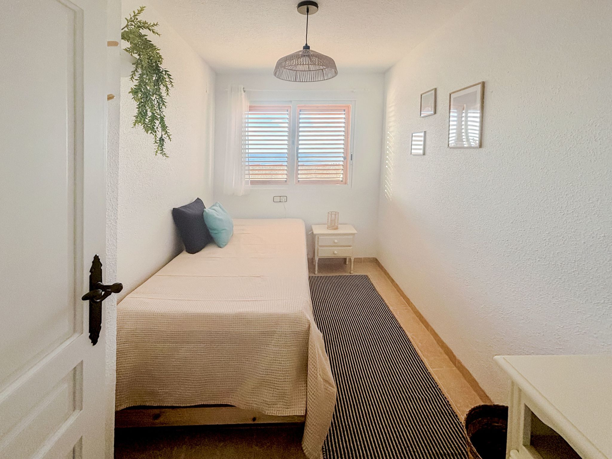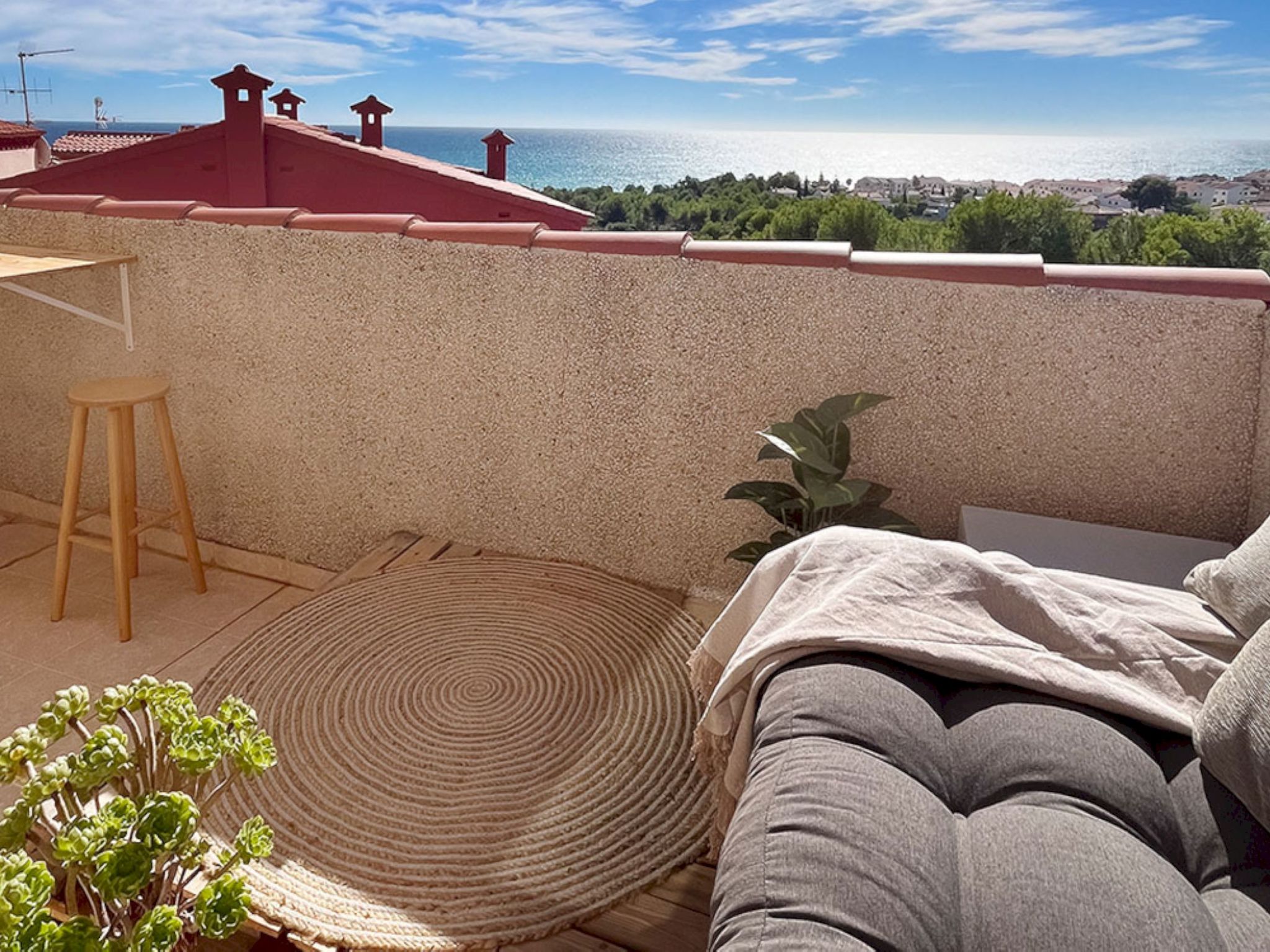 "Terraza Azul-Penthouse sea view", 3-room penthouse 60 m2 on 3rd floor. Renovated in 2024, practical and comfortable furnishings: living/dining room with dining table, digital TV, air conditioning, fan and forced-air heating. Exit to the terrace. 1 room with 1 french bed (1 x 160 cm, length 200 cm), air conditioning, fan and forced-air heating. 1 room with 1 double bed (2 x 90 cm, length 190 cm). Open kitchen (oven, dishwasher, toaster, kettle, microwave) with boiler (50 litres). Shower/WC. 2 terraces. Terrace furniture, deck chairs (2), sitting area. Very beautiful view of the sea and the mountains. Facilities: washing machine, iron, hair dryer. Internet (WiFi, free). Please note: non-smokers only. Maximum 1 pet/ dog allowed. TV only ES. Have breakfast at the terrace bar while admiring the beautiful blue sea, or relax in the hanging hammock. CV-VUT0044982-CS // Reg. Nr.: ESFCTU000012006000252505000000000000CV-VUT0044982-CS3