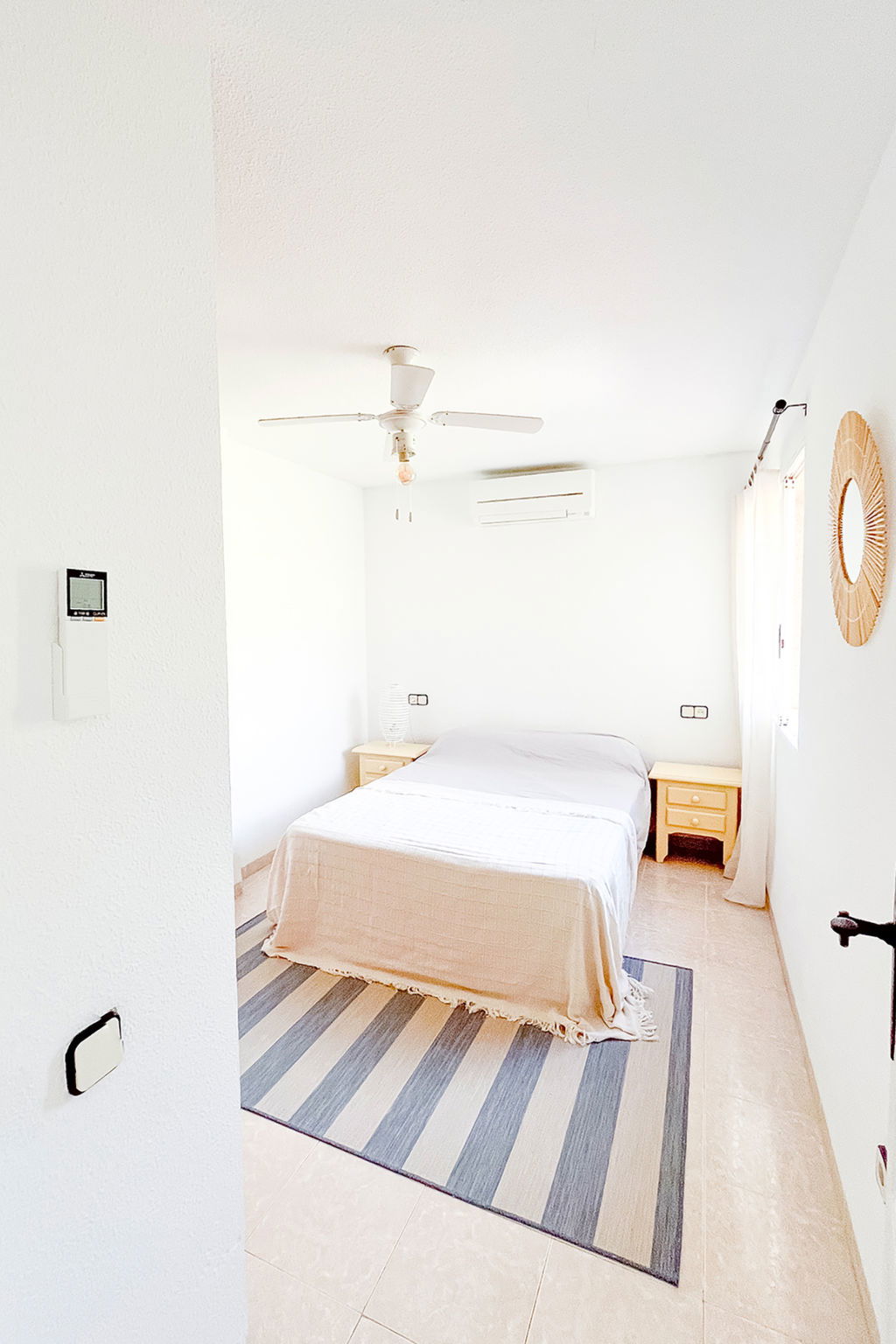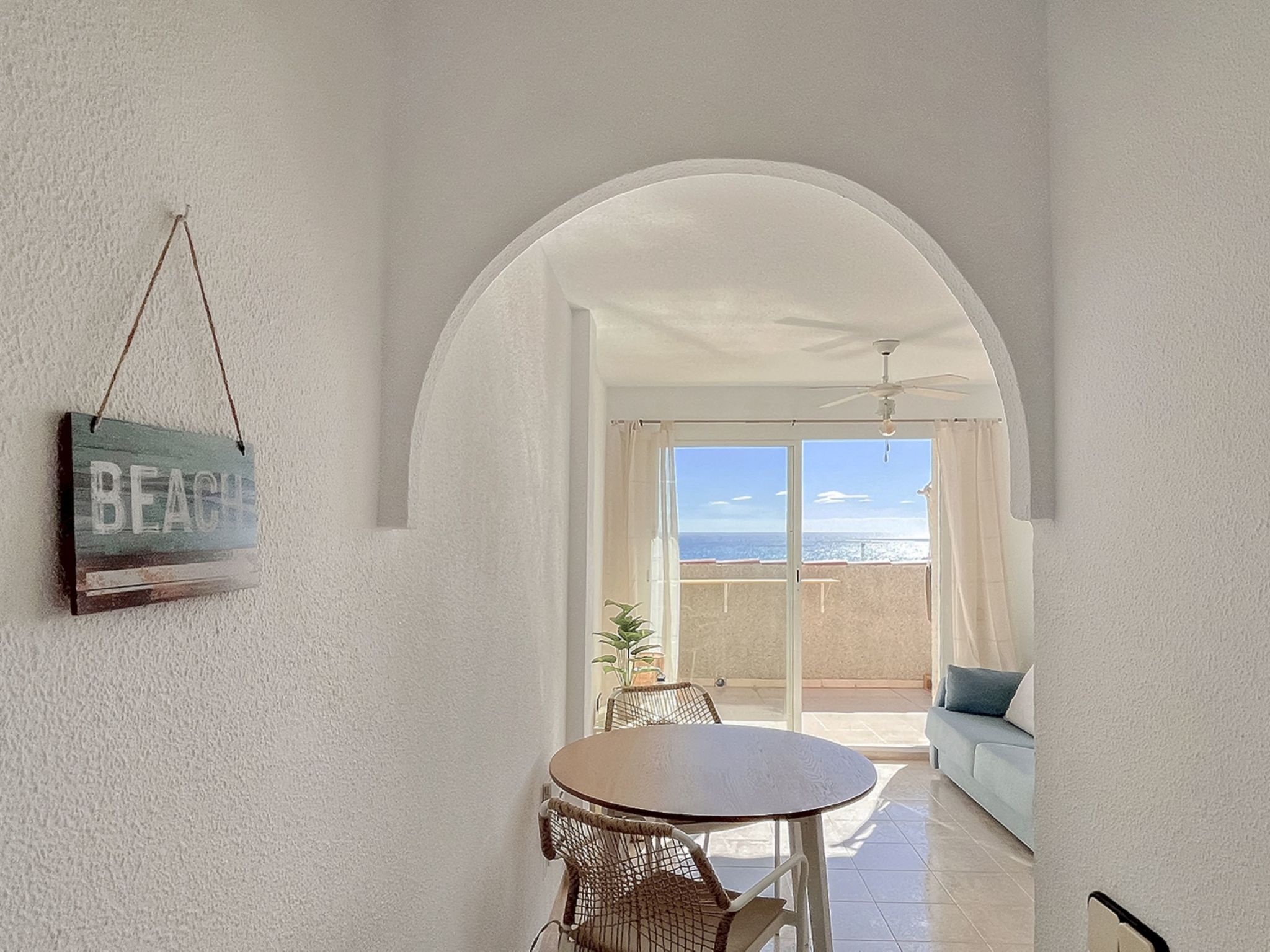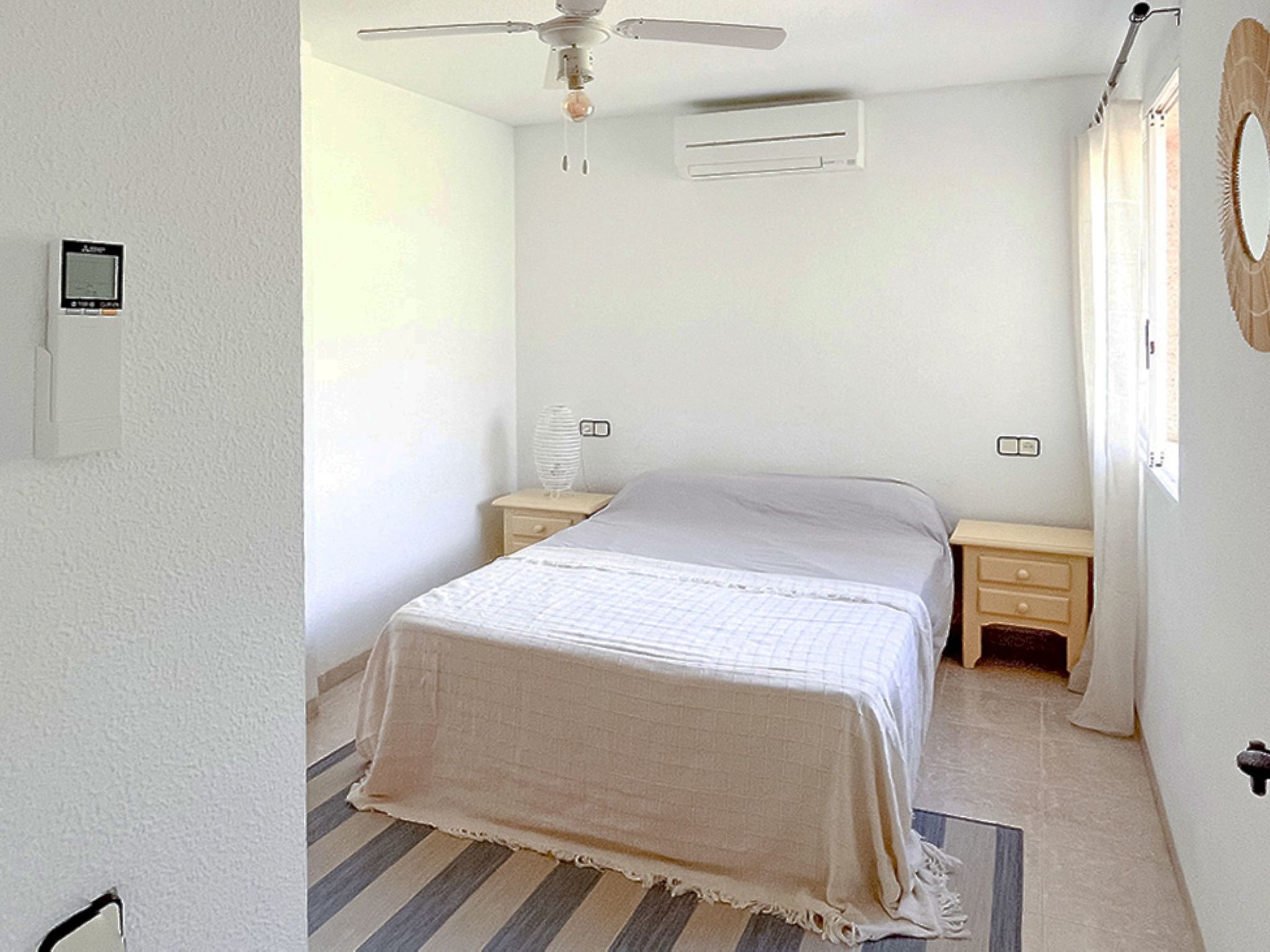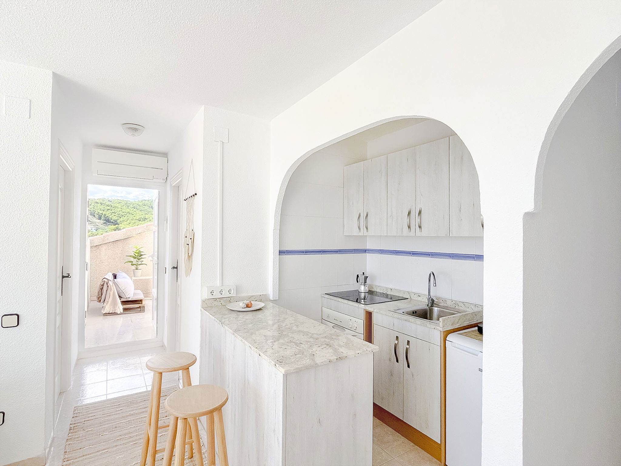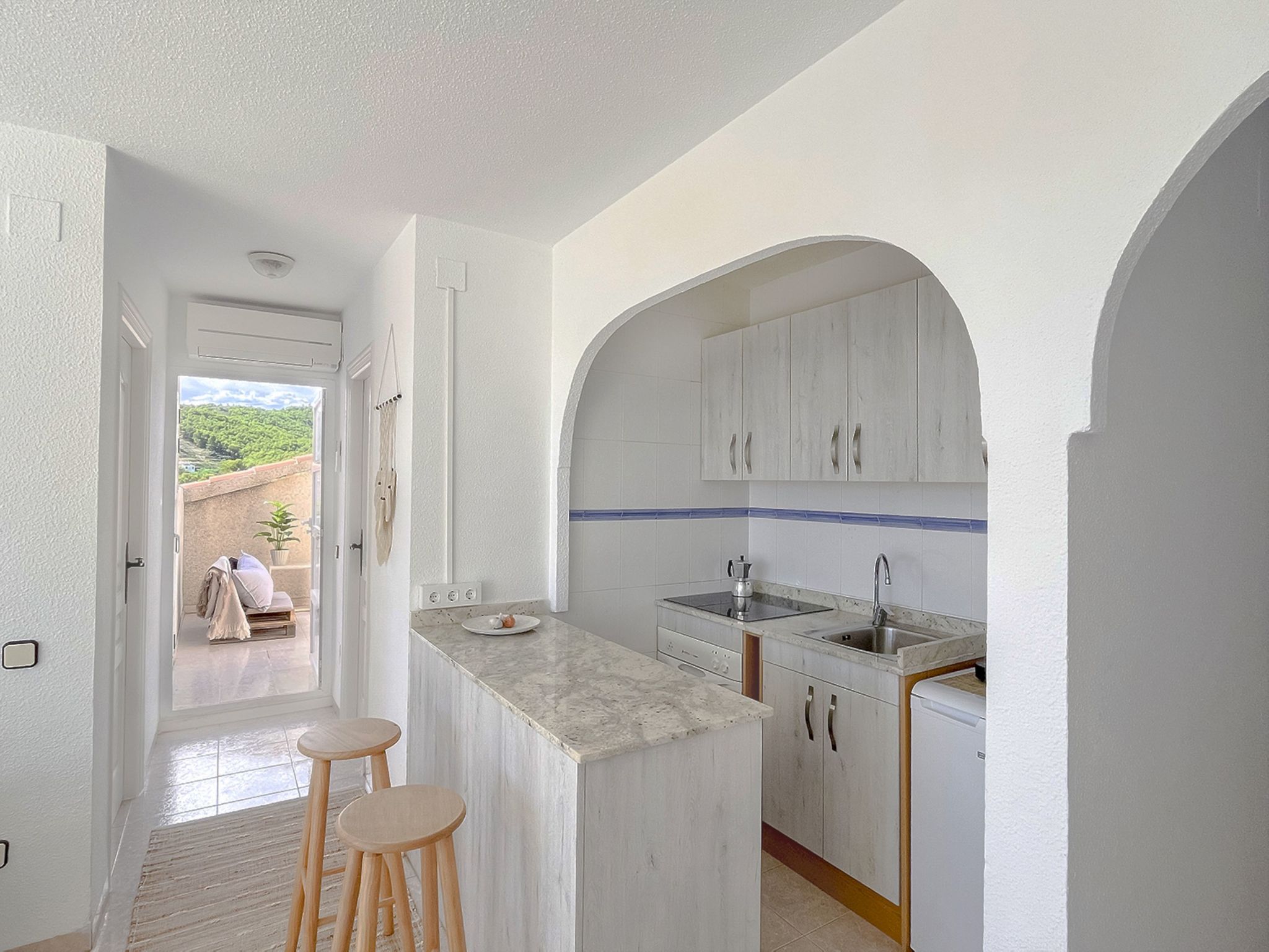 "Terraza Azul-Penthouse sea view", 3-room penthouse 60 m2 on 3rd floor. Renovated in 2024, practical and comfortable furnishings: living/dining room with dining table, digital TV, air conditioning, fan and forced-air heating. Exit to the terrace. 1 room with 1 french bed (1 x 160 cm, length 200 cm), air conditioning, fan and forced-air heating. 1 room with 1 double bed (2 x 90 cm, length 190 cm). Open kitchen (oven, dishwasher, toaster, kettle, microwave) with boiler (50 litres). Shower/WC. 2 terraces. Terrace furniture, deck chairs (2), sitting area. Very beautiful view of the sea and the mountains. Facilities: washing machine, iron, hair dryer. Internet (WiFi, free). Please note: non-smokers only. Maximum 1 pet/ dog allowed. TV only ES. Have breakfast at the terrace bar while admiring the beautiful blue sea, or relax in the hanging hammock. CV-VUT0044982-CS // Reg. Nr.: ESFCTU000012006000252505000000000000CV-VUT0044982-CS3