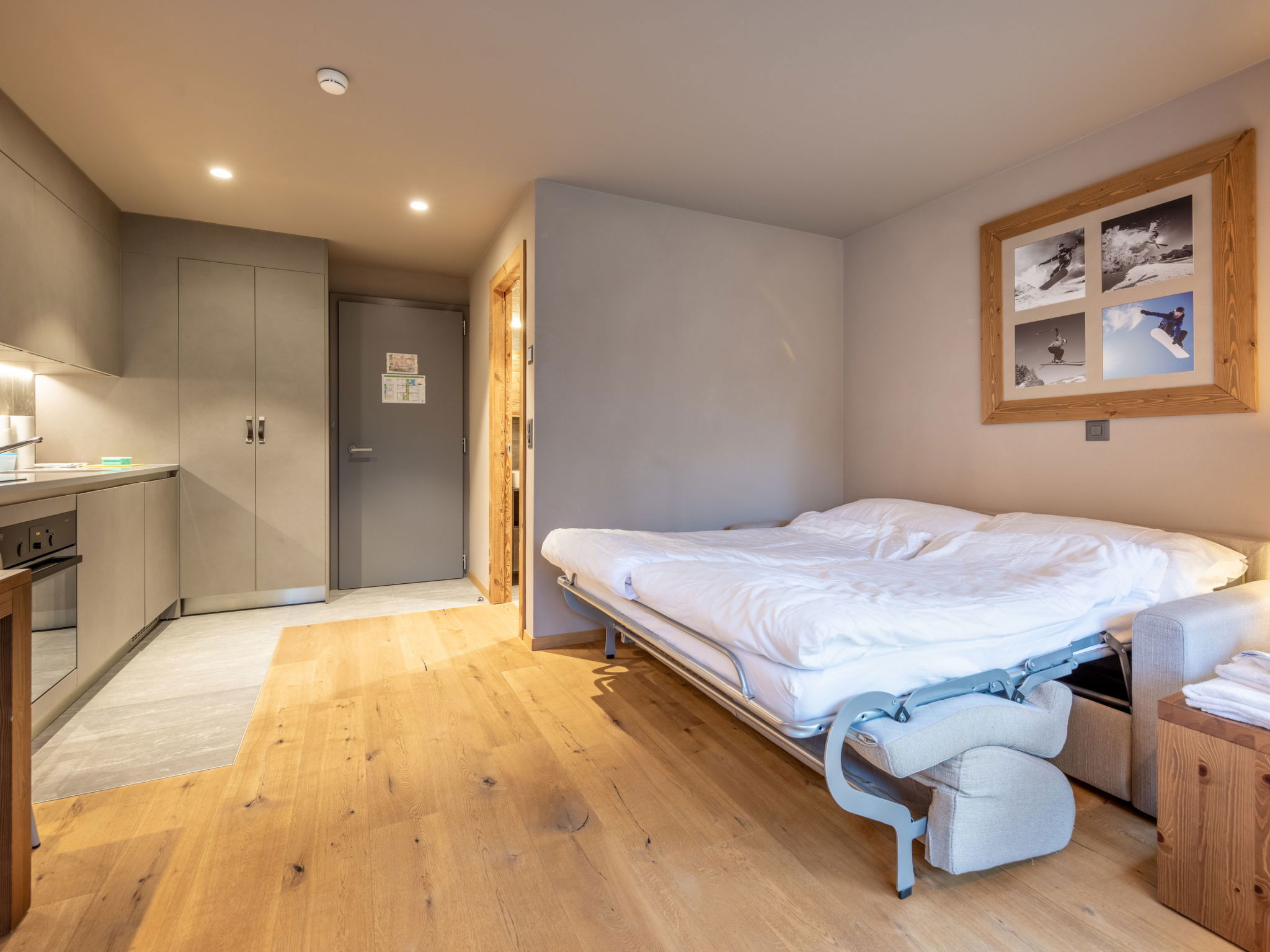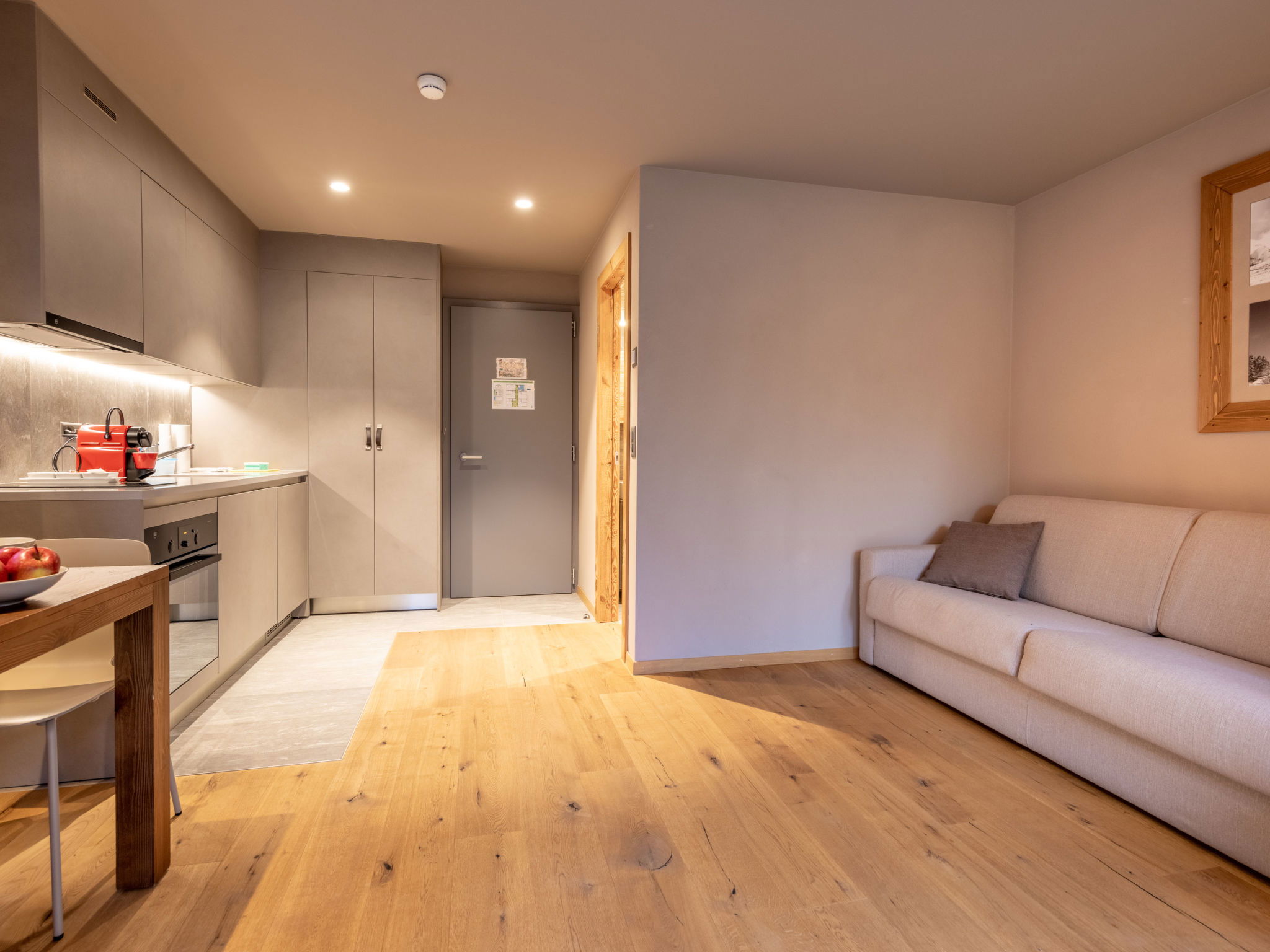 "Studio - 2 personnes", 1-room studio 24 m2. Comfortable and cosy furnishings: Studio with 1 double bed (180 cm), dining table, international TV channels and flat screen. Open kitchen (oven, 2 ceramic glass hob hotplates, electric coffee machine, Capsules for coffee machine (Nespresso) extra). Shower/WC. Underfloor heating. Parquet floors. Facilities: hair dryer. Internet (WiFi). Please note: non-smoking house. 1 pet/ dog allowed. Smoke alarm. The property is one of a type of property or apartment. The fondue set (meet or cheese) as well as a raclette grill can be borrowed at the reception against a deposit.