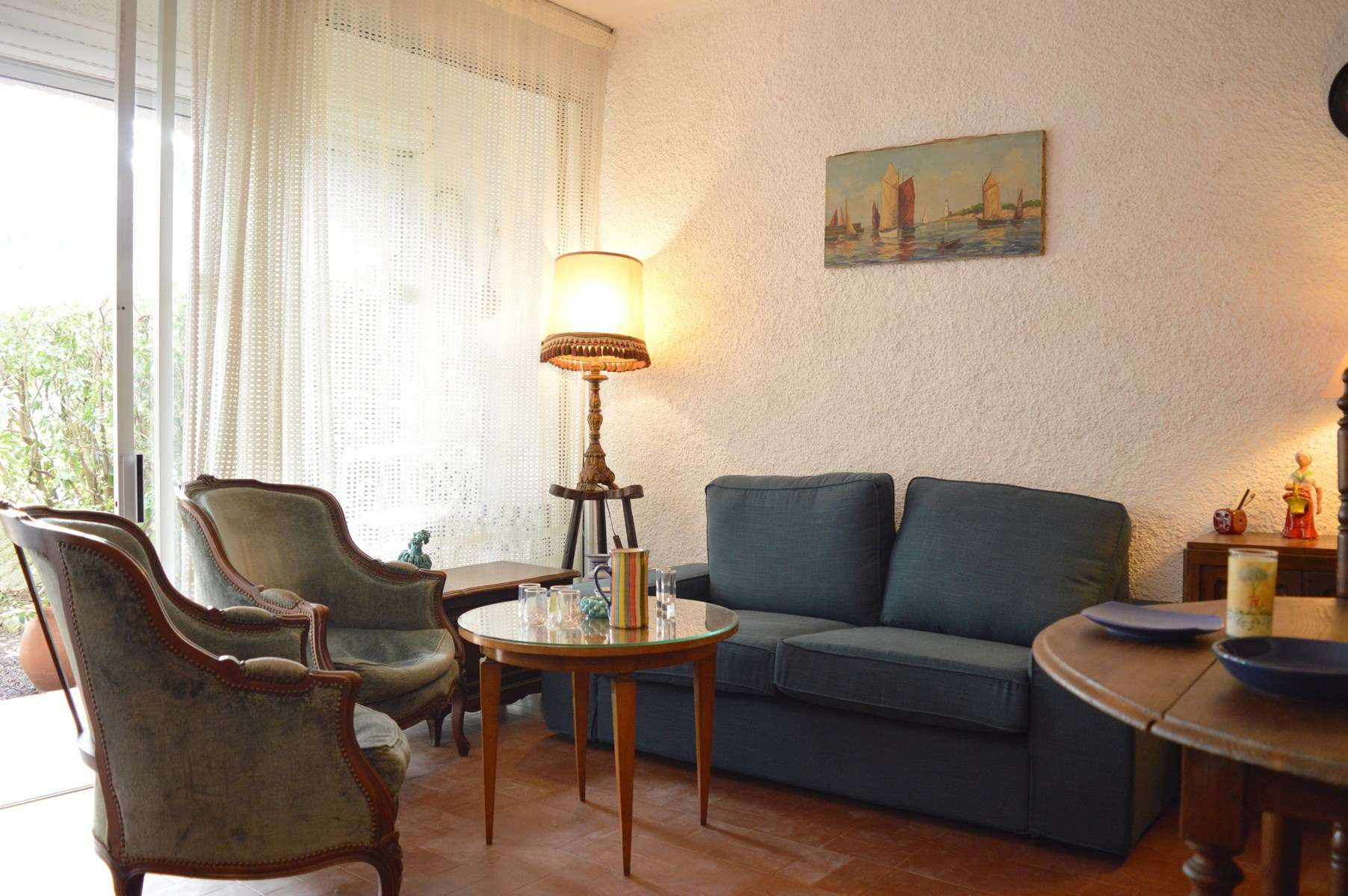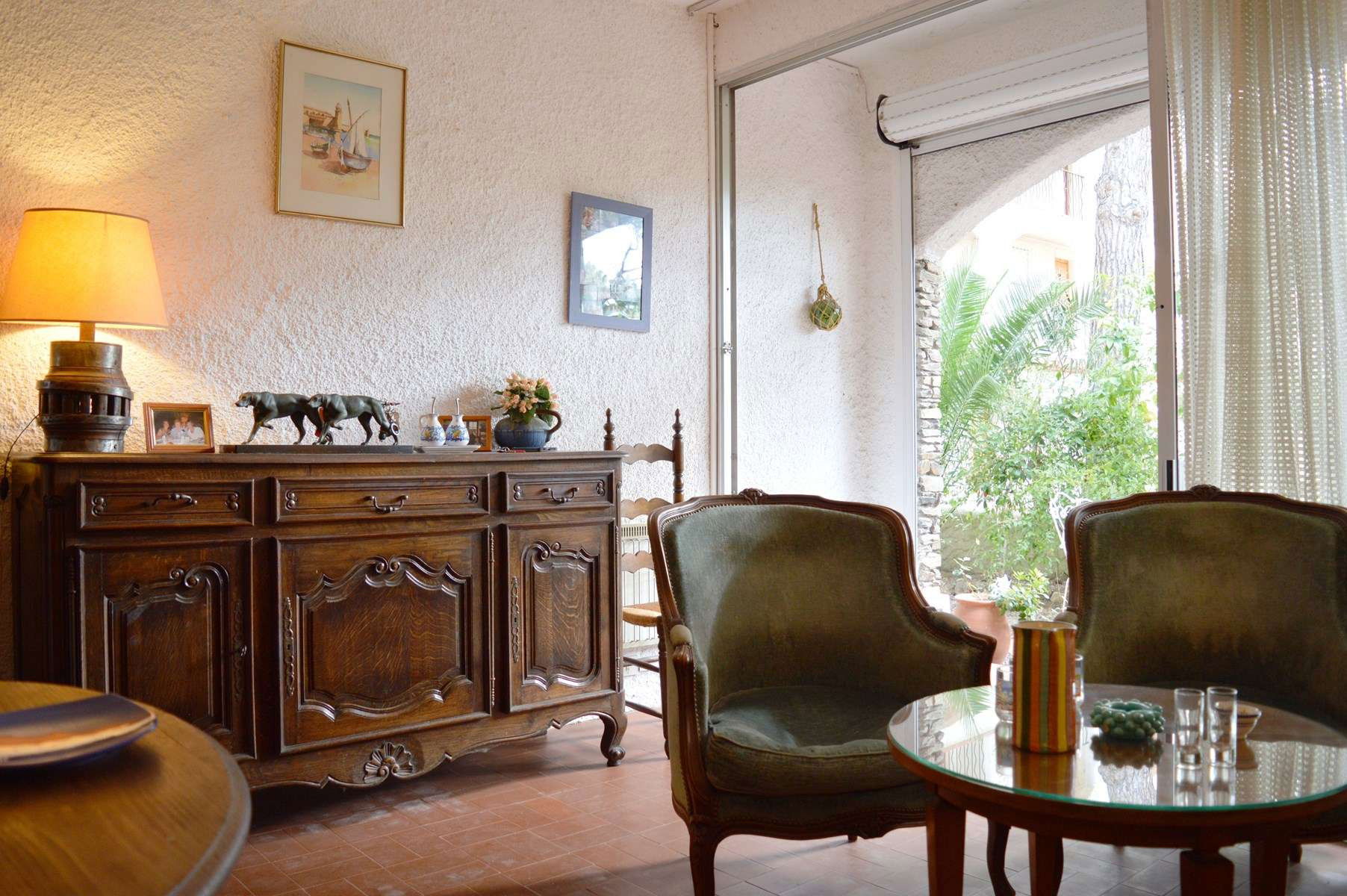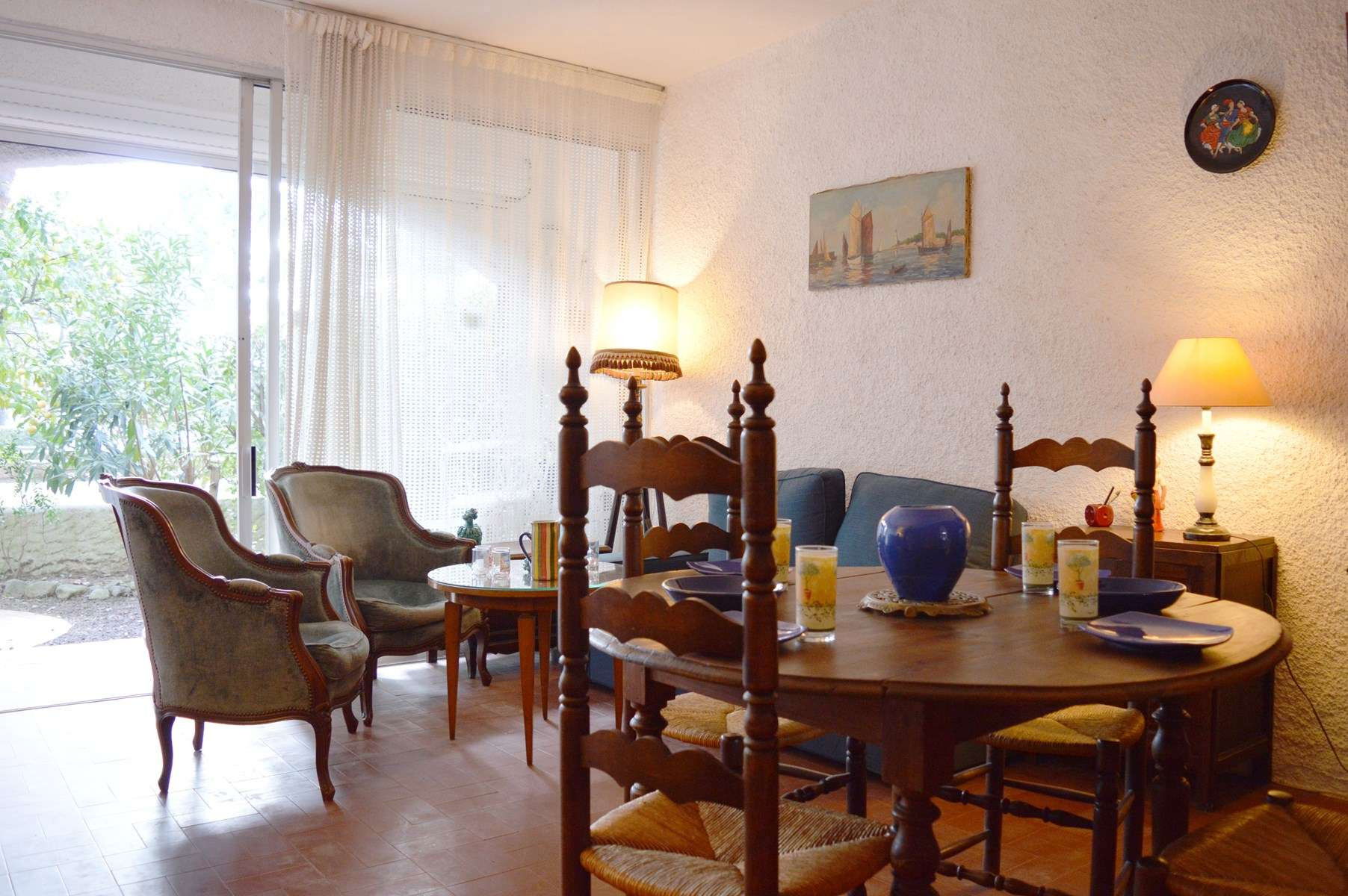 This holiday apartment on the ground floor of the Les Patios de la Massane residence consists of a living room with a sofa opening onto a terrace with garden.