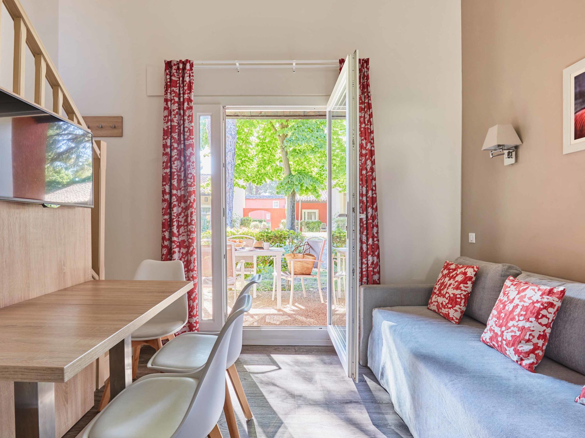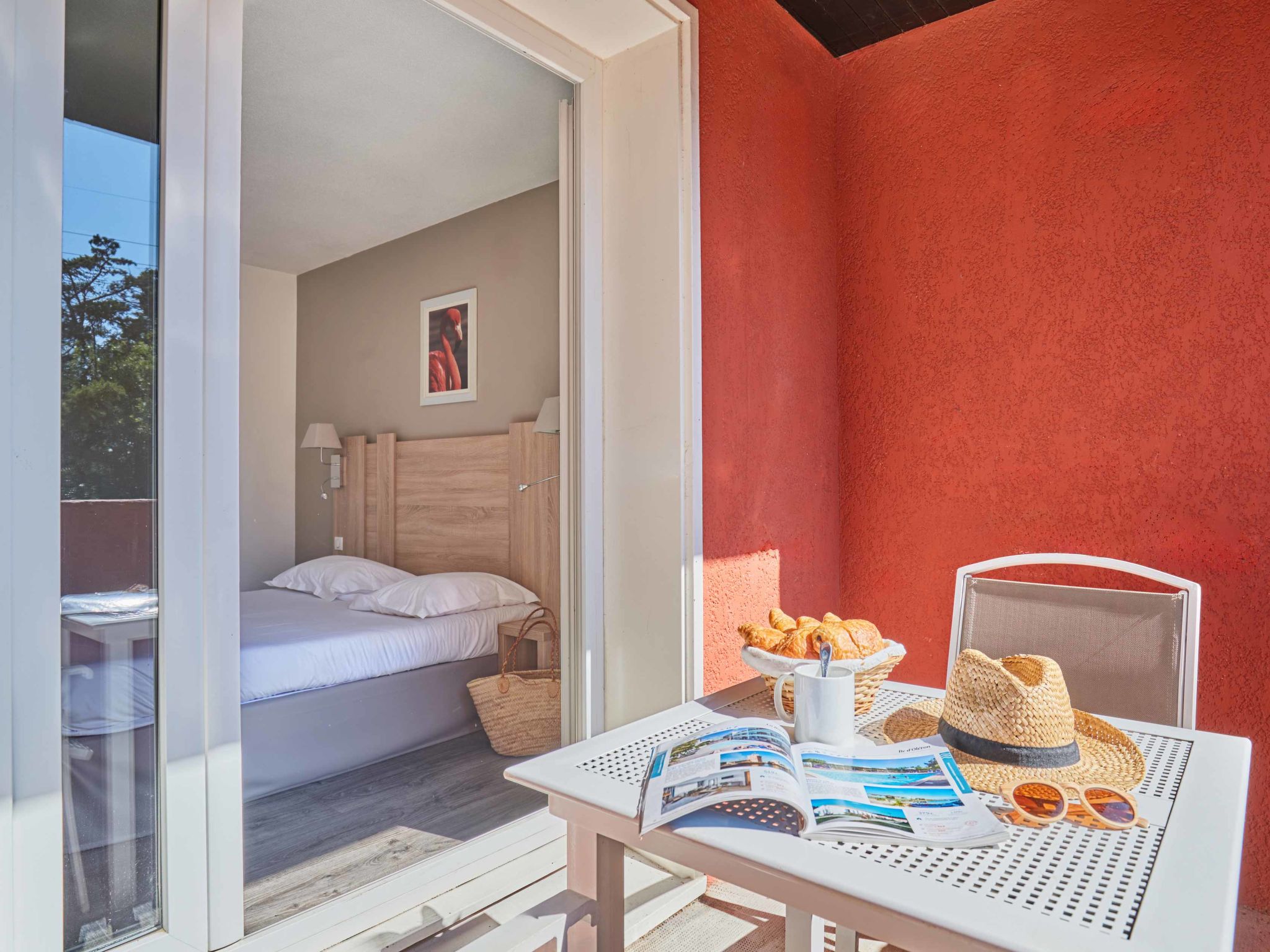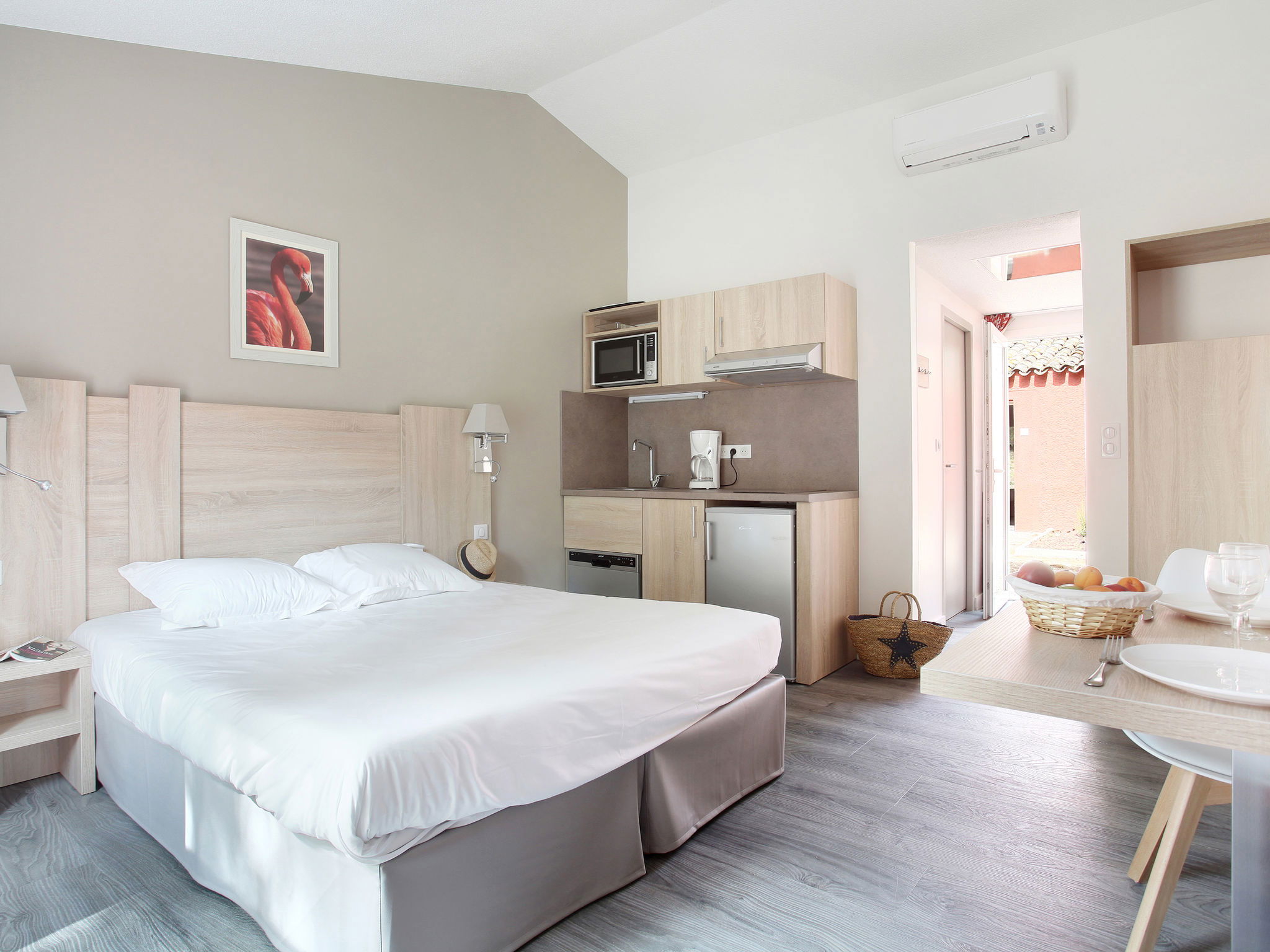 "Résidence Odalys Référence Les Gardians", 1-room studio 25 m2. Renovated in 2017, practical and modern furnishings: living/sleeping room with 2 sleeping facilities, dining table and satellite TV. Entrance hall with 1 bed. Small, open kitchen (dishwasher, 2 ceramic glass hob hotplates, microwave, electric coffee machine). Shower/WC. Heating, air-conditioning. Balcony or terrace. Terrace furniture, balcony furniture. Facilities: children's high chair, baby cot (extra). Internet (WiFi, free). Please note: non-smokers only. Maximum 1 pet/ dog allowed. Smoke alarm, fire extinguisher.
