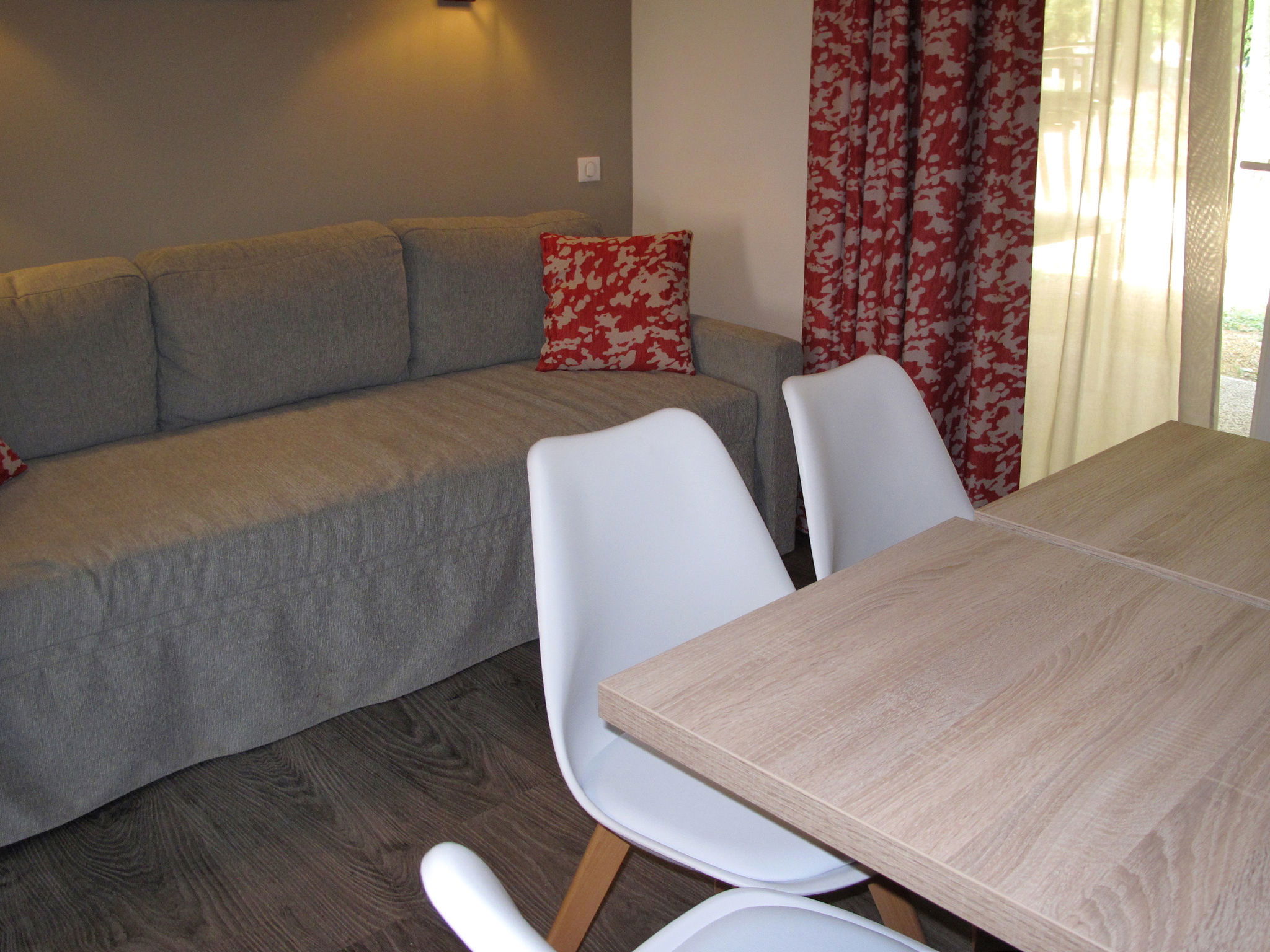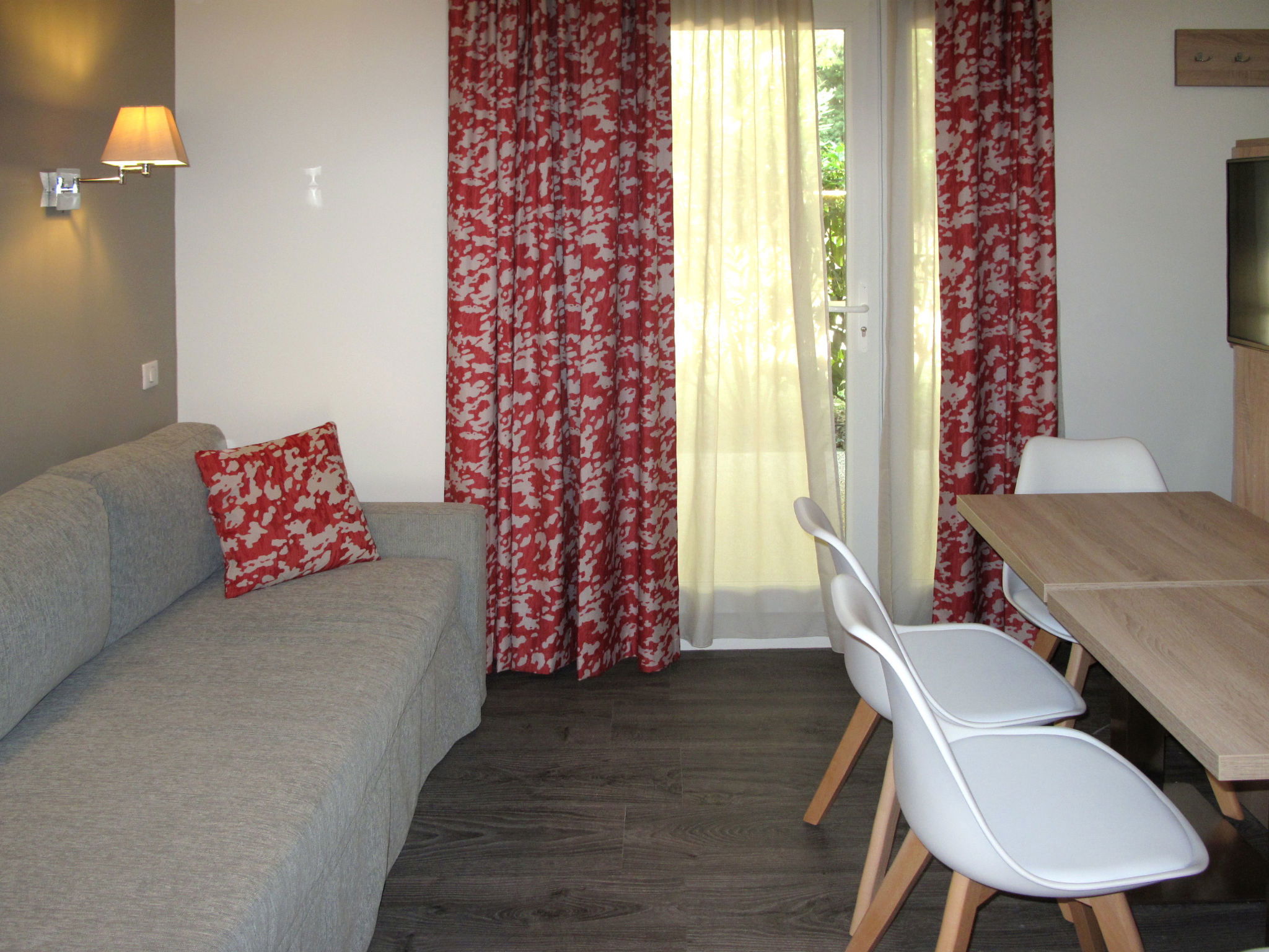 "Résidence Odalys Référence Les Gardians", 3-room apartment 36 m2 on 2 levels. Partly with sloping ceilings, renovated in 2017, practical and modern furnishings: small living/sleeping room with 1 double sofabed, dining table and satellite TV. Exit to the terrace. 1 room with 2 sleeping facilities. Exit to the terrace. Small, open kitchen (dishwasher, 4 ceramic glass hob hotplates, microwave, electric coffee machine). Shower, sep. WC. Upper floor: 1 room with sliding door with 2 sleeping facilities. Shower, sep. WC. Heating, air-conditioning. Balcony or terrace. Terrace furniture, balcony furniture. Facilities: children's high chair, baby cot (extra). Internet (WiFi, free). Please note: non-smokers only. Maximum 1 pet/ dog allowed. Smoke alarm, fire extinguisher. Maximum occupancy: 5 persons.
