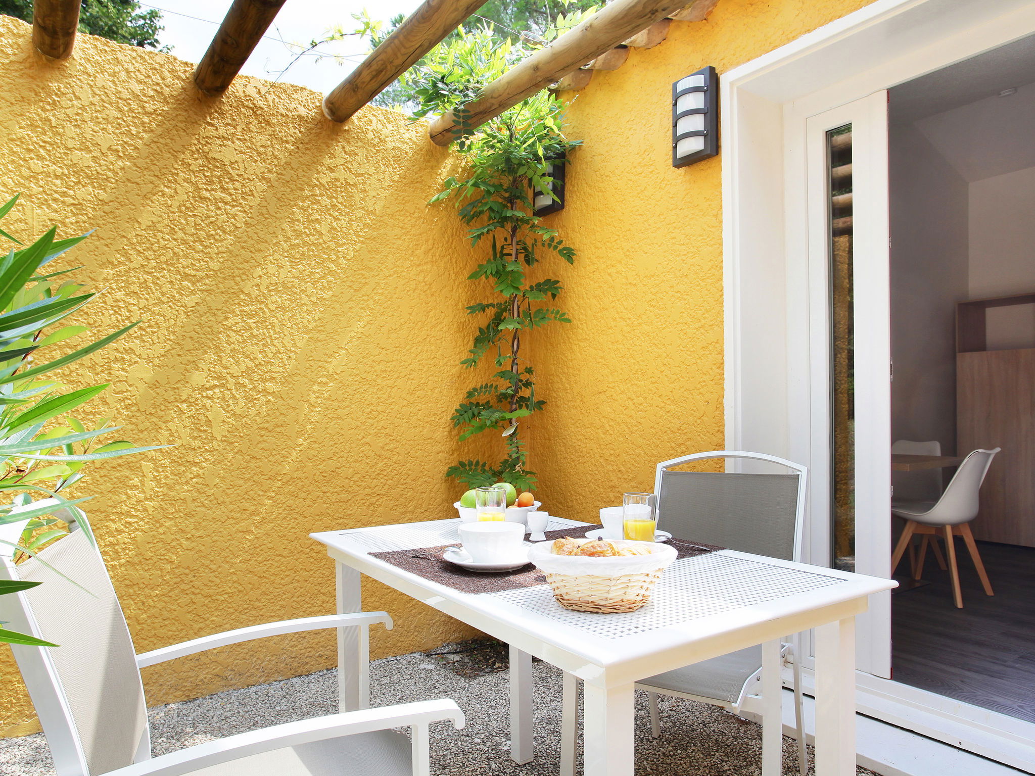 Beautiful resort "Les Gardians". 5 km from the centre of Arles, 34 km from the centre of Nîmes, 80 km from the centre of Montpellier, 37 km from the sea. For shared use: property 35 ha with plants and trees, pond, swimming pool (150 m2, depth 120 - 270 cm, seasonal availability: 15.Apr. - 15.Sep.). Children's pool. In the complex: reception, sauna (extra). Fitness room (extra). Steam room (extra). Washing machine, tumble dryer (for shared use, extra). Parking at 300 m on the premises. Supermarket 4 km, railway station "Avignon" 35 km. Please note: car-free holiday complex. The photograph shows a typical example. The holiday properties may differ in living space, floorplan, equipment and furnishing.