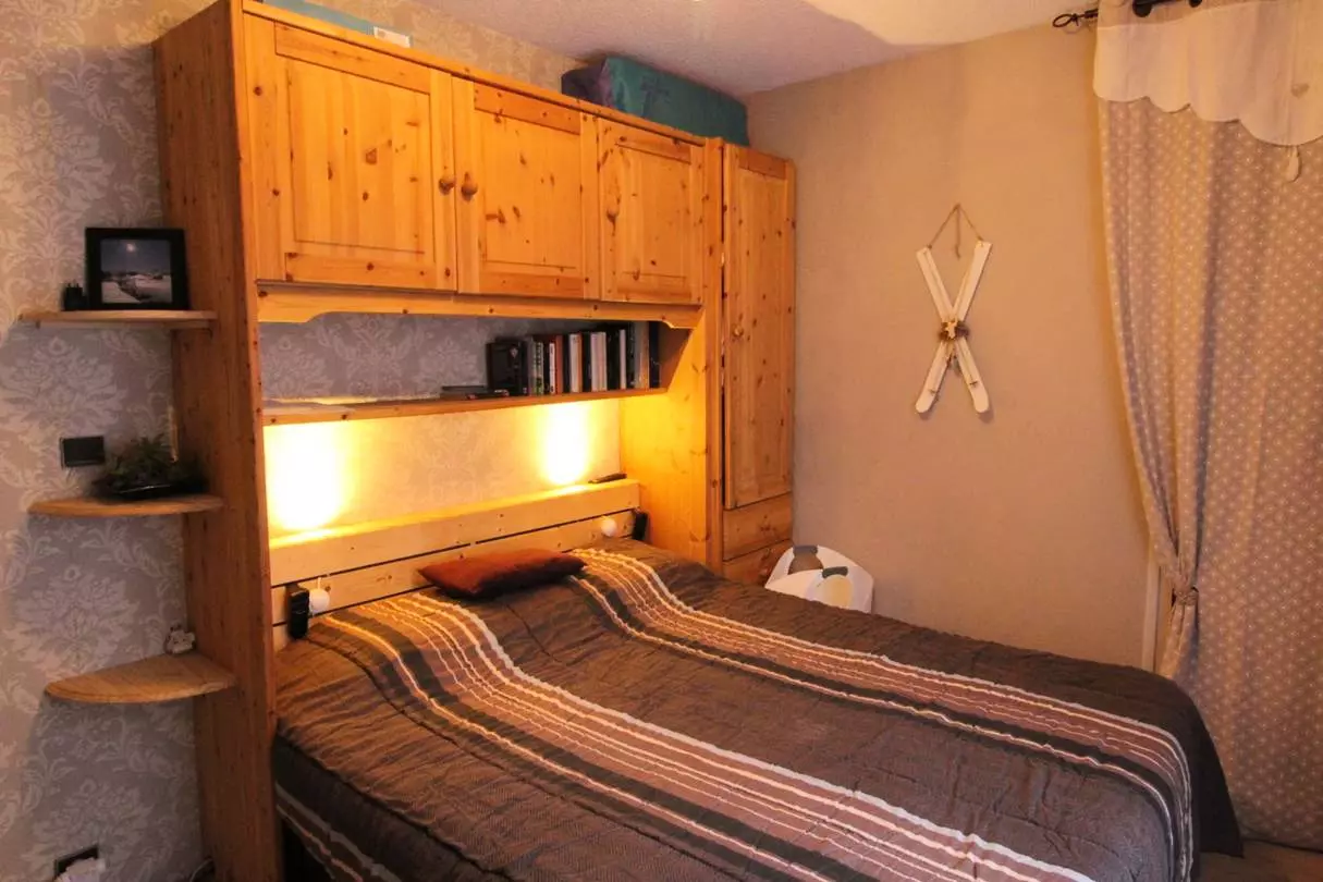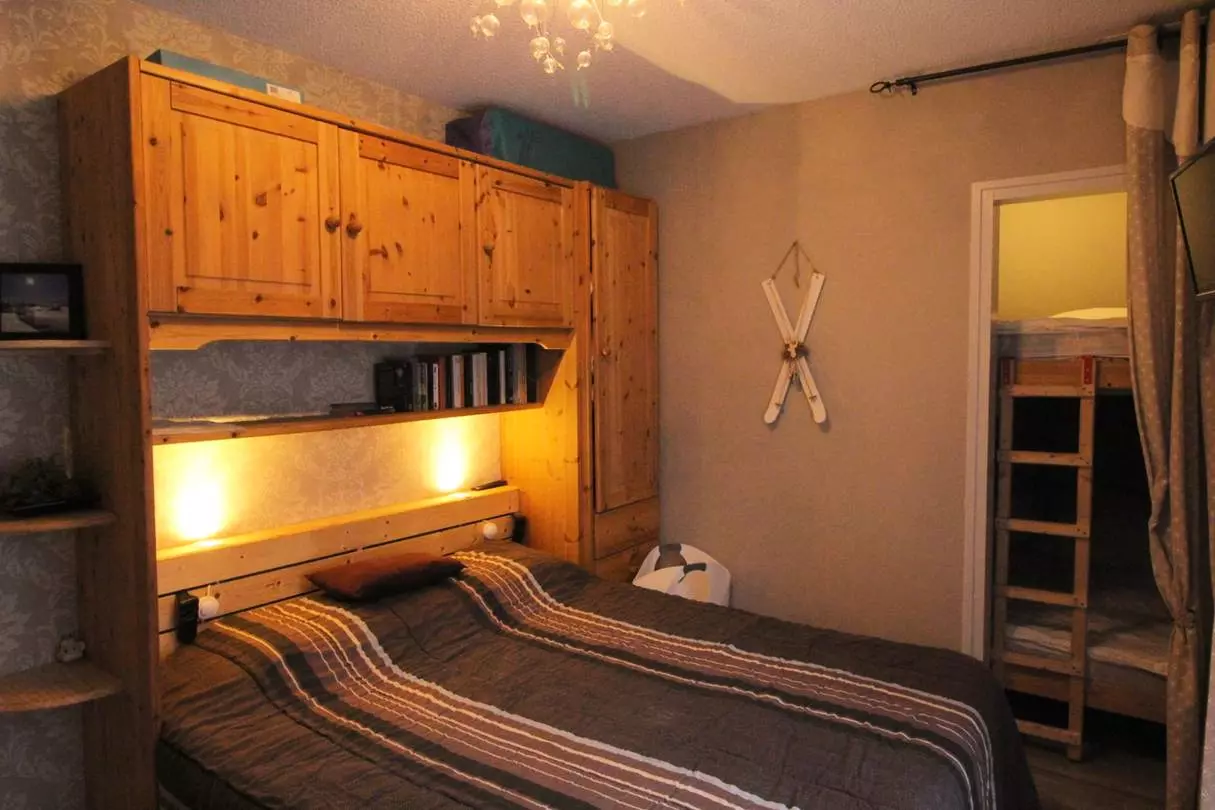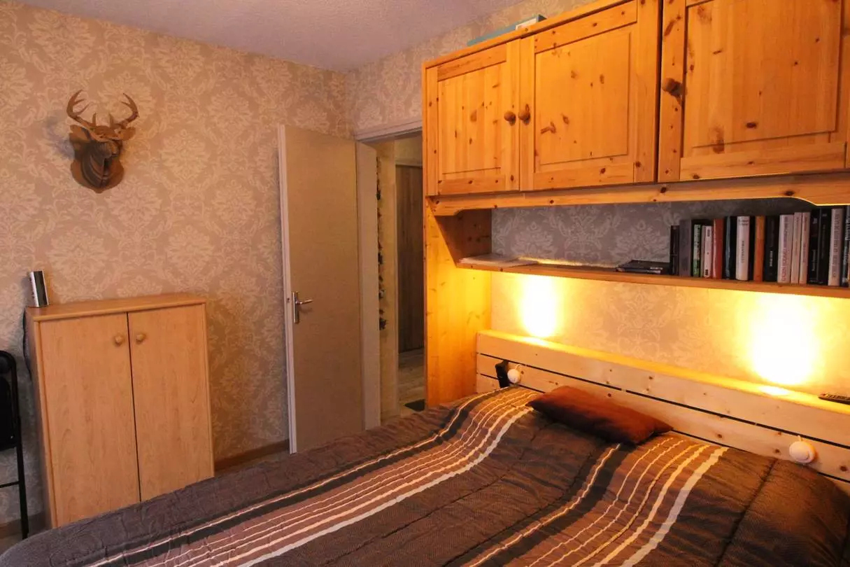 This two-room apartment with a sleeping alcove features an entrance hall with two built-in wardrobes, a separate toilet, a shower room, and an east-facing living room with a comfortable double sofa bed, television, and triple glazing. The fully equipped kitchen faces west and includes an oven, microwave, washing machine, dishwasher, filter coffee maker, Dolce Gusto coffee machine, kettle, toaster, raclette and fondue set, fridge-freezer, and television. There is also a west-facing bedroom with a queen-size bed and a television. From this bedroom, there is access to a sleeping alcove with two bunk beds, suitable only for children.
