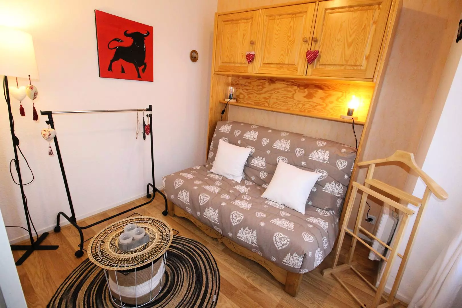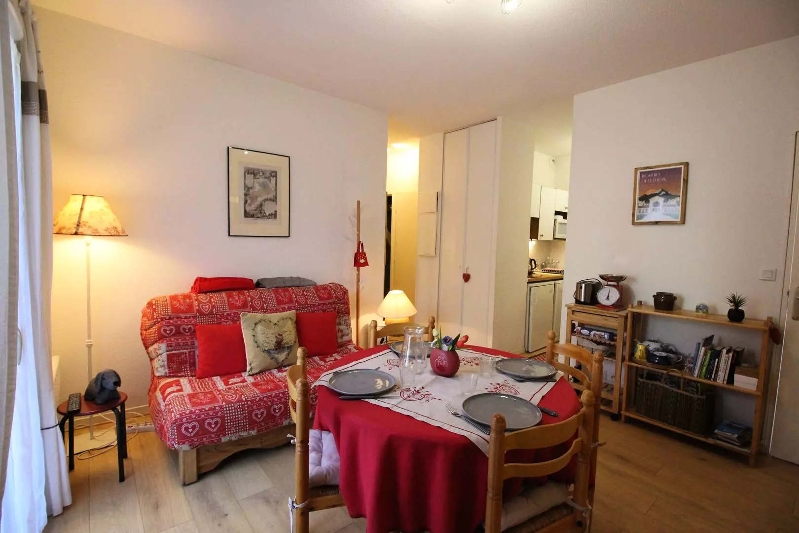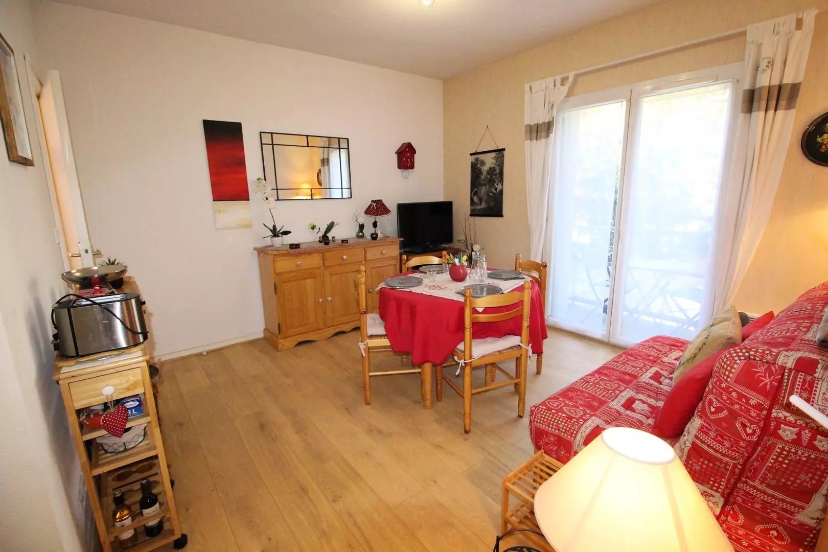 Entrance hall, separate WC, bathroom, north-facing living room with sofa, television and equipped kitchenette (microwave, mini-oven, kettle, toaster, Senseo coffee machine, dishwasher...). One bedroom with a double bed (140cm), bedside table and wardrobe, another bedroom with a double sofa bed and cupboard. Washing machine.