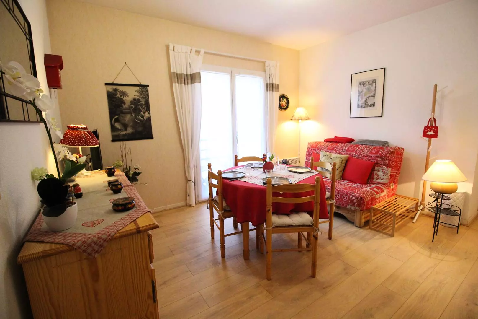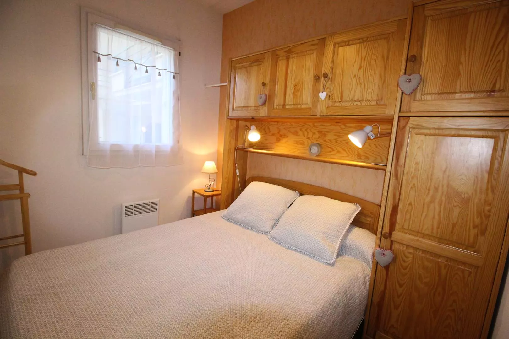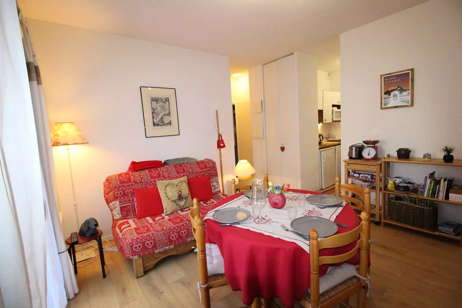 Entrance hall, separate WC, bathroom, north-facing living room with sofa, television and equipped kitchenette (microwave, mini-oven, kettle, toaster, Senseo coffee machine, dishwasher...). One bedroom with a double bed (140cm), bedside table and wardrobe, another bedroom with a double sofa bed and cupboard. Washing machine.
