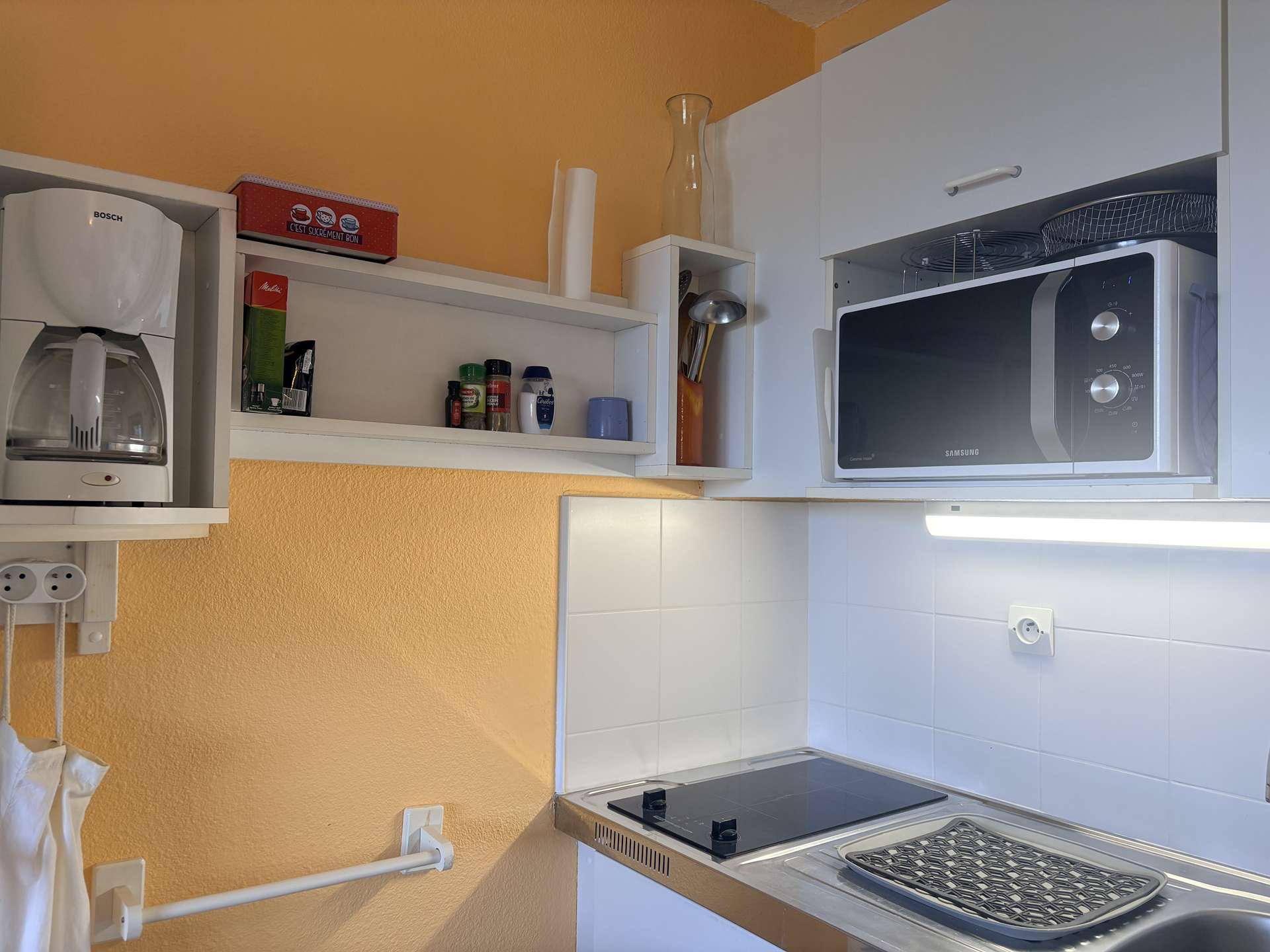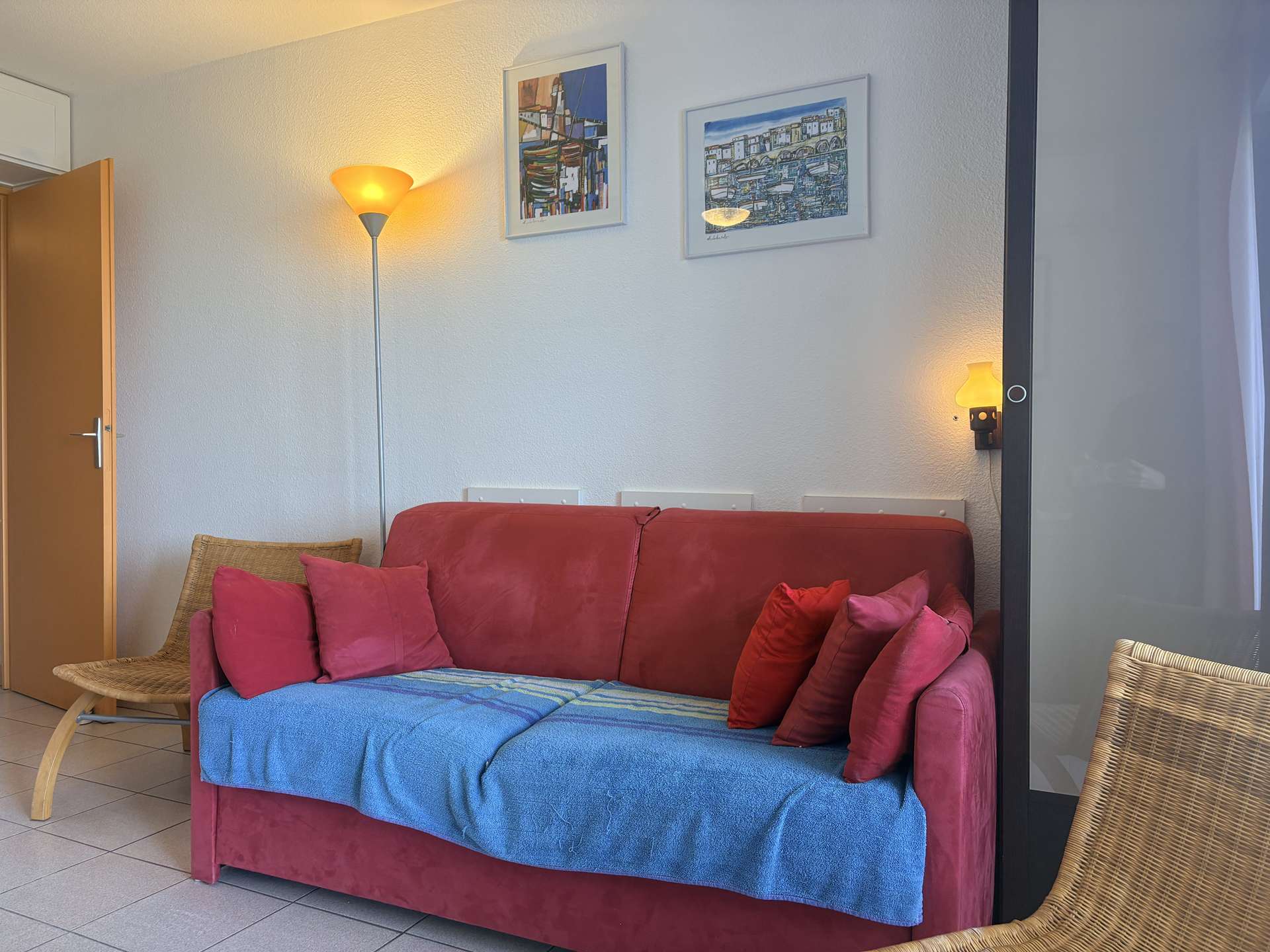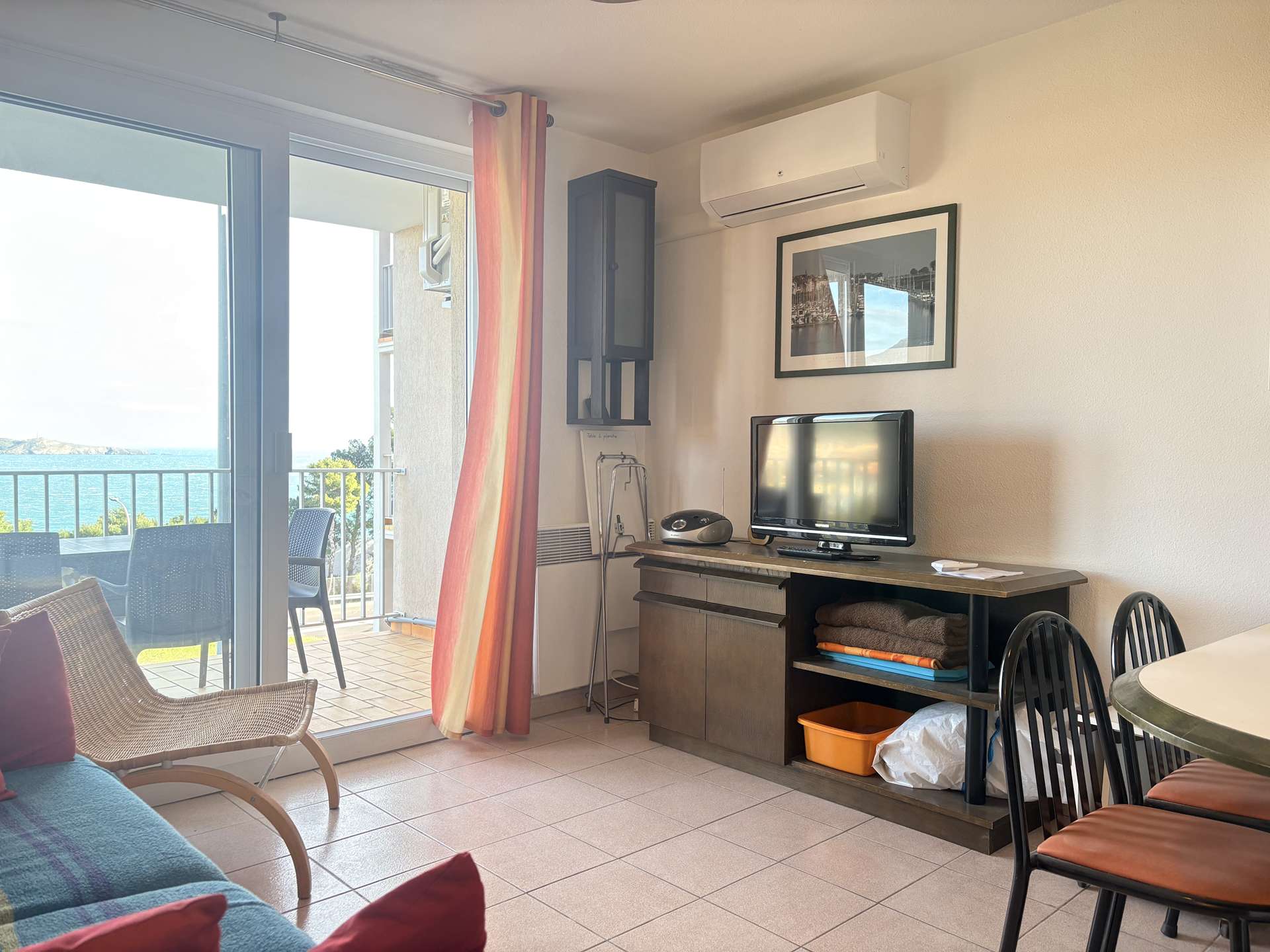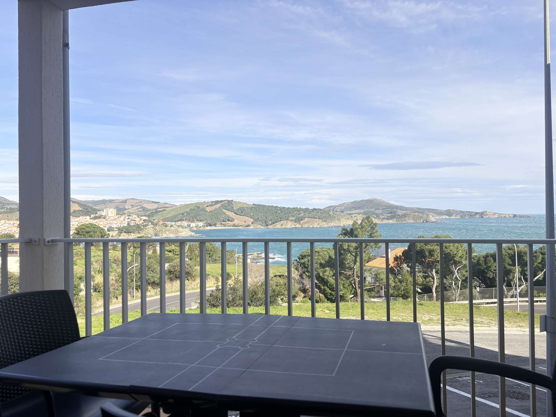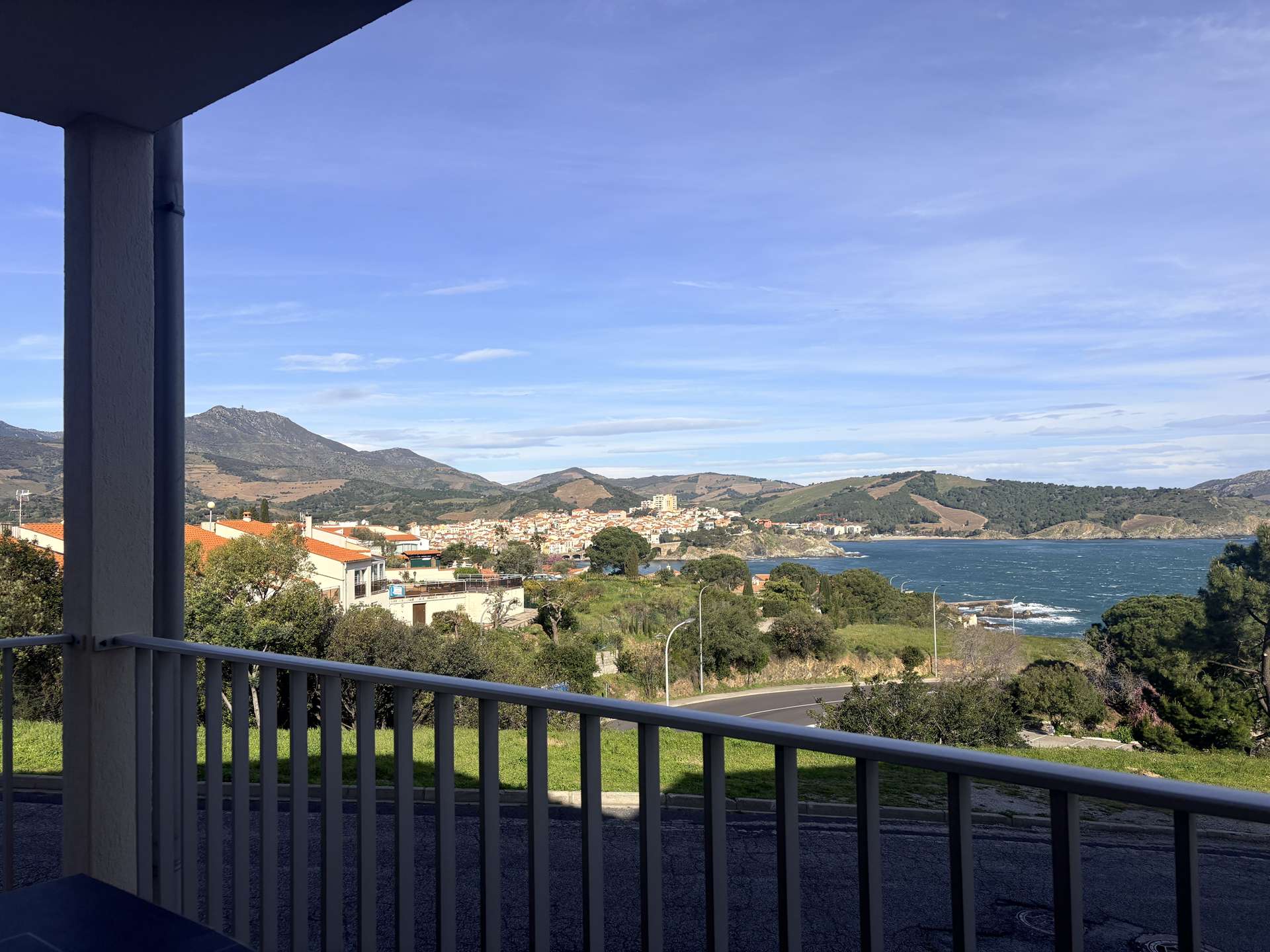 This holiday apartment, located on the 1st floor, consists of a living room with a sofa bed for 2 people, an equipped kitchenette, 1 bedroom with two single beds, a shower room and separate WC, a loggia with panoramic views of the bay of Banyuls.