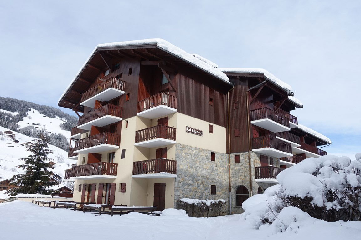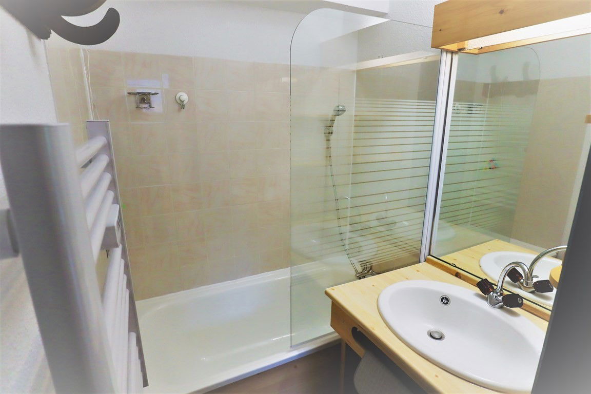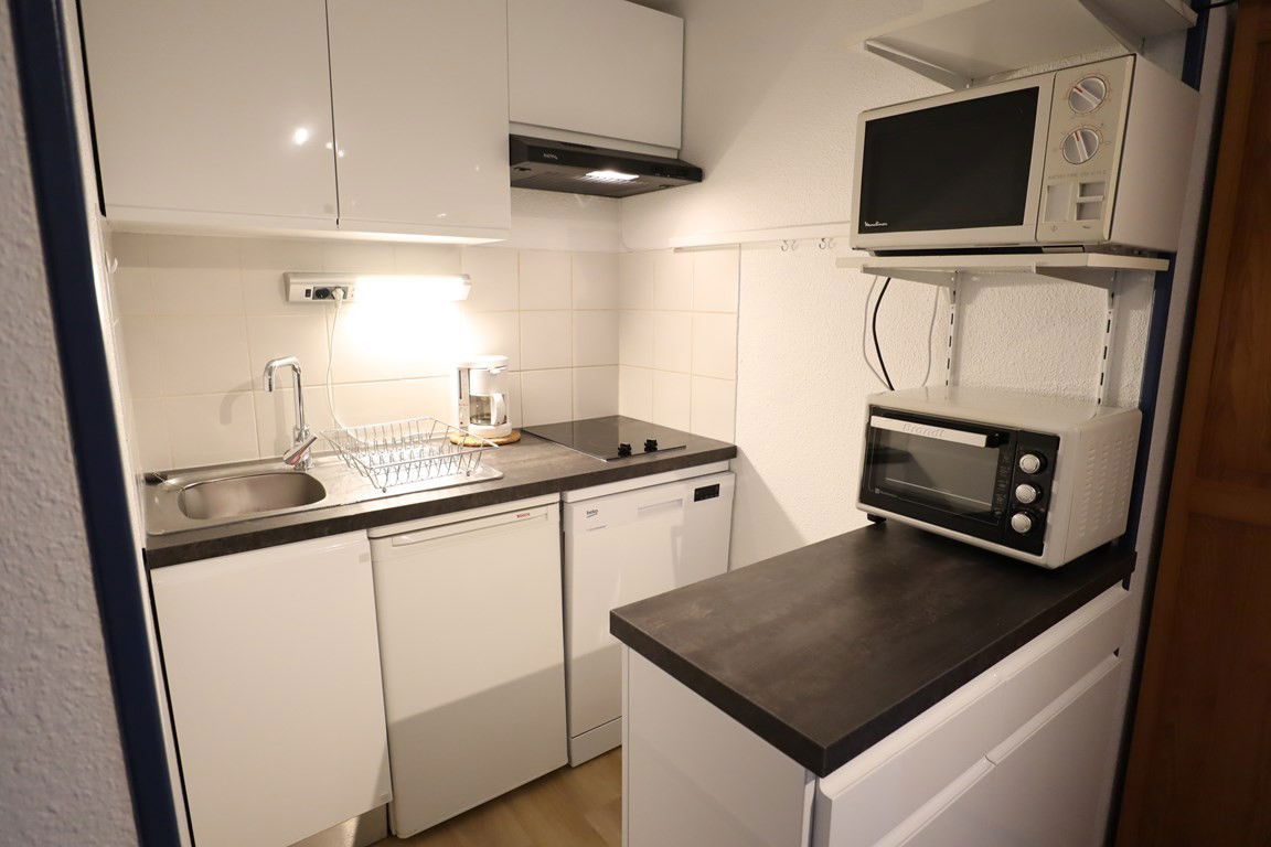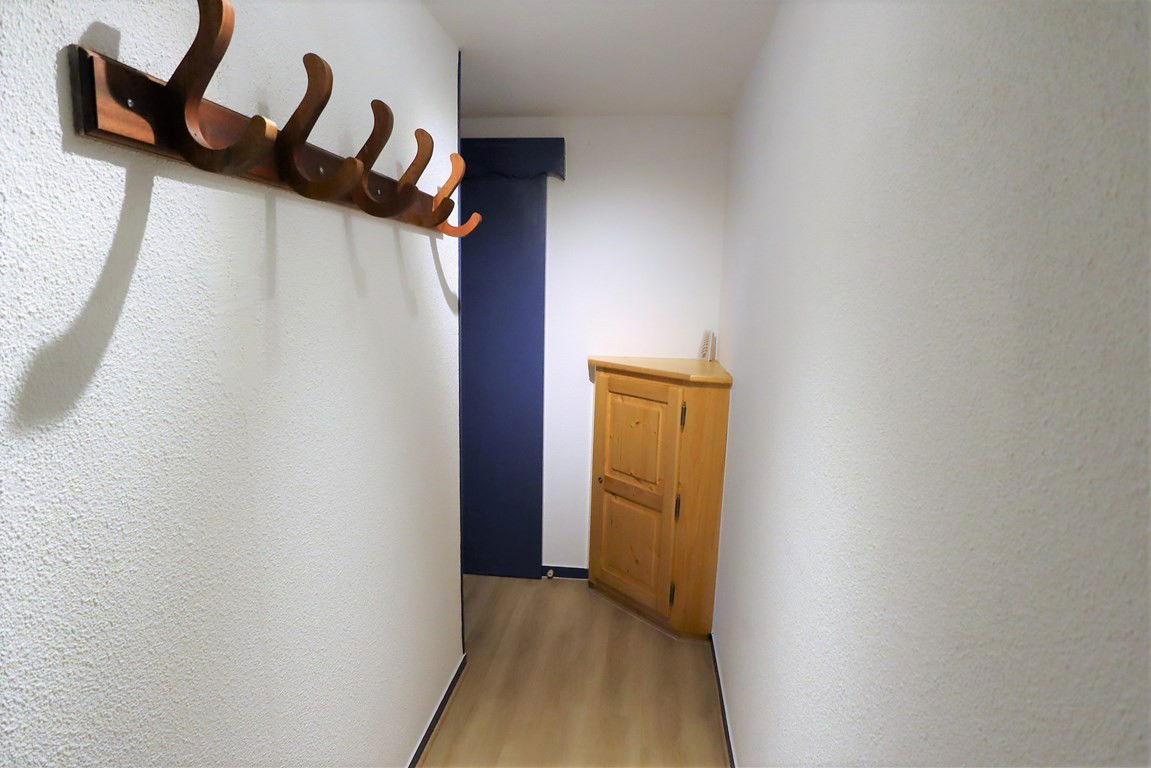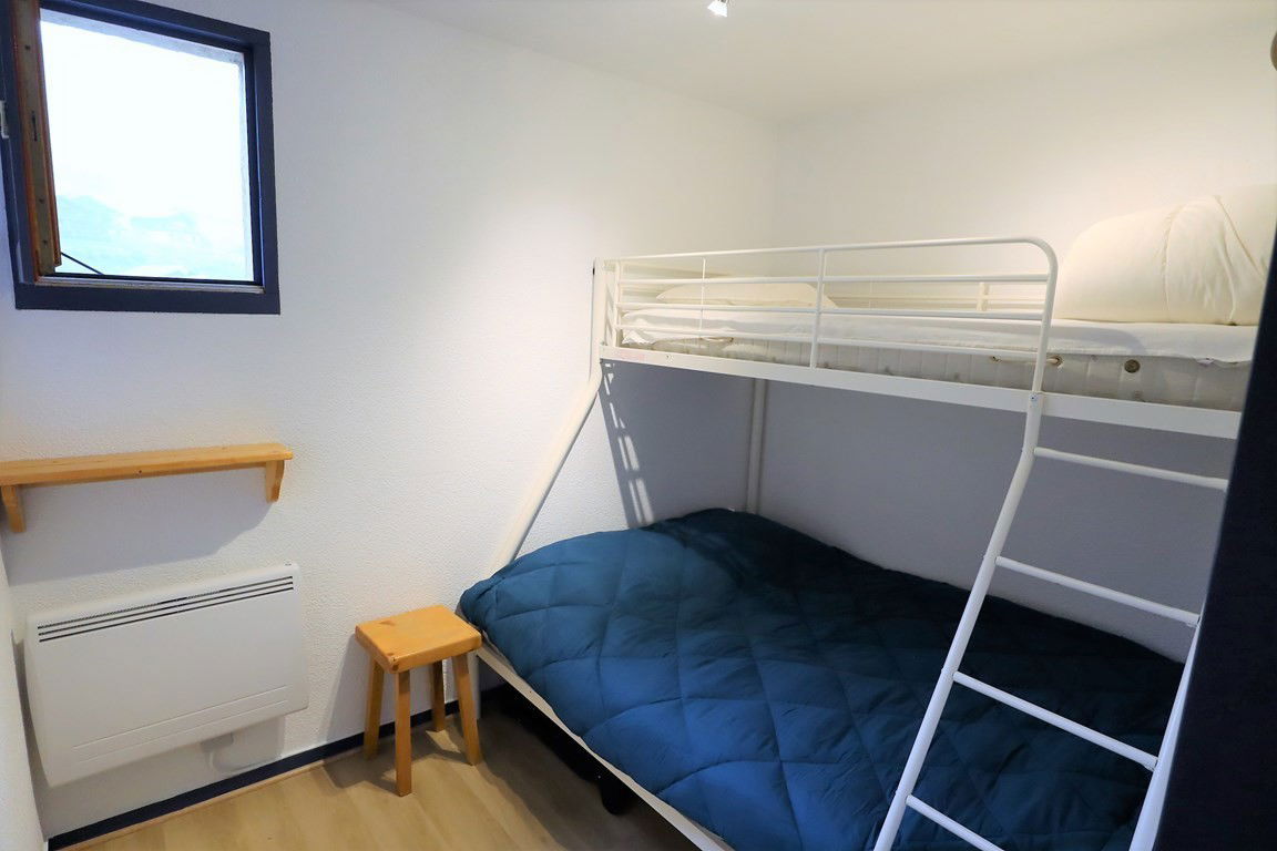 South-facing, very functional 27 m² apartment with balcony – 1st floor with elevator – ideal location within walking distance to the ski slopes and village – Val Blanc II residence of 70 apartments with shared swimming pool in summer* – Entrance – living room with 2-person sofa bed – equipped kitchenette (dishwasher) – small closed bedroom with 1 double bed and 1 single bed above – TV. Children welcome (cot available).
