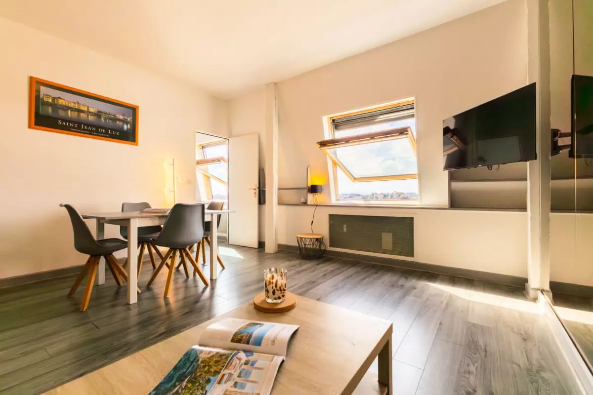 The living room opens onto a pleasant balcony bathed in light with a breathtaking view of the city of Biarritz and the beaches.