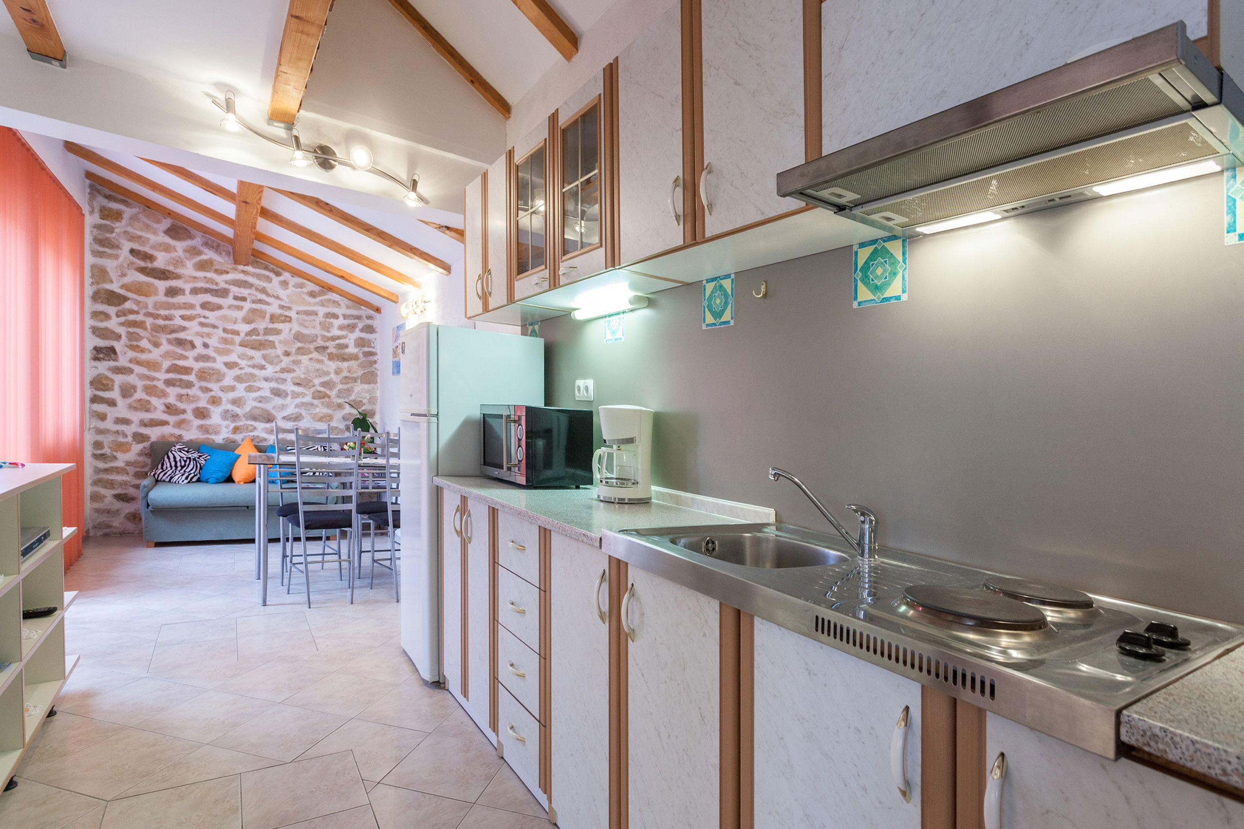 The rustic Oldtown apartment Apola 2 is located in the very center of Bibinje, just 6 km from the tourist town of Zadar. The apartment is only 100 meters from the Punta Rožica beach, where you can enjoy swimming and diving with your family and friends. This beach also offers natural shade, a concrete sunbathing area, and sunshades. The apartment is located in the middle of a peninsula and is surrounded by the sea on 3 sides. The nearest entrance to the sea is only 30 meters from the apartment. It is located in quiet street with no traffic, making it safe for children. All necessary amenities are located nearby and in the pedestrian zone: restaurants, cafes, a clinic, a shop, an ATM, etc. Oldtown apartment Apola 2 is located on the floor, and below it is apartment Apola 1. What makes them special is the fact that they can also be rented together as the Heritage House Apola complex. This is an excellent opportunity if you are traveling with a larger group of guests. Apartment Apola 2 has 50 m2 of living space, air conditioning and WiFi. It can accommodate a maximum of 4 people, who will be accommodated in 2 bedrooms with a double bed. The dimensions of the double bed are 140x200. There is also a satellite TV in the living room. You can use the bathroom with a shower. The kitchen is equipped with everything you need to prepare your favorite meals for the whole family. The dining room has a dining table with 4 seats.