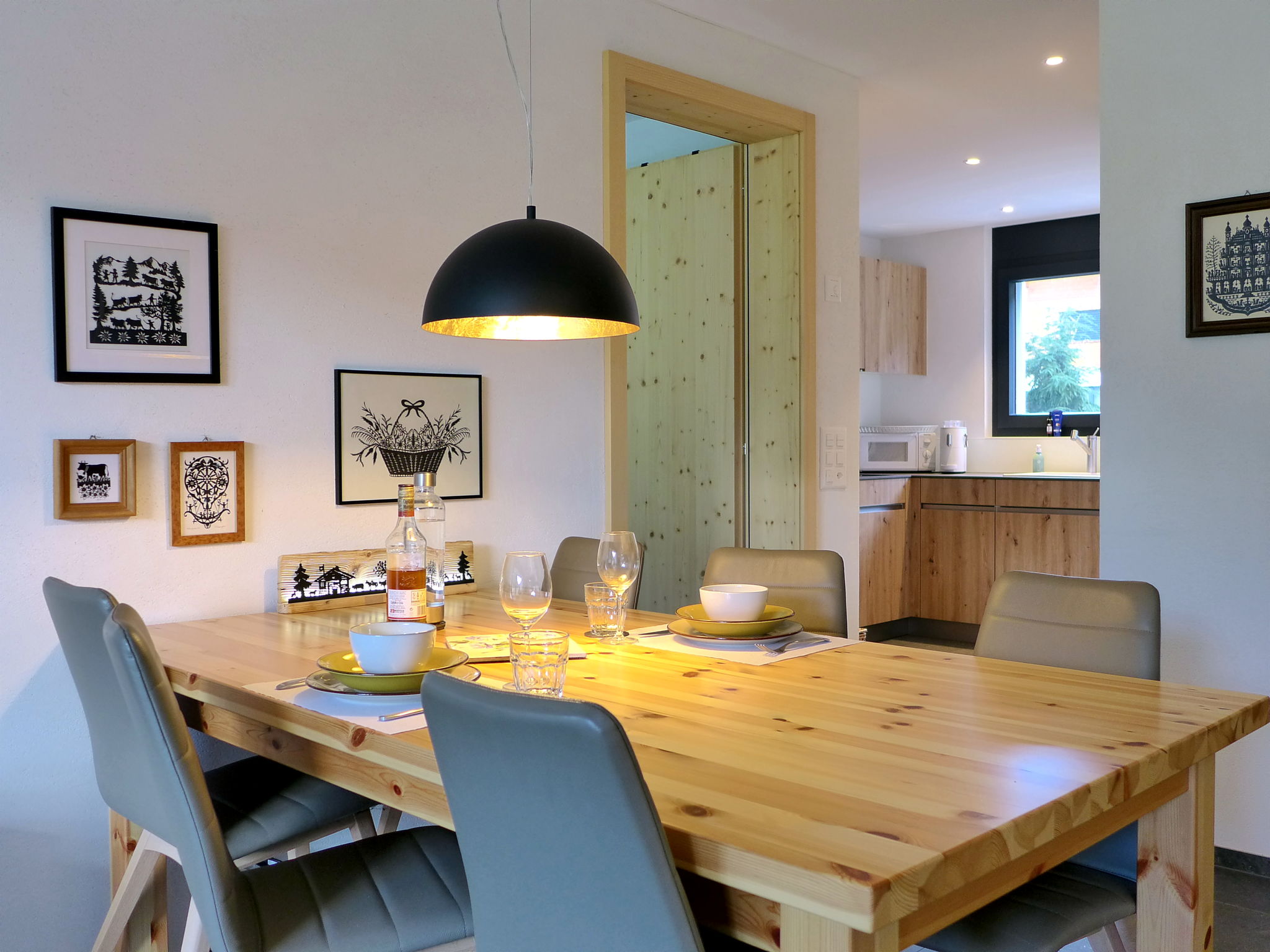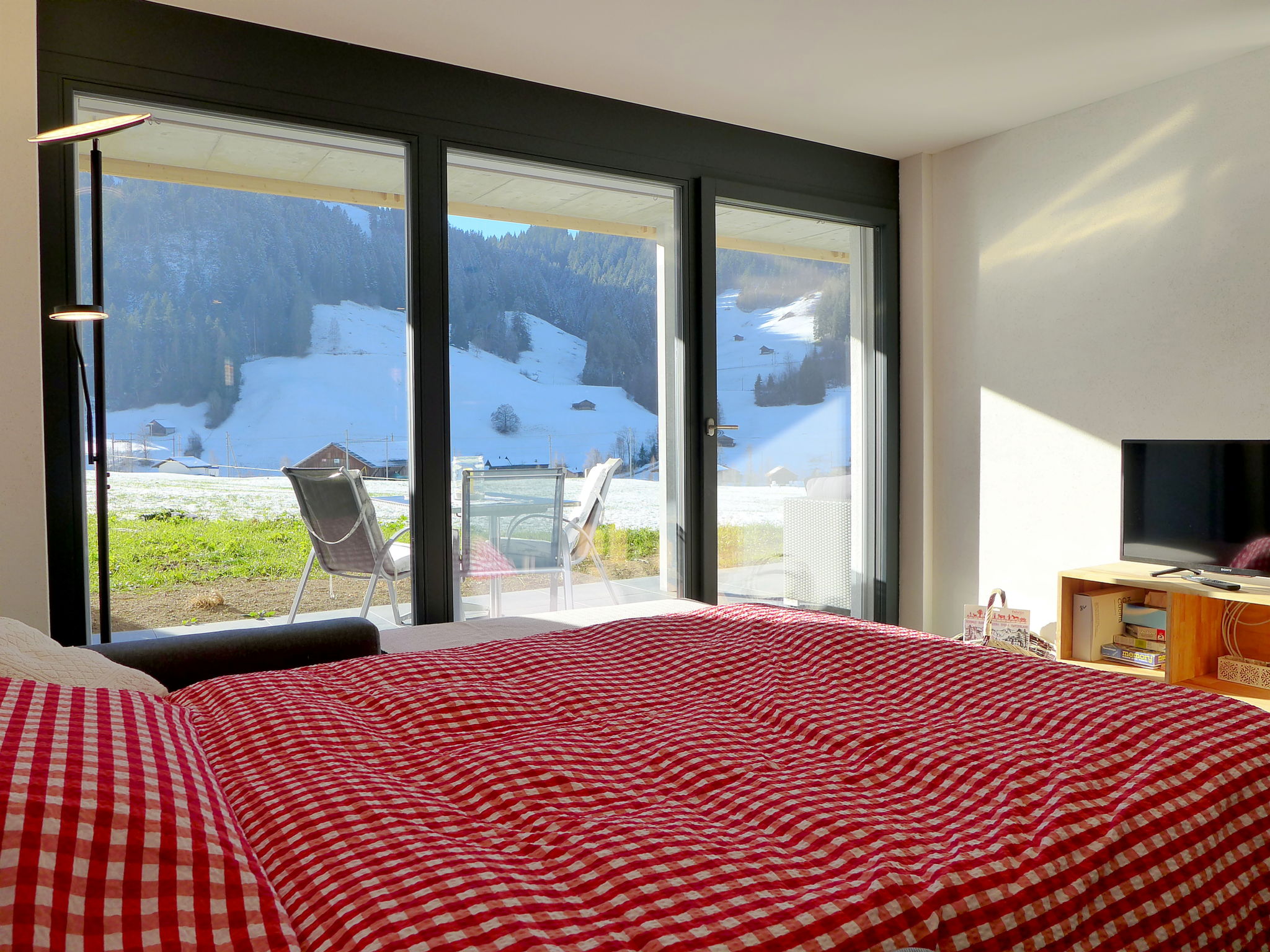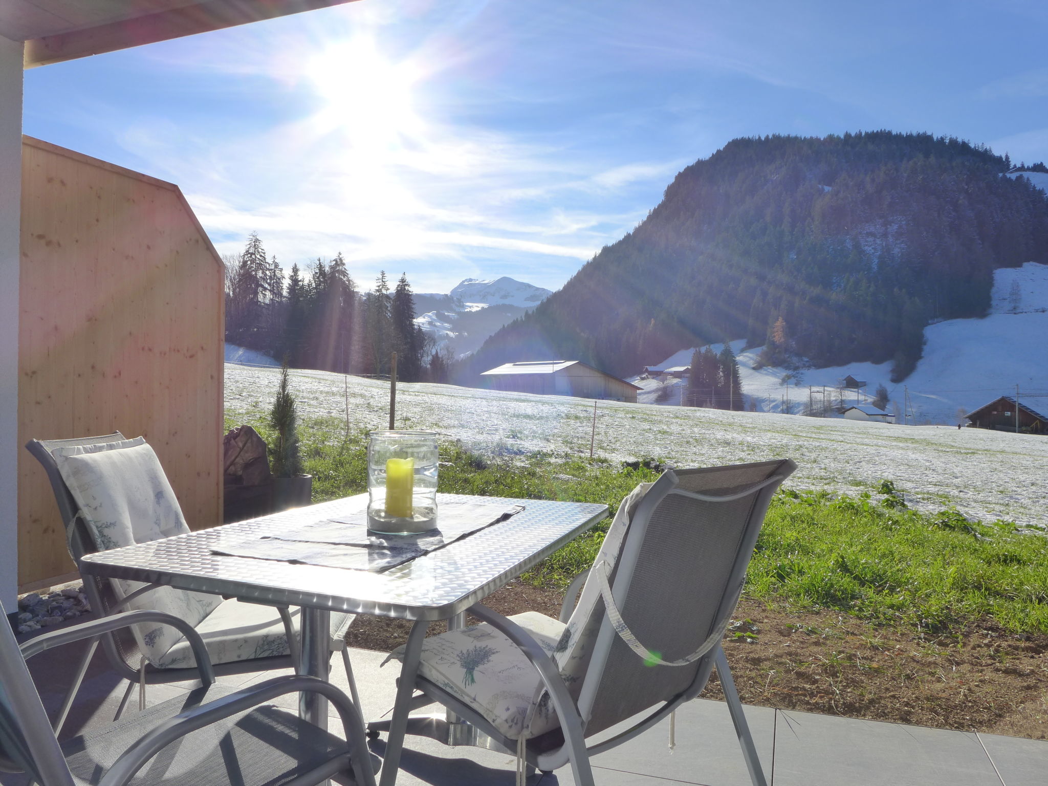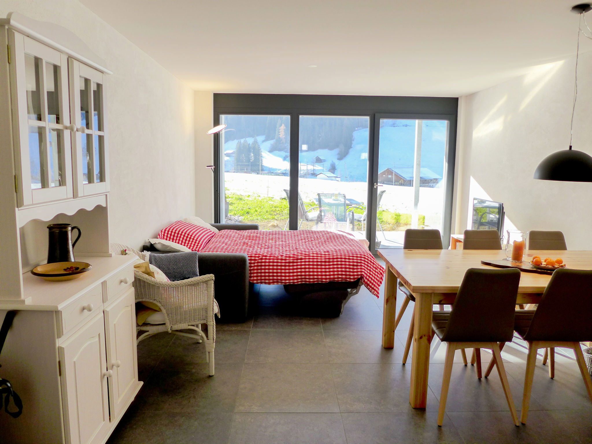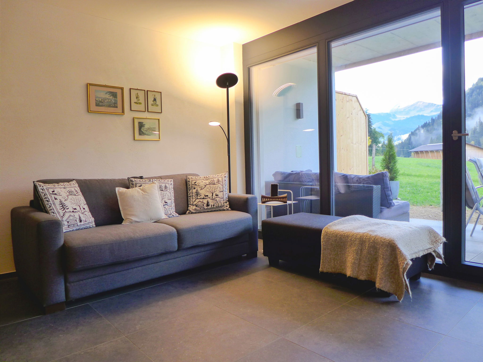 "Greenview", 2-room apartment 62 m2, on the ground floor, south-west facing position. Spacious and bright, very comfortable and cosy furnishings: open living/sleeping room with 1 sofabed, dining table and cable TV. Exit to the terrace. 1 room with 1 double bed (2 x 90 cm, length 200 cm), shower/WC. Exit to the terrace. Open kitchen (oven, dishwasher, 4 induction hot plates, toaster, kettle, microwave, electric coffee machine, Capsules for coffee machine (Nespresso) extra, raclette grill, fondue Set (cheese)). Shower/WC. Solar energy heating, underfloor heating. Solar power. Large terrace. Terrace furniture. Marvellous view of the mountains and the countryside. Facilities: Internet (WiFi, free). Parking (roofed, 1 car). E-charging station. Please note: non-smokers only. 1 small pet/ dog allowed.