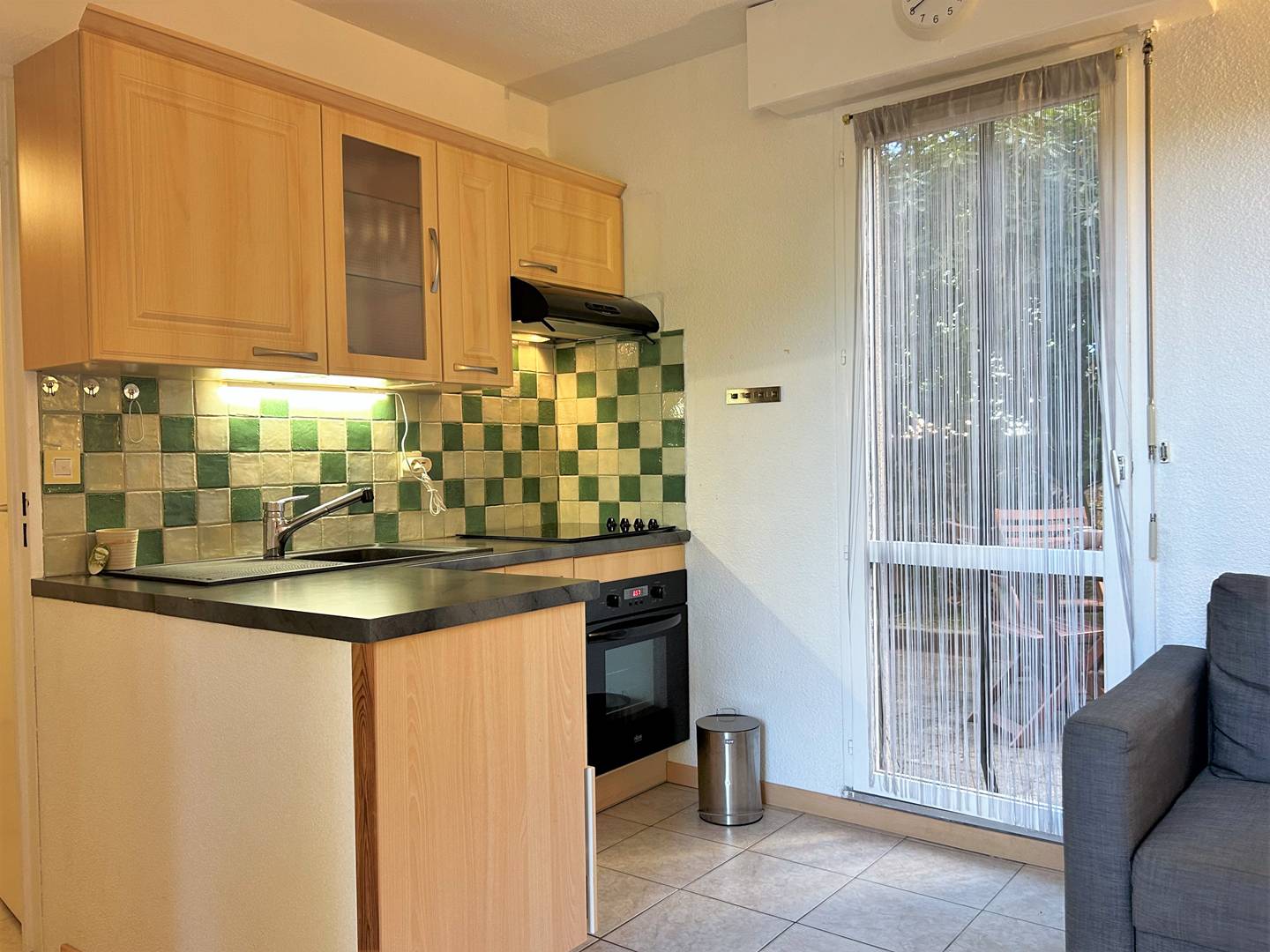 This holiday rental on the ground floor consists of a North-East terrace and a garden of approximately 24m², a living room with 140 cm sofa bed, a kitchen open to the living room, a bedroom with a 140cm bed, a bathroom and a separate toilet.