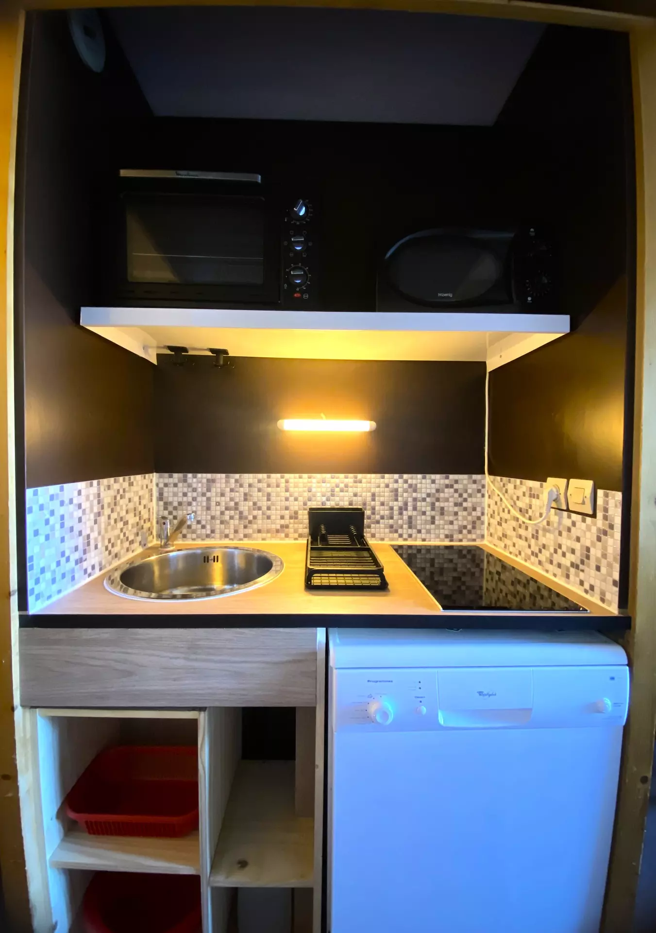 It is equipped with electric hobs, an oven, a microwave, a dishwasher and a refrigerator.