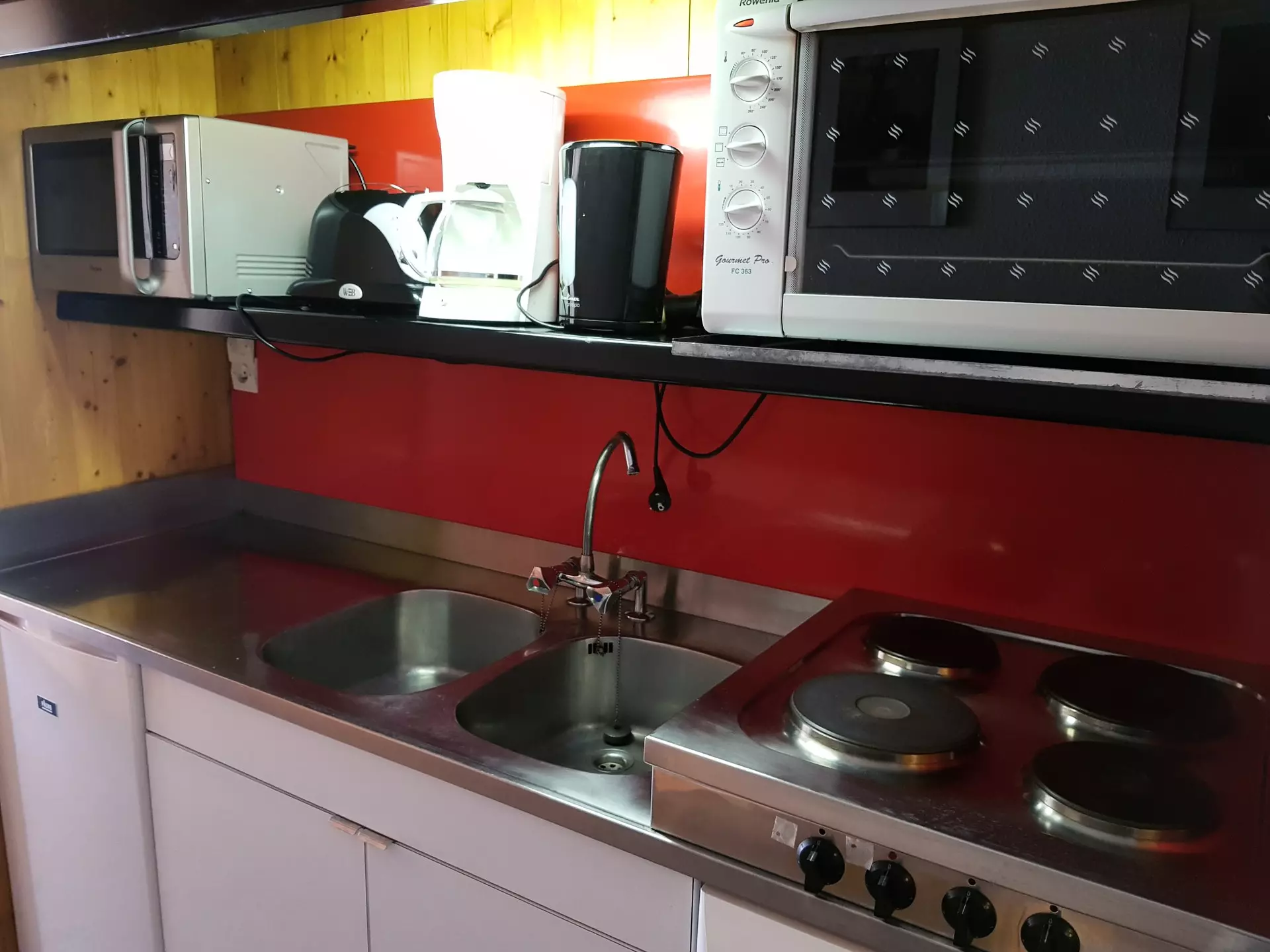 It is equipped with ceramic hobs, an oven, a microwave, a dishwasher and a refrigerator.