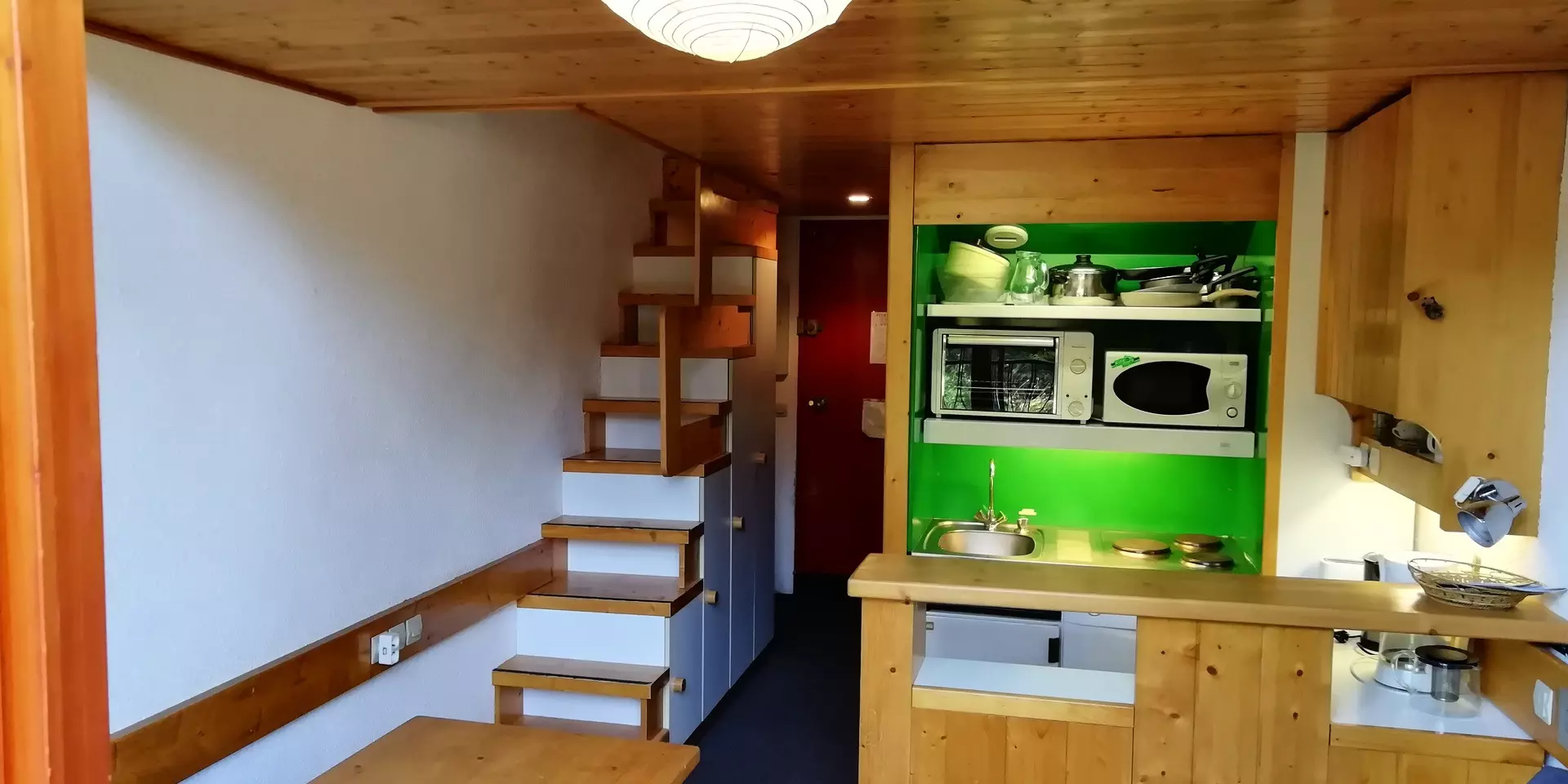 On the mezzanine there is a bedroom with a 140 cm double bed and a mountain corner with a set of 80 cm bunk beds.