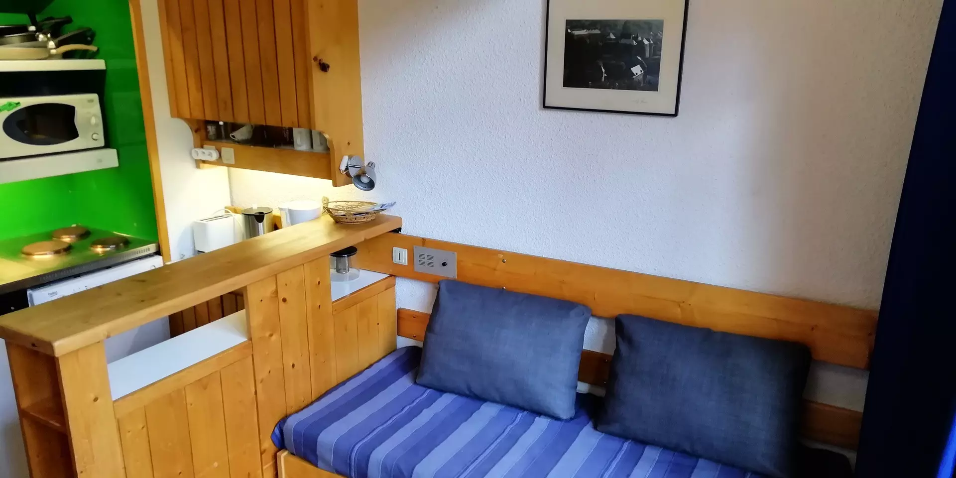 In the living room there is a single sofa bed of 80 cm.