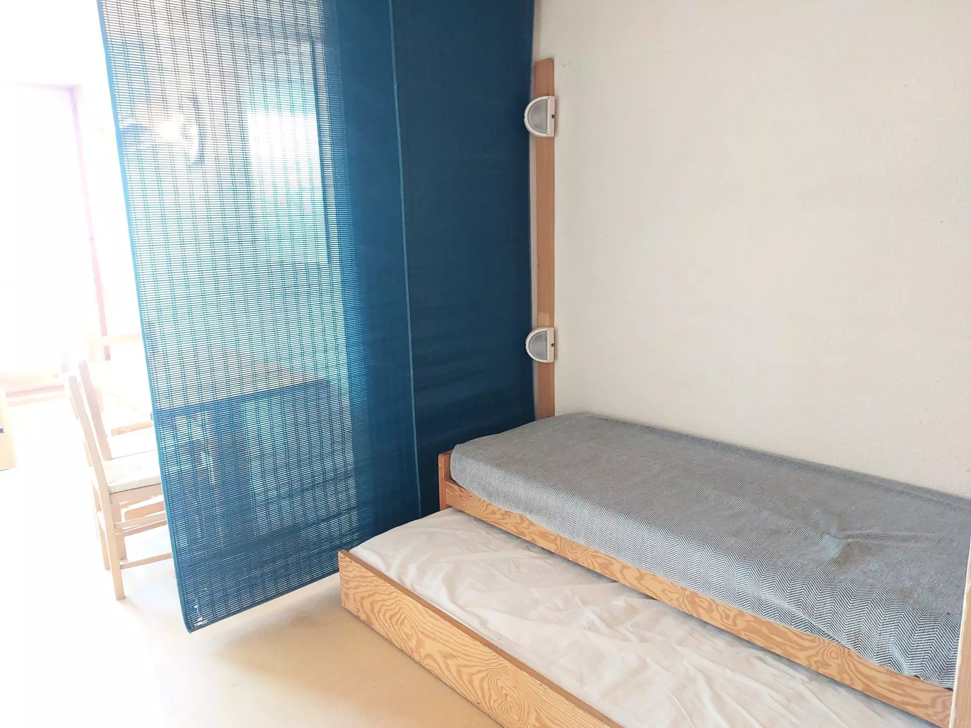 In the living room there is a single bed and a trundle bed.
