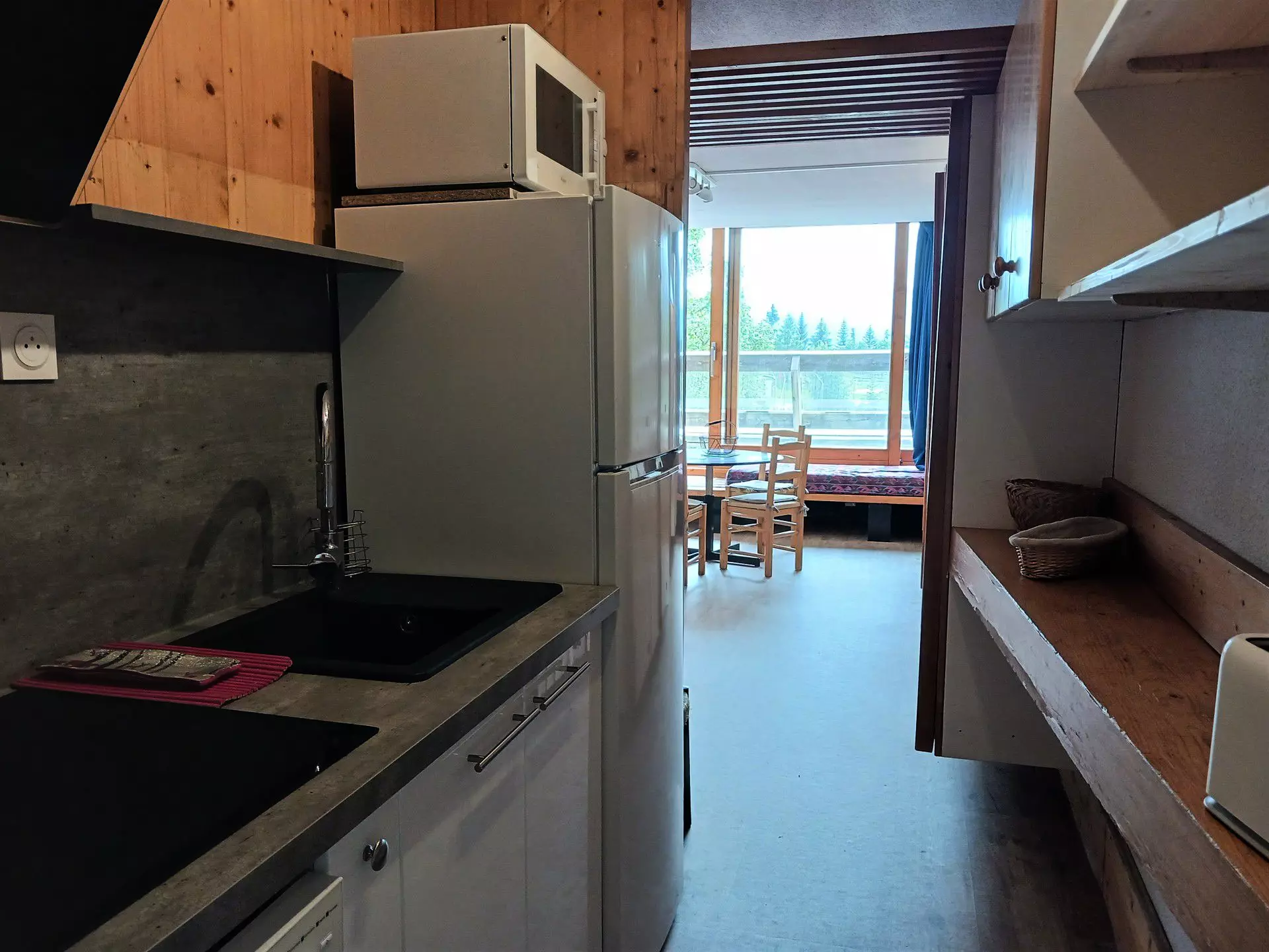 It is equipped with induction hobs, a combined oven/microwave, a dishwasher and a refrigerator.