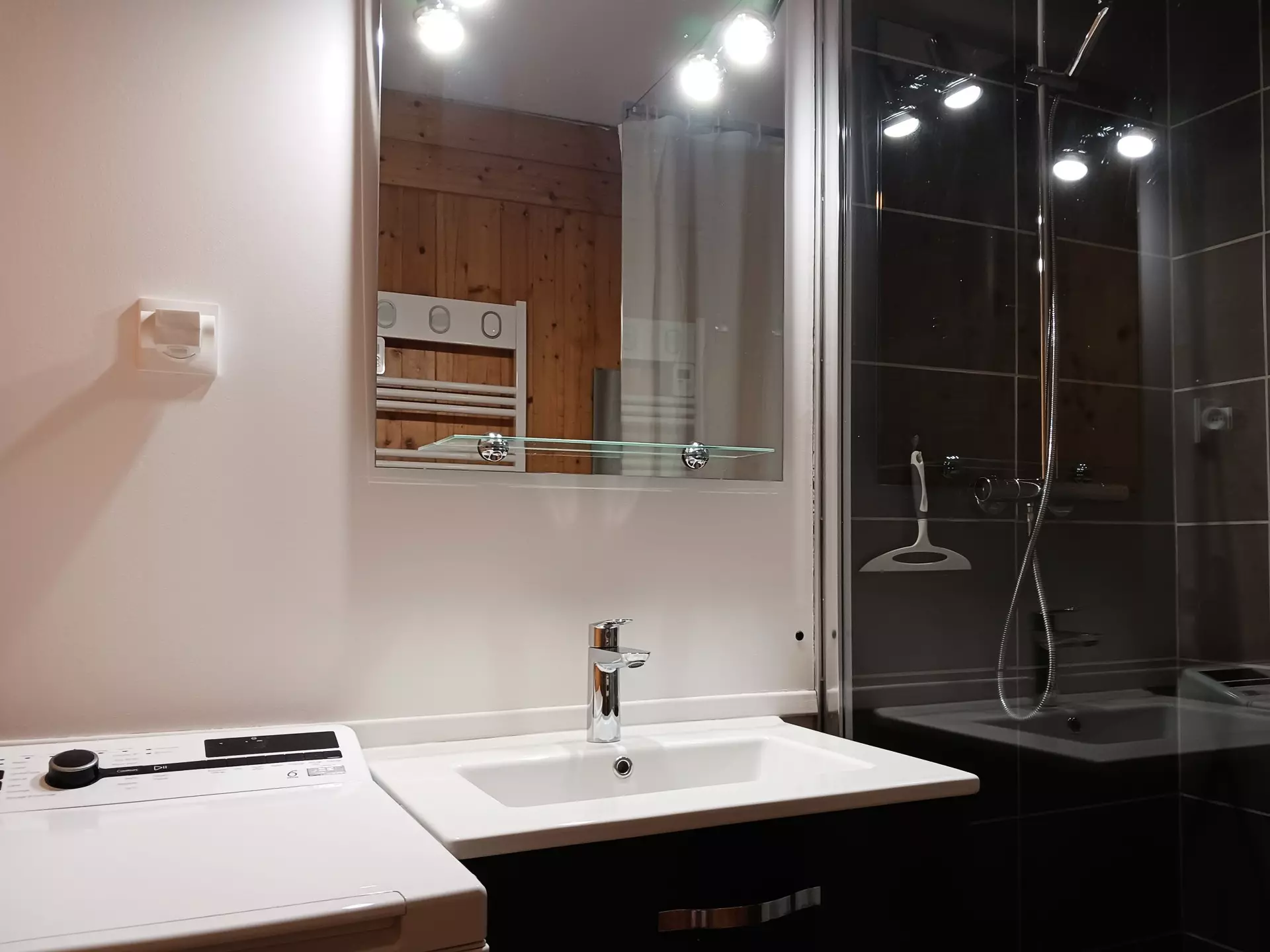 A television, a washing machine, and a ski locker. Wi-Fi access
